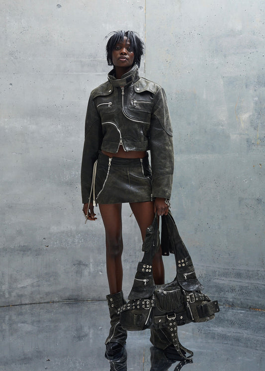 SNAKE ZIP USED LEATHER GREEN SKIRT