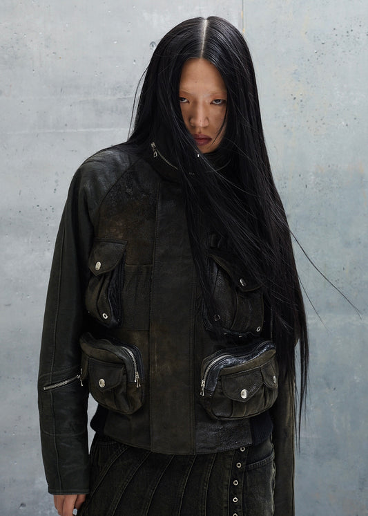 MULTIPOCKET 3D USED GREEN LEATHER JACKET UNISEX