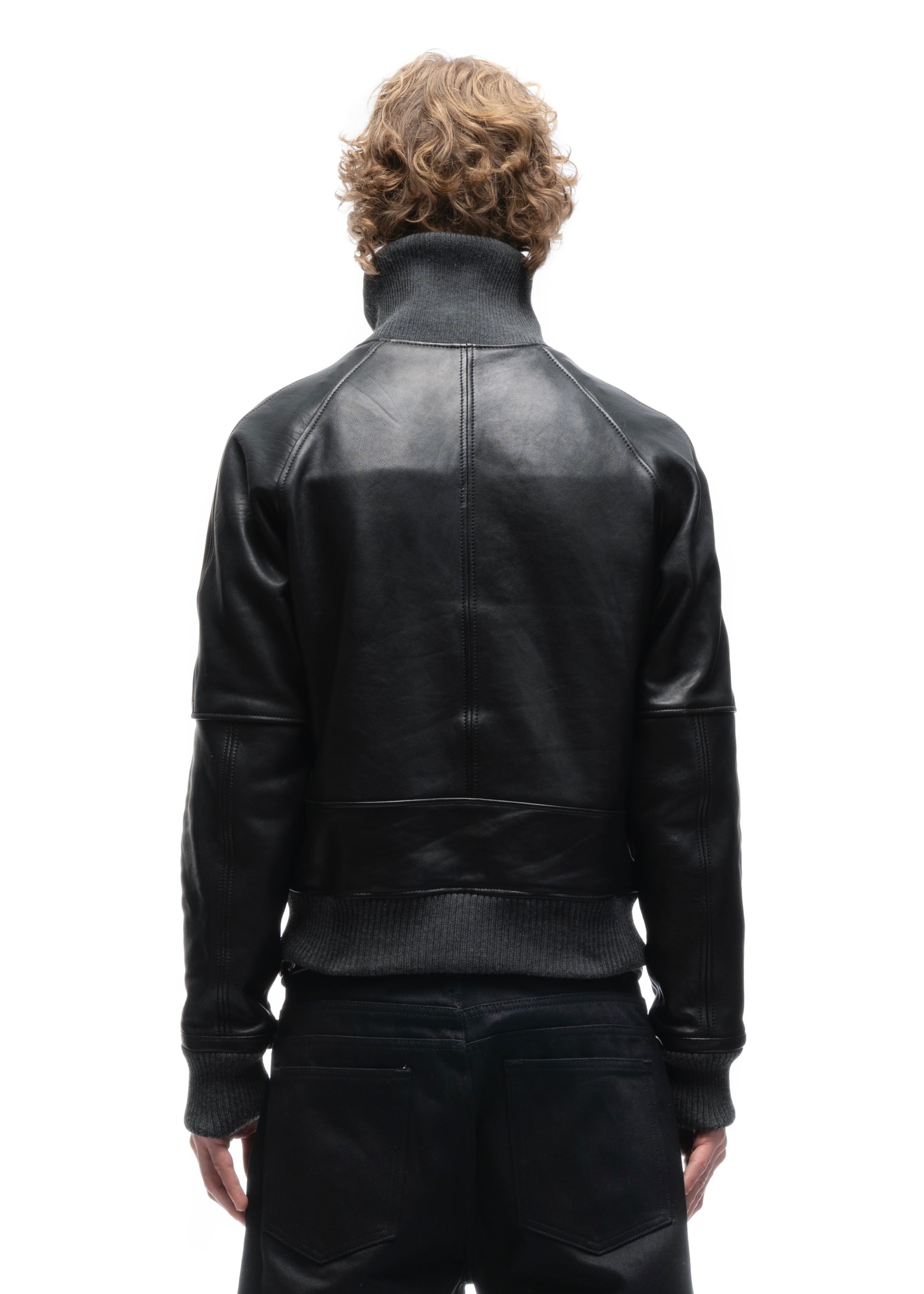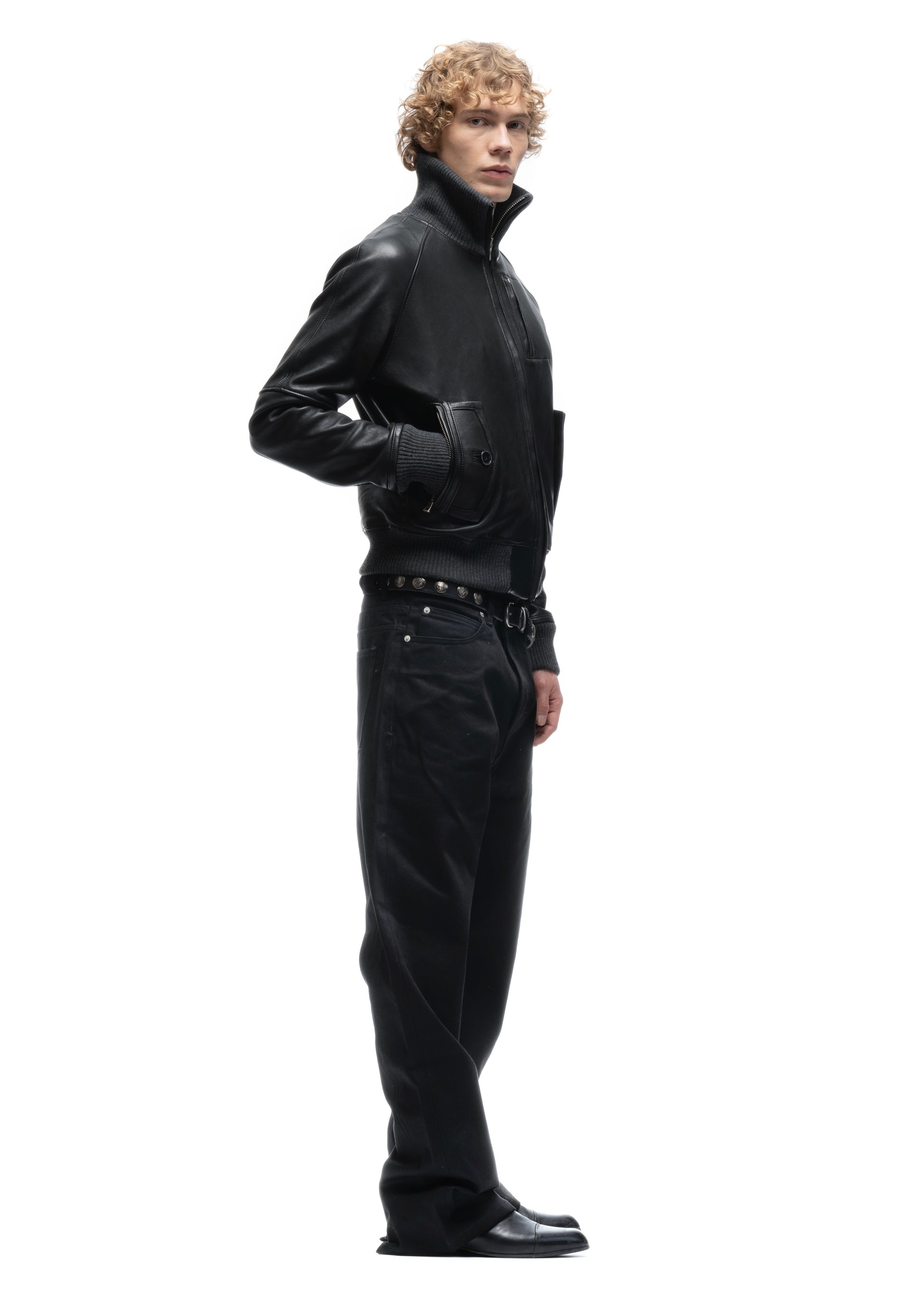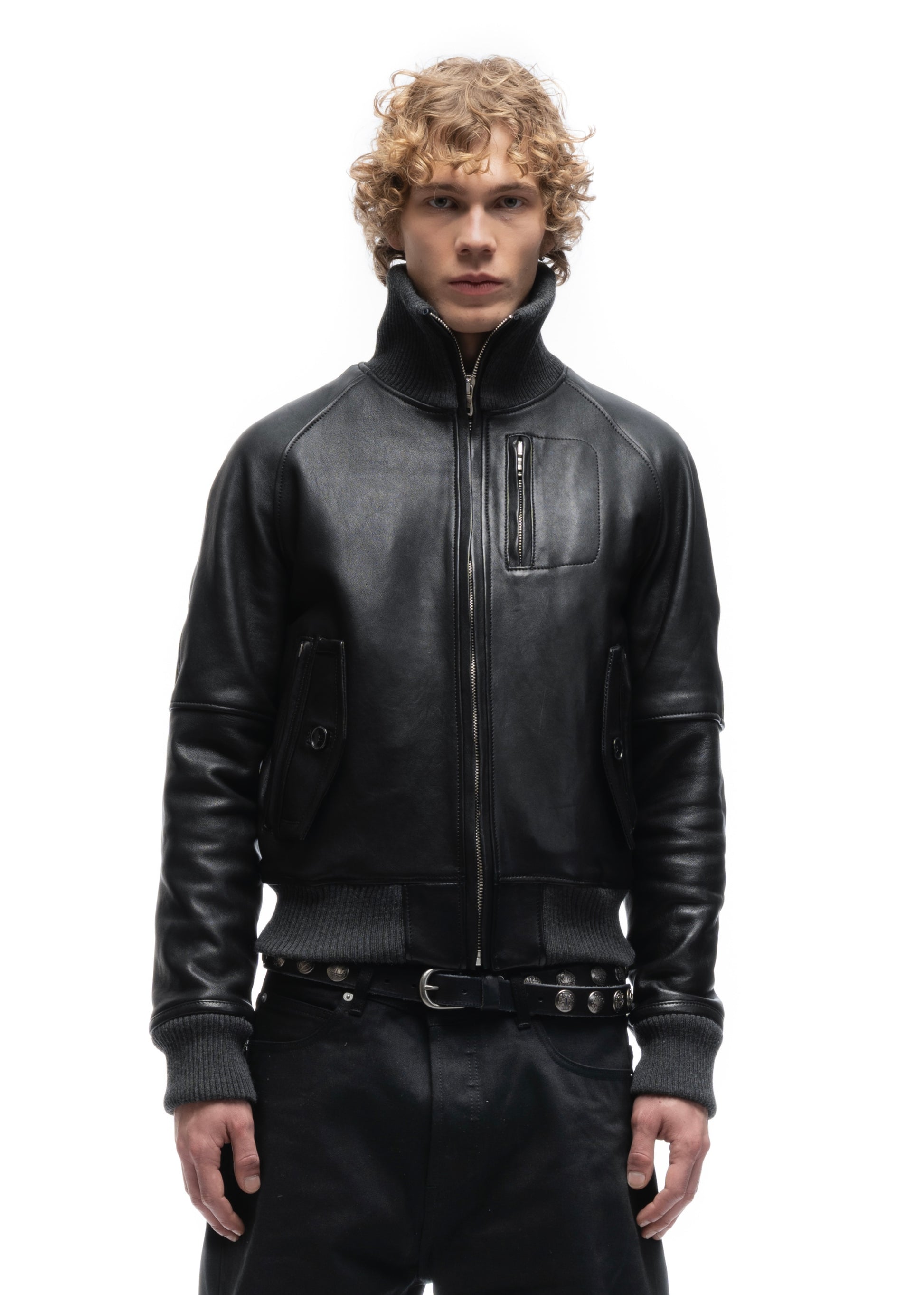 RIBBED CUFFS AND HEM CREATE A SOFT TEXTURAL CONTRAST, WHILE THE FRONT ZIP AND CHEST POCKET KEEP THE LOOK PURE AND FUNCTIONAL. A QUIET, CONTEMPORARY LEATHER JACKET WITH A DISTINCT ARCHITECTURAL ATTITUDE.