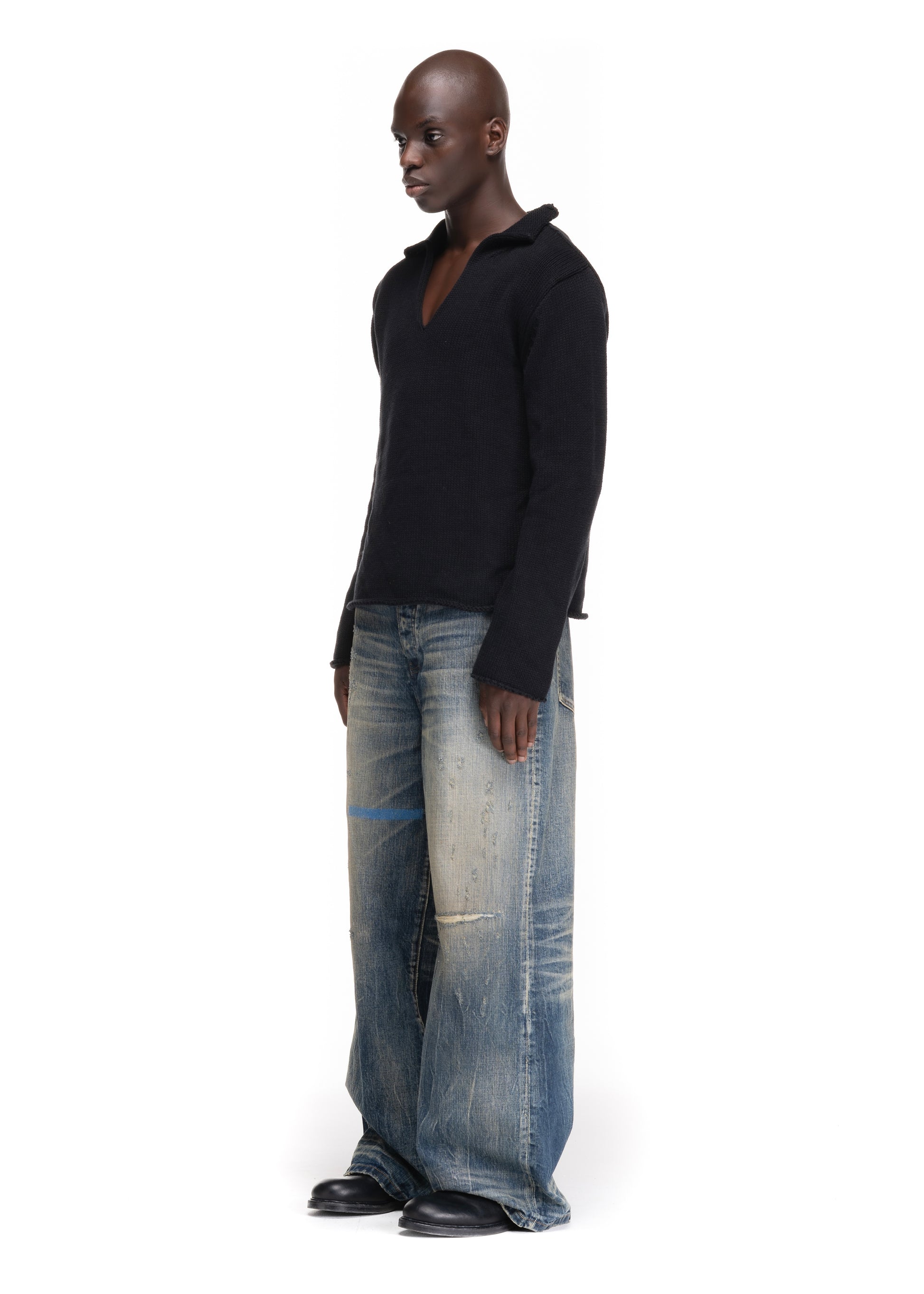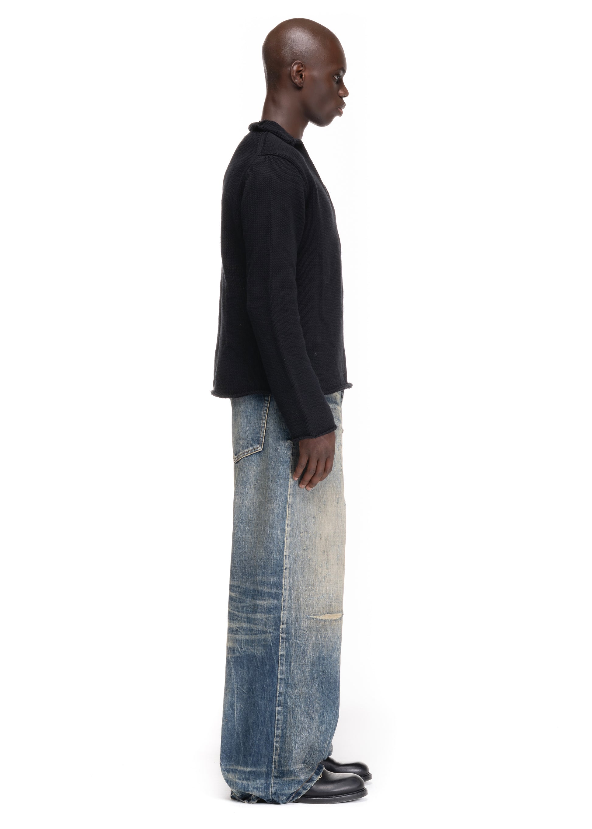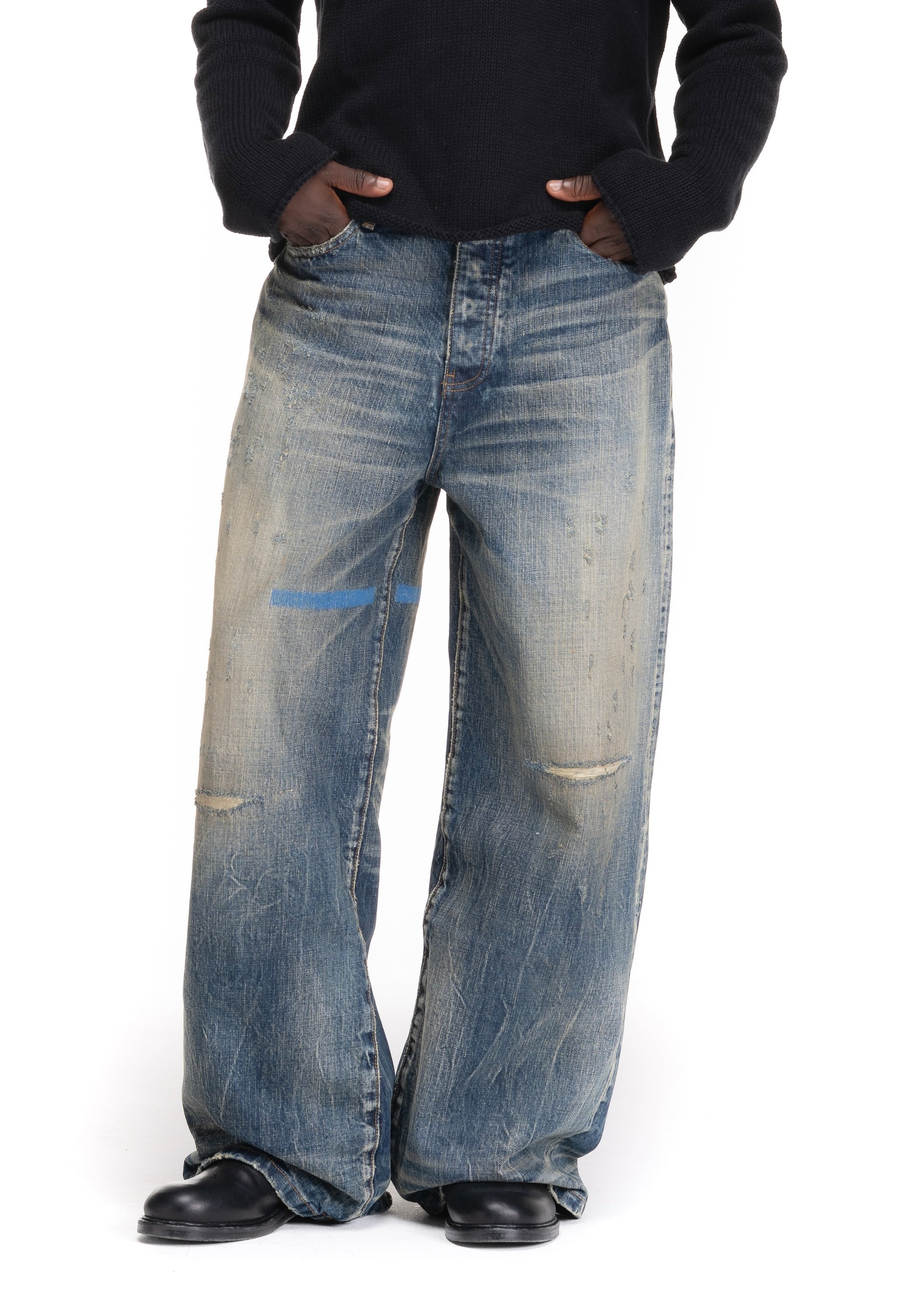 BUILT FROM JAPANESE SELVEDGE DENIM WITH A RUST-FADED WASH, THESE LOOSE-FIT JEANS FEATURE REPAIRED PANEL DETAILS THAT ADD SUBTLE TEXTURE. THE RELAXED PROPORTIONS PROVIDE A SIMPLE, EASY-TO-WEAR SHAPE SUITABLE FOR DAILY USE.