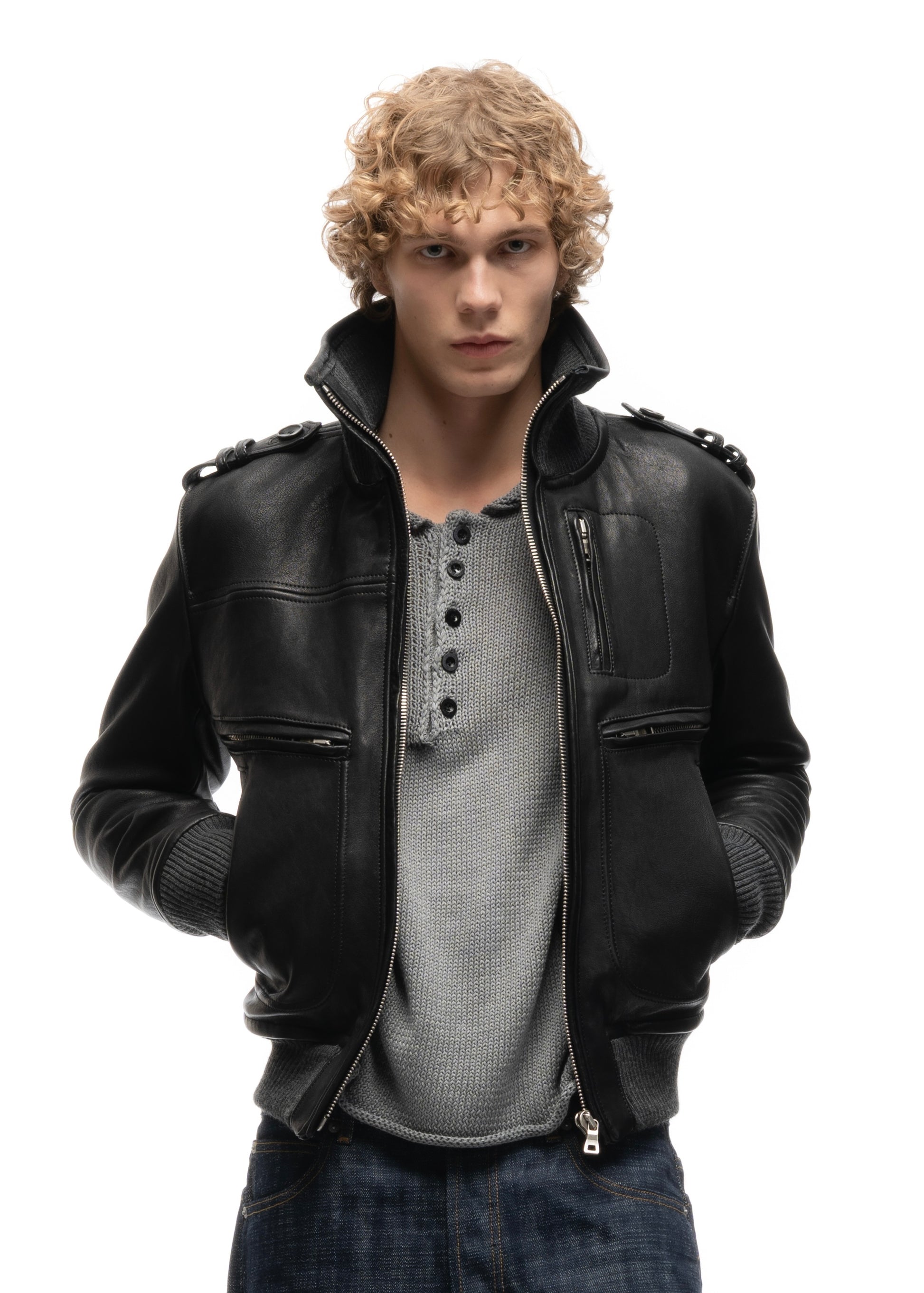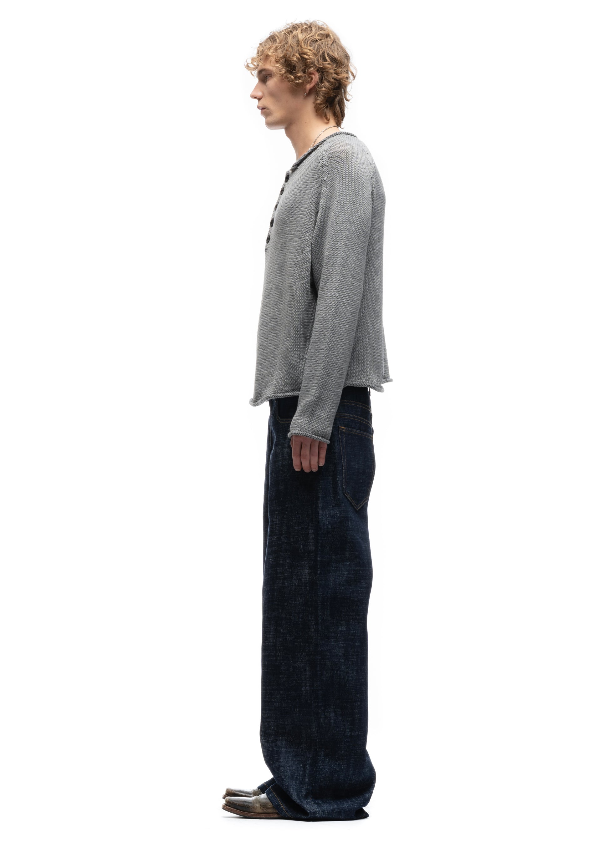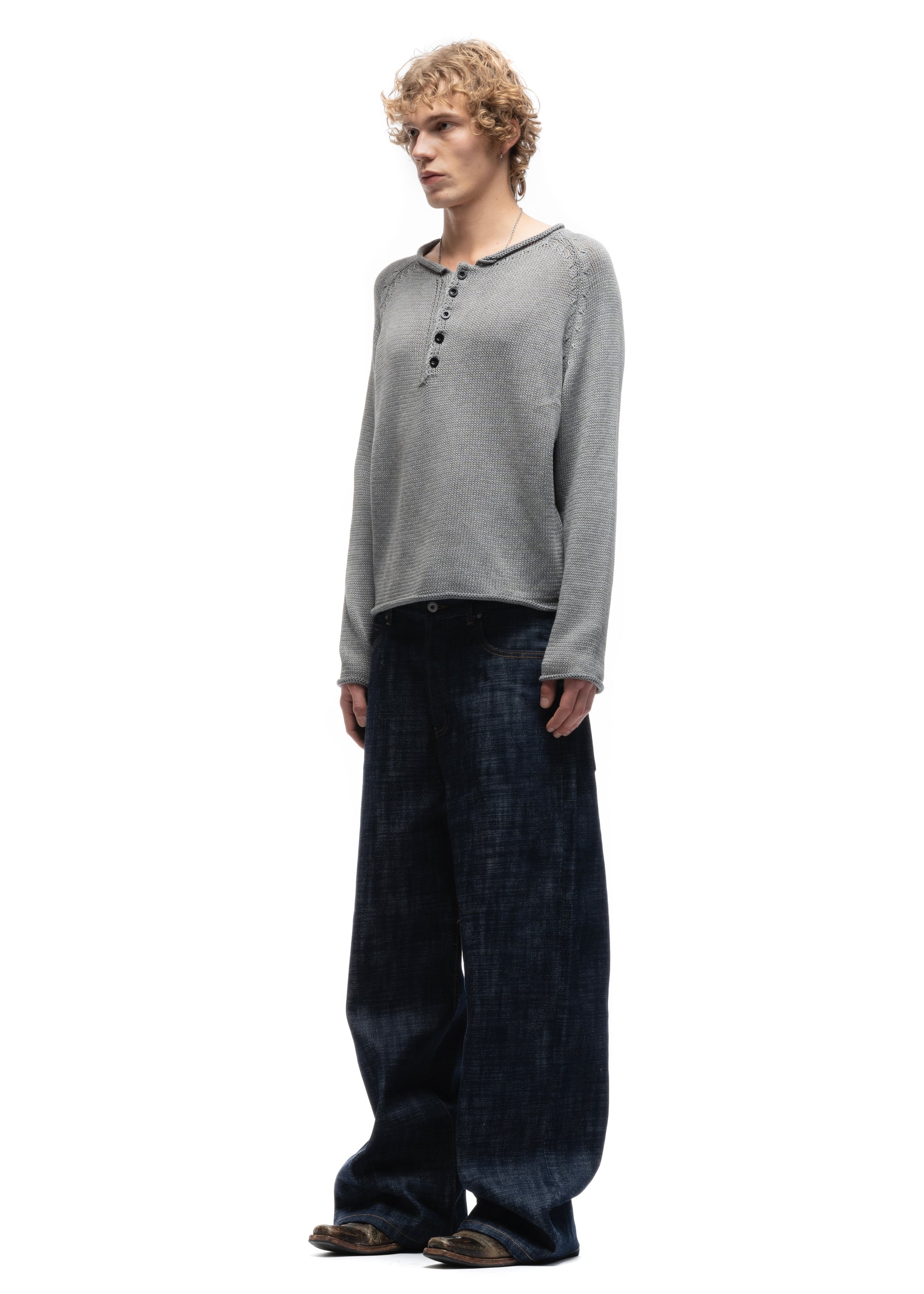 THE BUTTON KNIT SWEATER COMES IN A TEXTURED KNIT FABRIC WITH A RELAXED FIT AND A LIGHTLY WORN-IN FEEL. IT INCLUDES A SHORT FRONT BUTTON LINE AND SUBTLE FRAYED EDGES. THE GREY COLORWAY OFFERS A CLEAN, MINIMAL OPTION FOR DAILY WEAR.