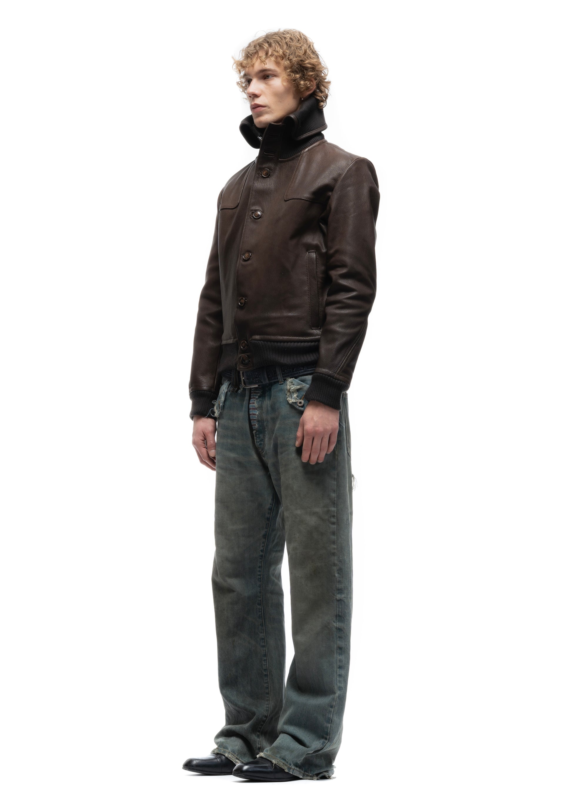 THE COLLAR UP BUTTON LEATHER JACKET FEATURES A CLEAN, FITTED SILHOUETTE WITH A HIGH COLLAR THAT CAN BE WORN STANDING OR FOLDED DOWN. THE COLLAR CAN BE CLOSED USING THE INTEGRATED BUTTONS. THE FRONT ALSO CLOSES WITH USED-EFFECT BUTTONS, EXTENDING THE UTILITARIAN LOOK OF THE PIECE.