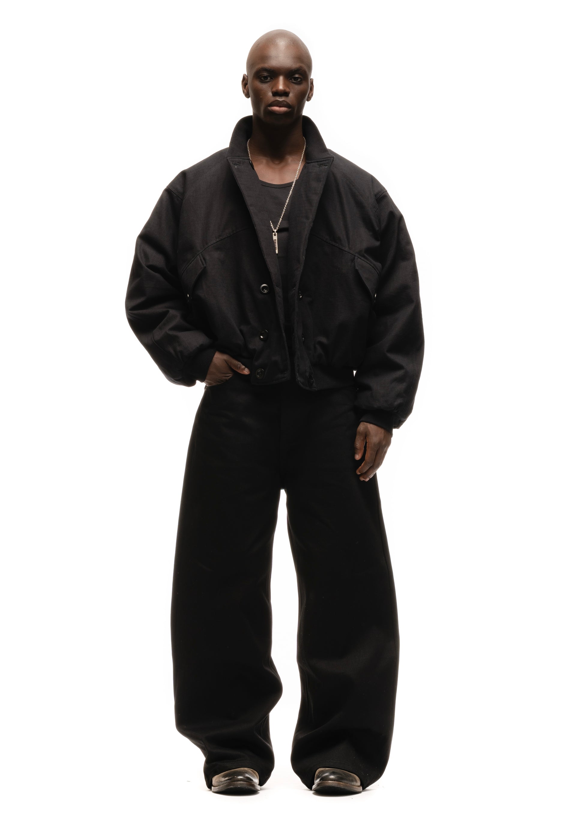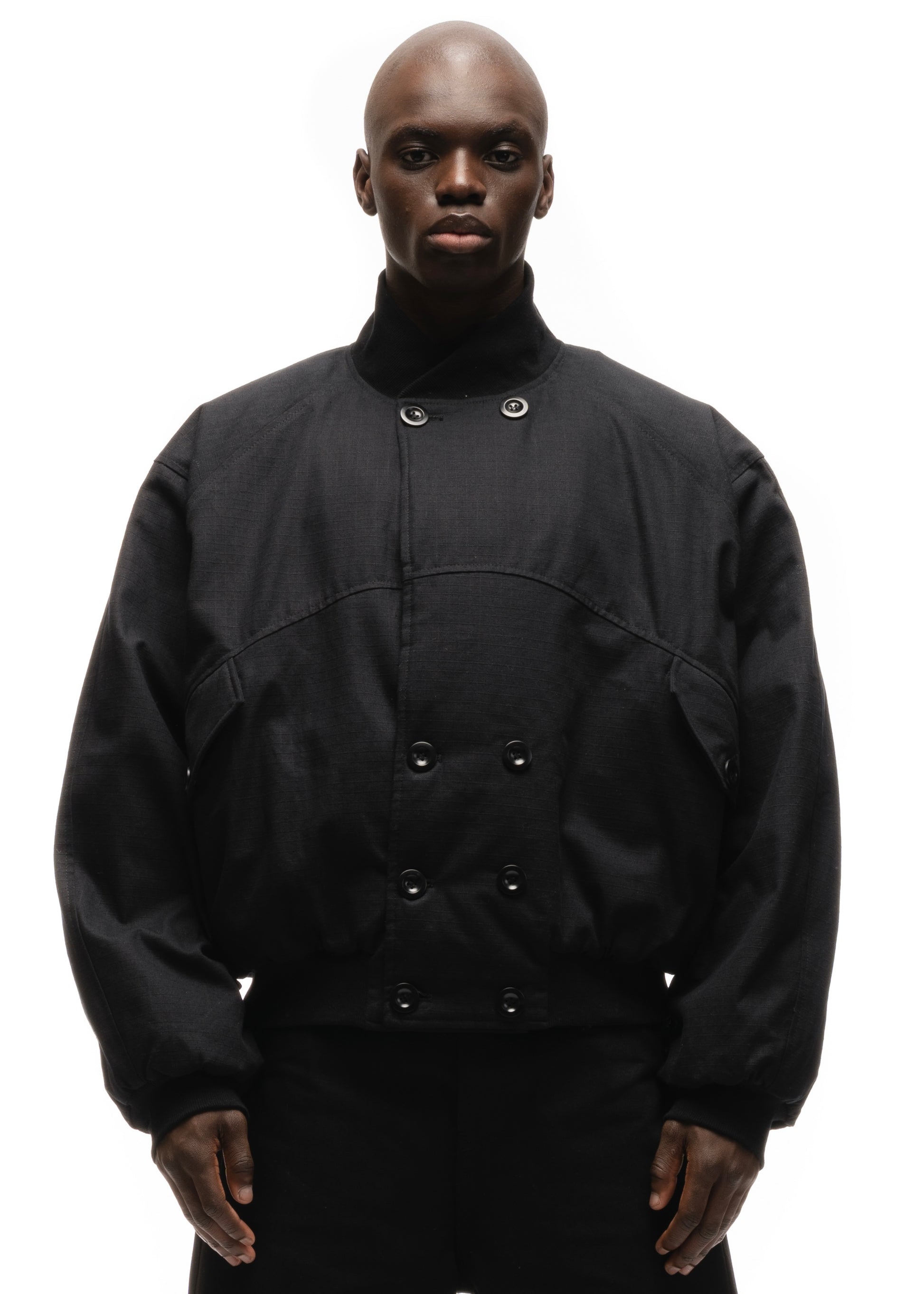 THE DOUBLE BUTTON BOMBER JACKET IS MADE FROM A DURABLE WORKWEAR RIPSTOP FABRIC WITH A STRUCTURED FEEL. IT FEATURES A WIDE, WRAPPING STAND COLLAR AND A FULL DOUBLE-BUTTON FRONT. THE DROPPED SHOULDERS AND ROUNDED SLEEVES CREATE A DISTINCTIVE BOMBER SHAPE, FINISHED WITH AN ADJUSTABLE FLAP POCKET ON EACH SIDE. THE BLACK COLORWAY OFFERS A CLEAN, MINIMAL LOOK.