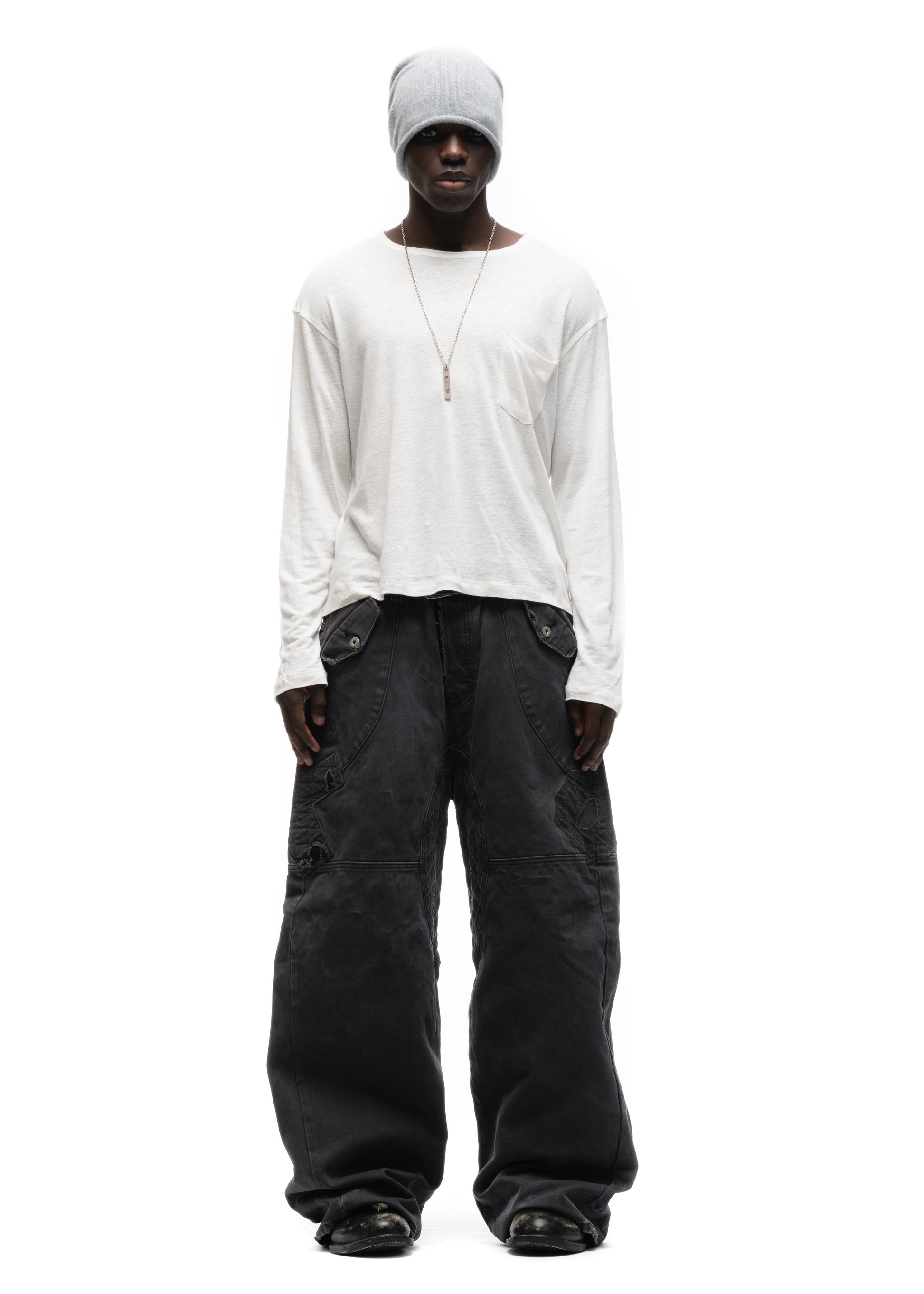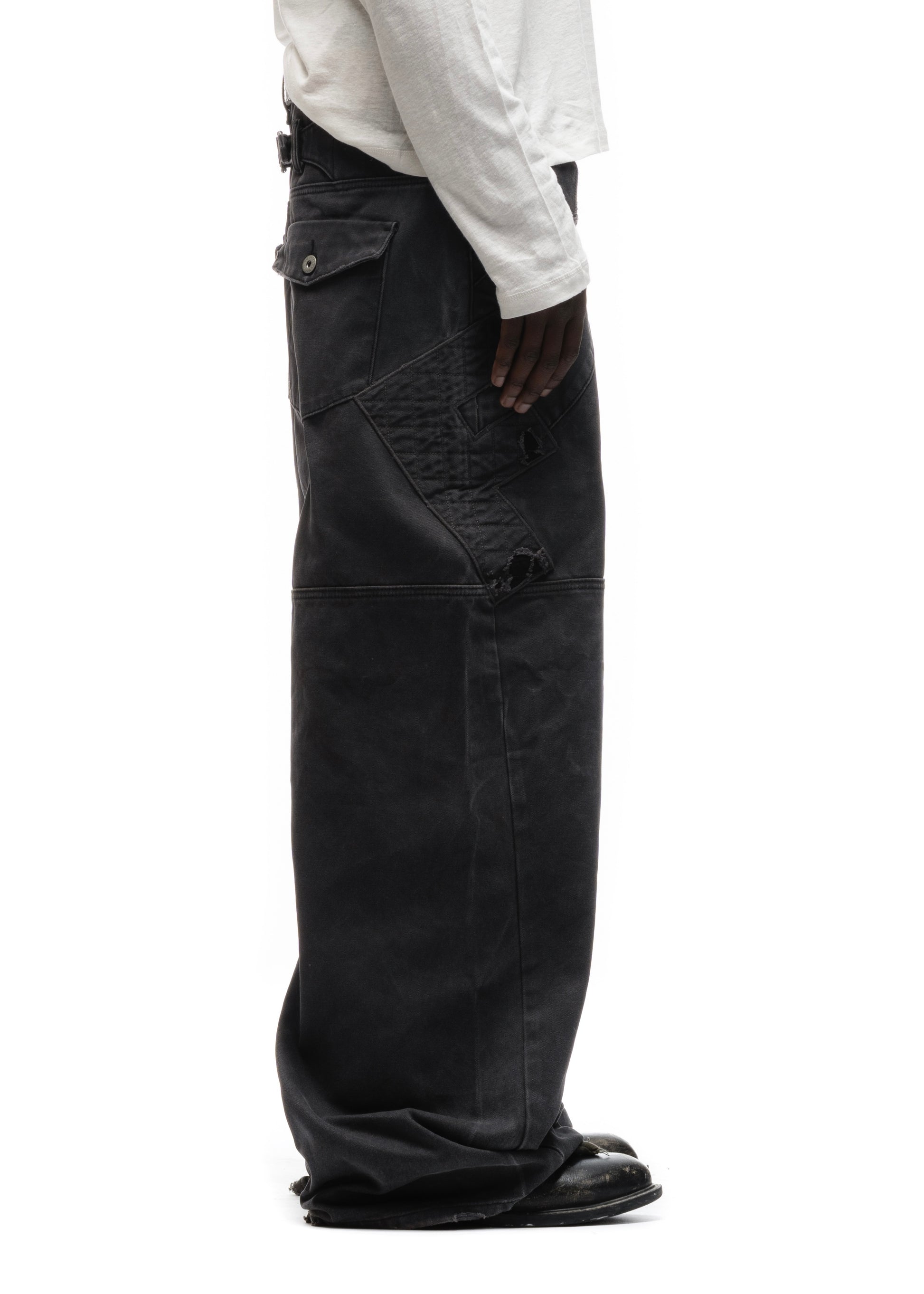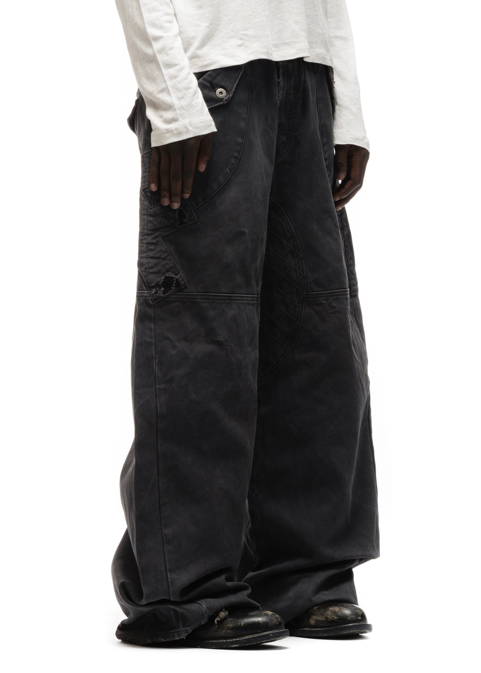 THE F8 REWORKED PANTS COME IN A WIDE, RELAXED FIT WITH A DISTINCT WORN-IN LOOK. THEY FEATURE AN F-SHAPED PATCH ON ONE SIDE AND AN 8-PATCH ON THE OTHER, BOTH INTEGRATED INTO THE PANEL WORK. THE PIECE USES REWORKED SEAMS, SUBTLE DISTRESSING, AND A FADED GREY WASH FOR A MORE CHARACTER-DRIVEN APPEARANCE.