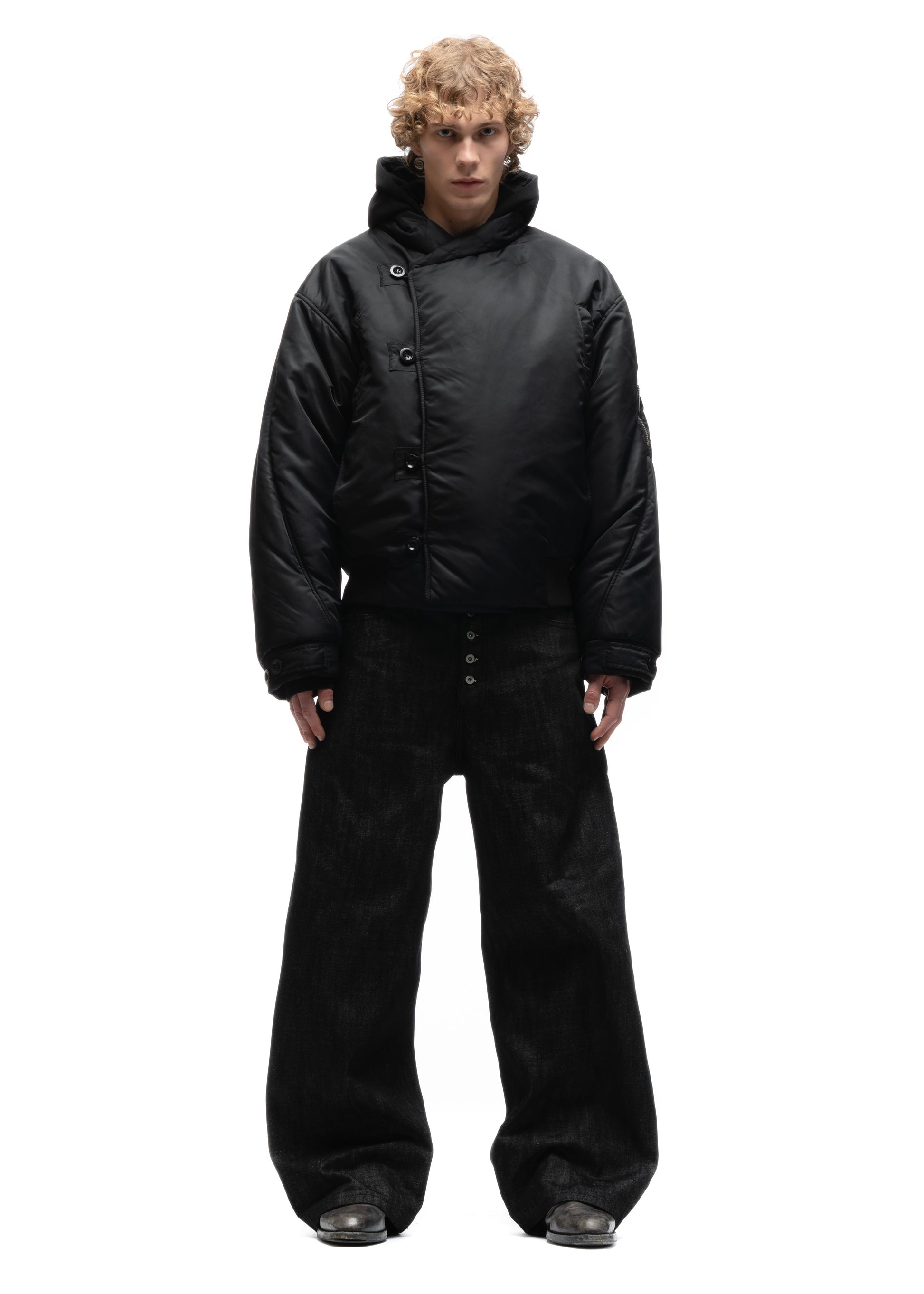 THE FENCING BOMBER JACKET COMES WITH AN ASYMMETRICAL BUTTON FRONT, A MILITARY SLEEVE POCKET AND A PADDED STRUCTURE MADE FOR LOWER TEMPERATURES. THE JACKET FEATURES BANANA SLEEVES AND A HEAVY HOOD ON THE INSIDE.