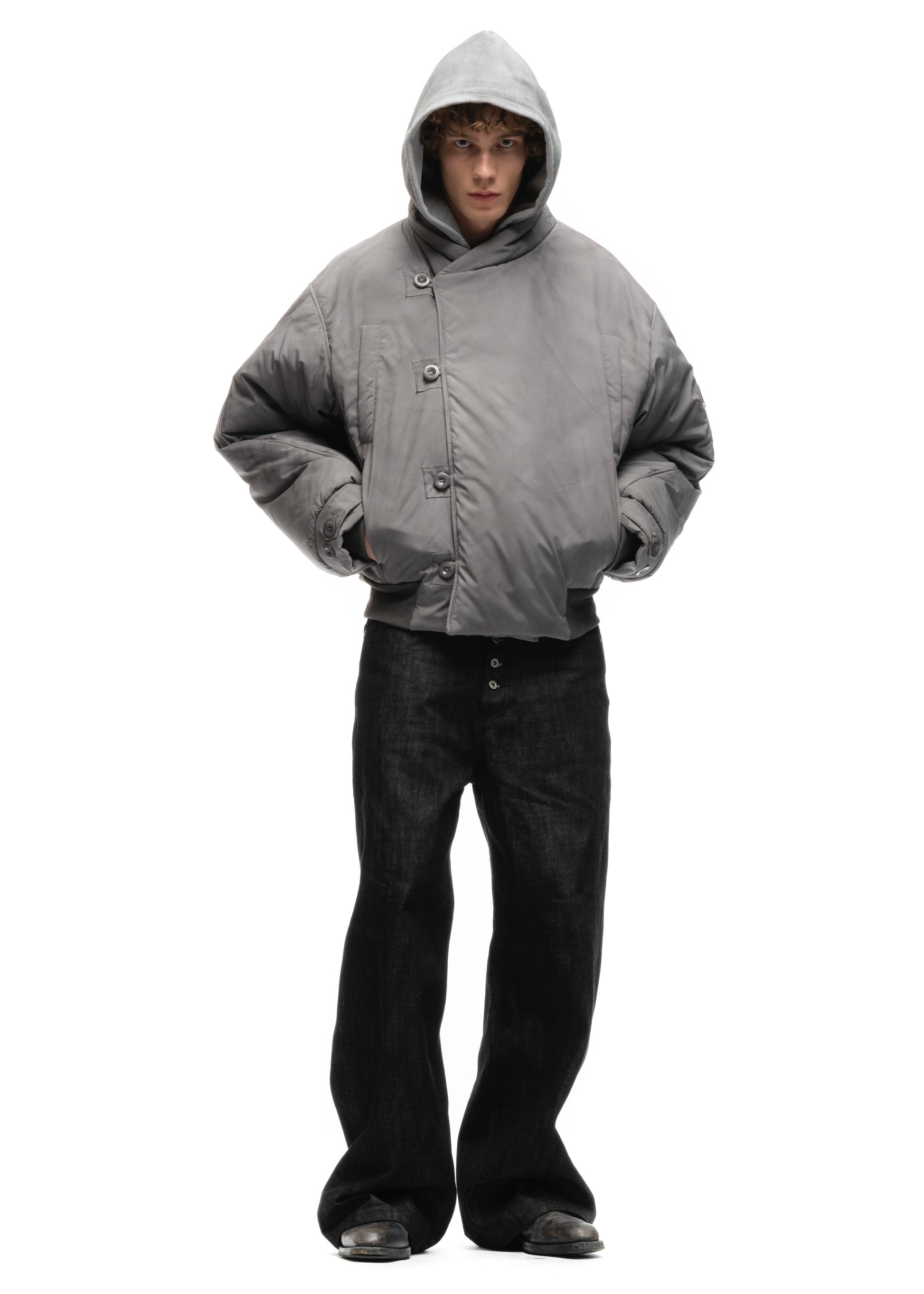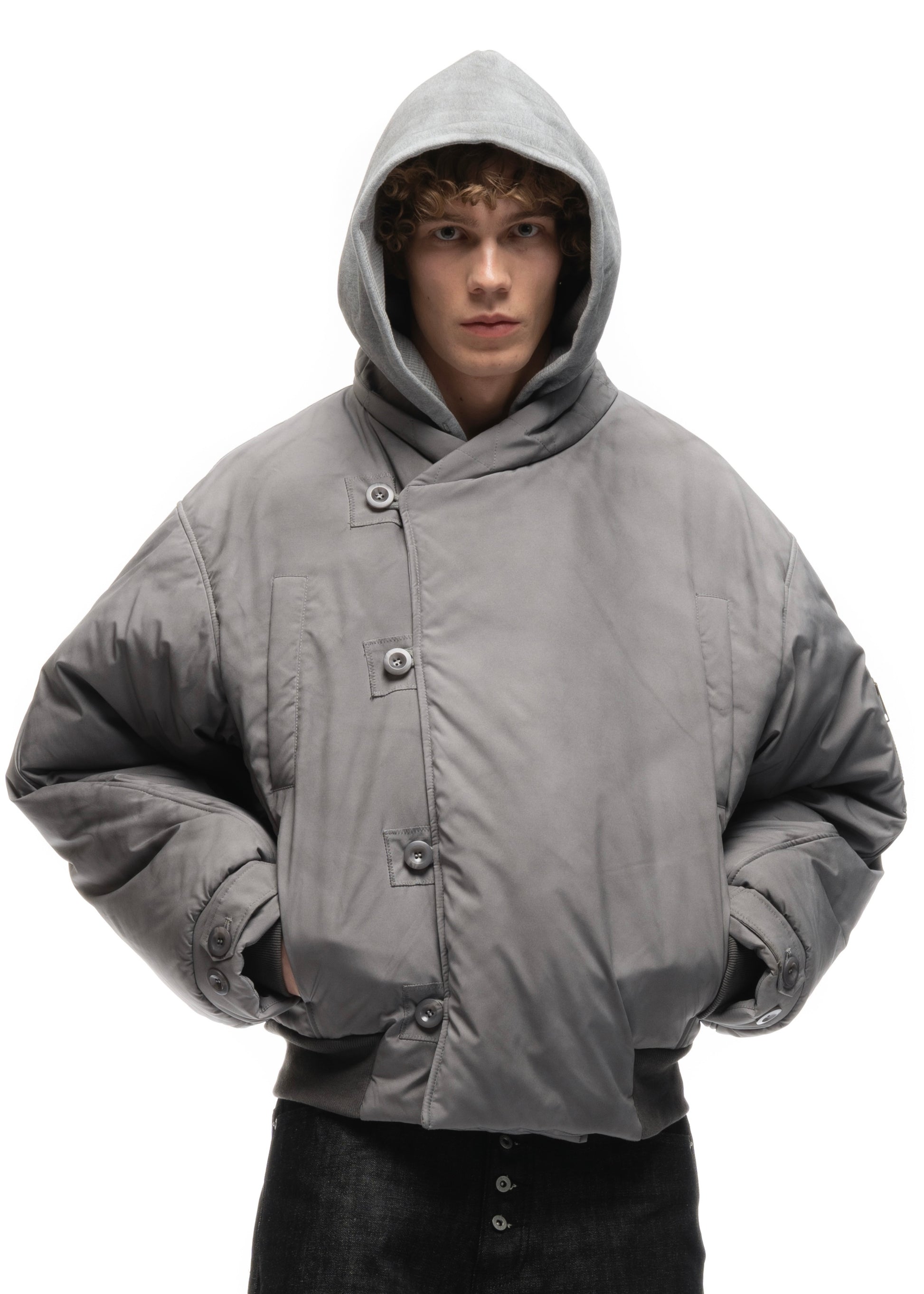 THE FENCING BOMBER JACKET COMES WITH AN ASYMMETRICAL BUTTON FRONT, A MILITARY SLEEVE POCKET AND A PADDED STRUCTURE MADE FOR LOWER TEMPERATURES. THE JACKET FEATURES BANANA SLEEVES AND A HEAVY HOOD ON THE INSIDE.