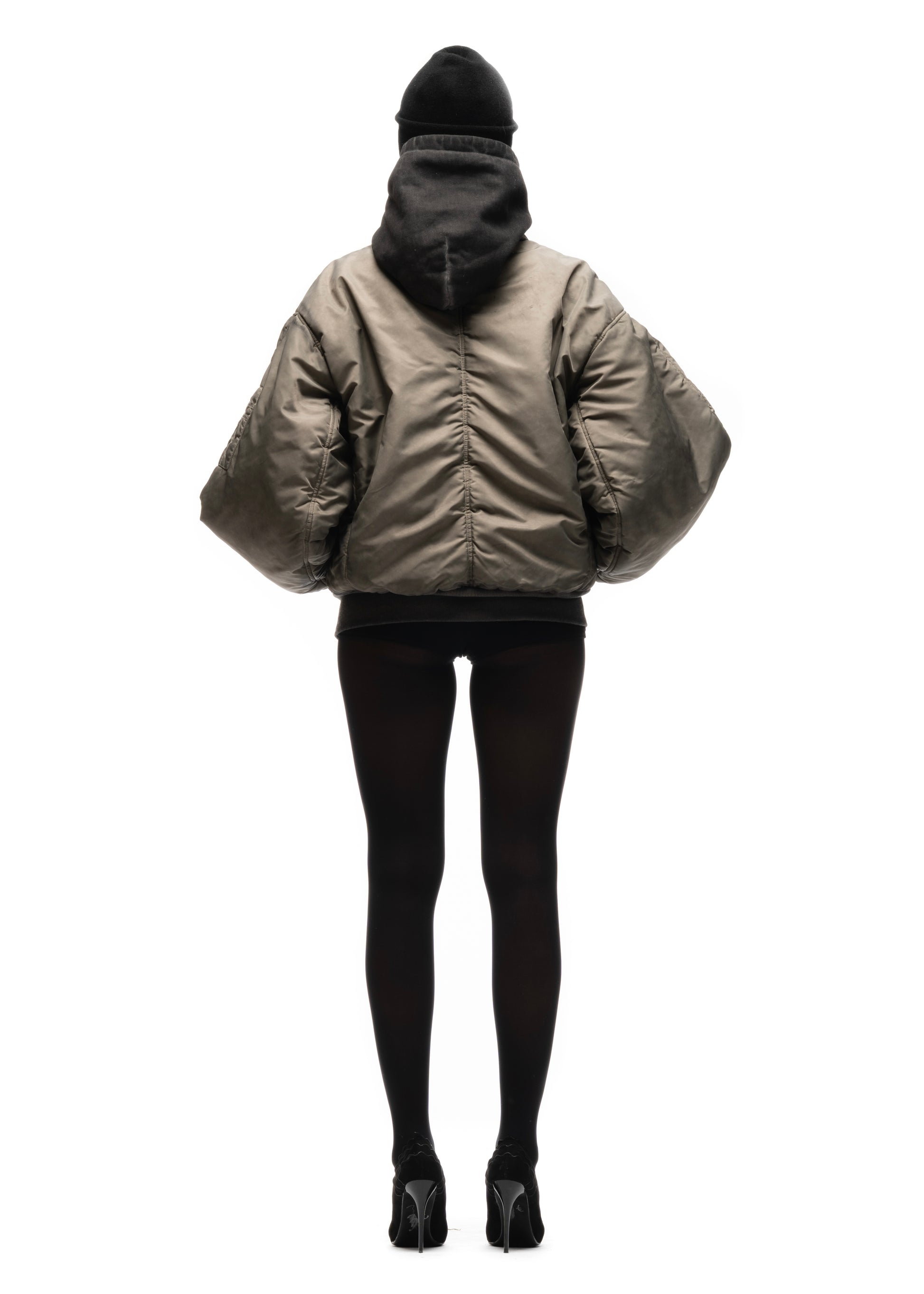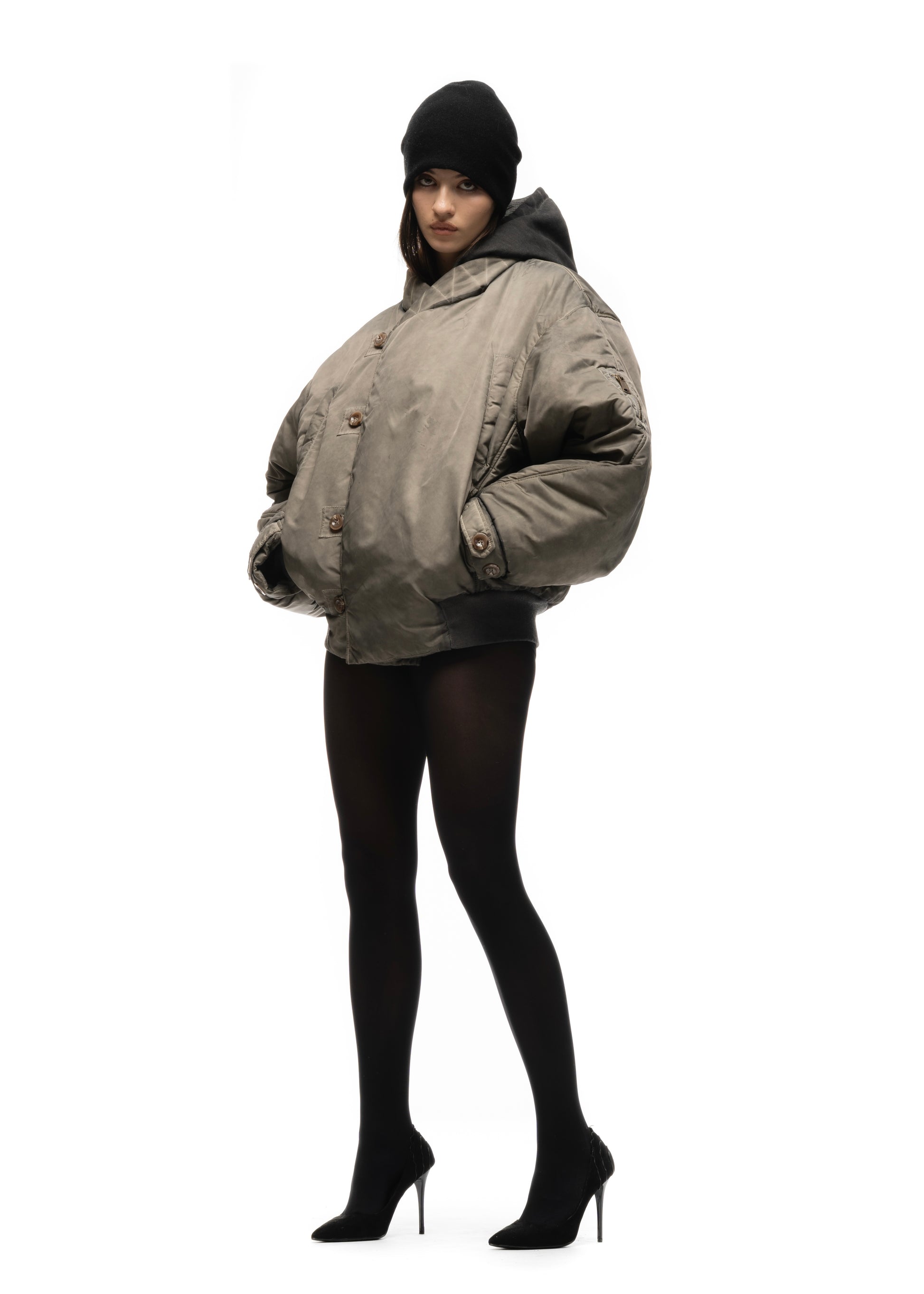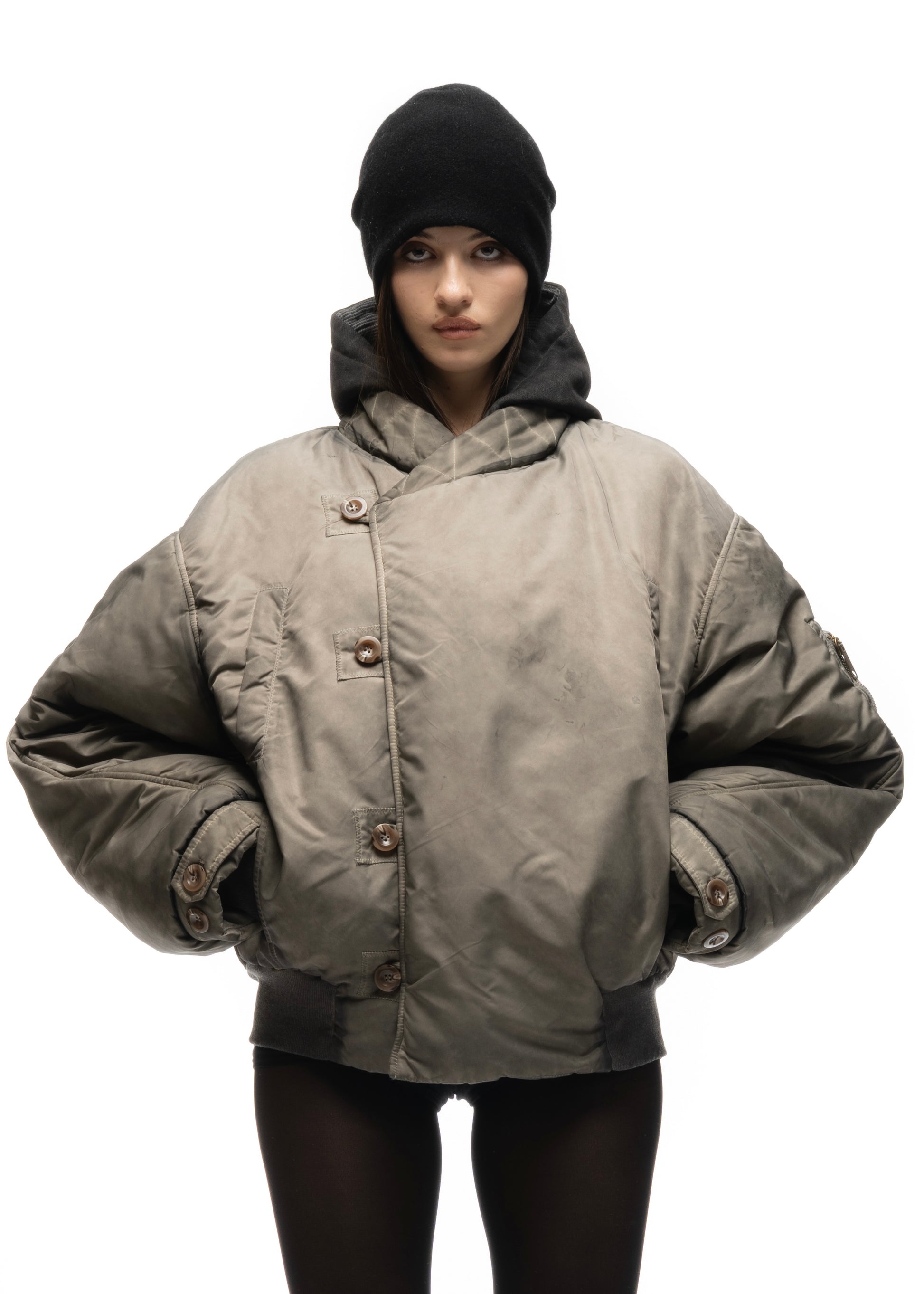 THE FENCING BOMBER JACKET COMES WITH AN ASYMMETRICAL BUTTON FRONT, A MILITARY SLEEVE POCKET AND A PADDED STRUCTURE MADE FOR LOWER TEMPERATURES. THE JACKET FEATURES BANANA SLEEVES AND A HEAVY HOOD ON THE INSIDE.