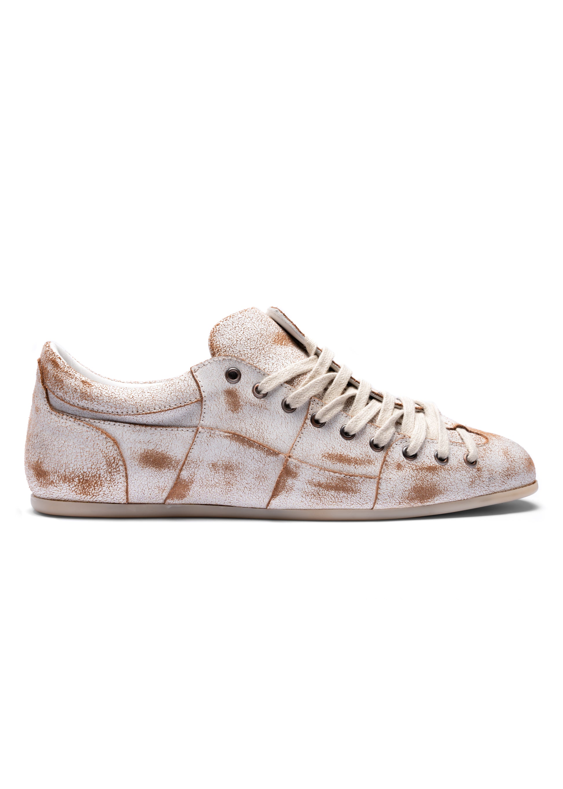 CRAFTED FROM PREMIUM COW LEATHER IN A WHITE USED FINISH, THE FOOTBALL SNEAKER BUILDS ON THE SIGNATURE SILHOUETTE OF THE NFS FOOTBALL DERBY. THE UPPER FEATURES A DISTRESSED, CRACKED LEATHER TEXTURE THAT CREATES AN AUTHENTIC, AGED LOOK WITHOUT COMPROMISING DURABILITY. THE LOW-PROFILE SHAPE IS COMPLETED WITH FLAT WHITE COTTON LACES.