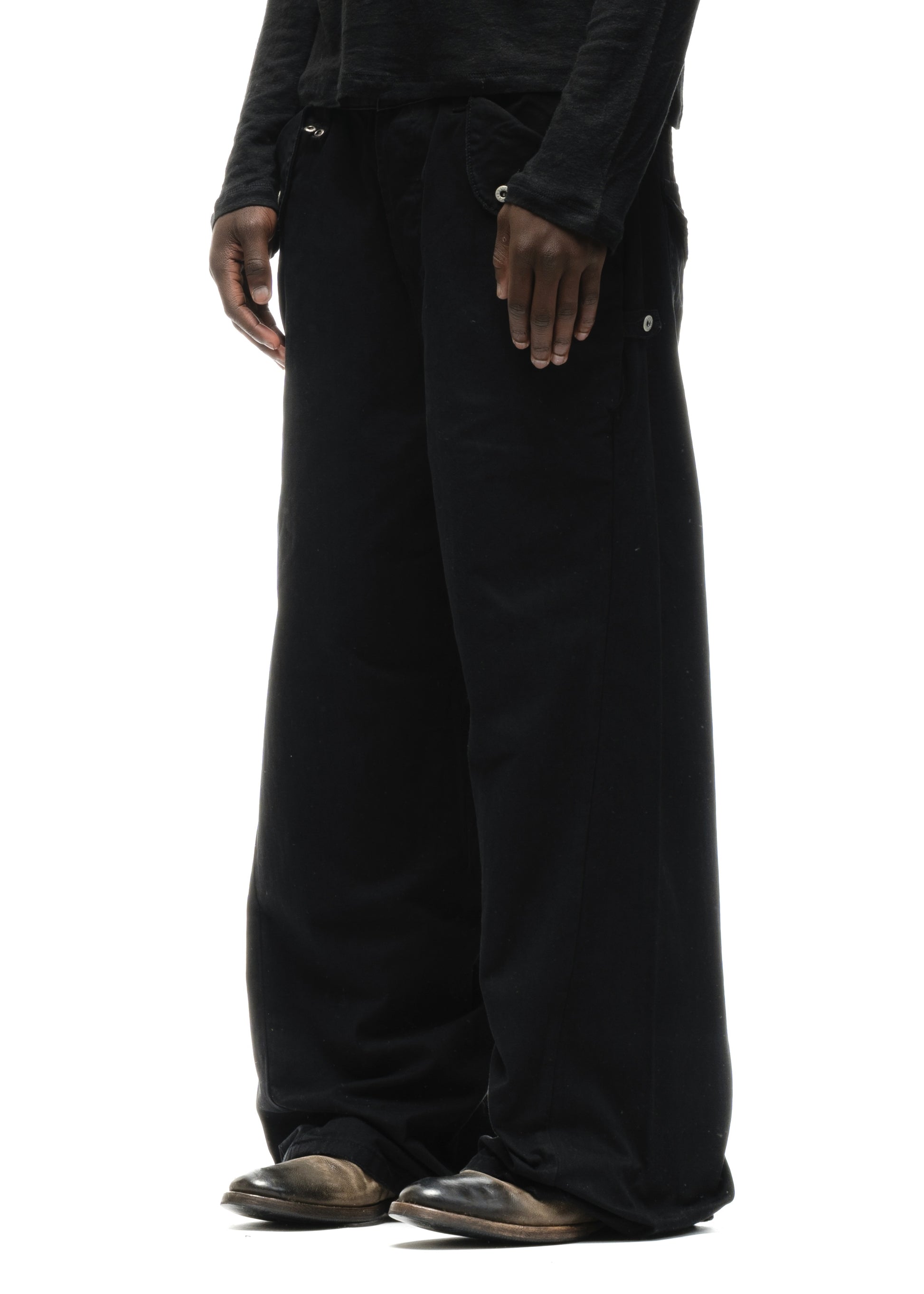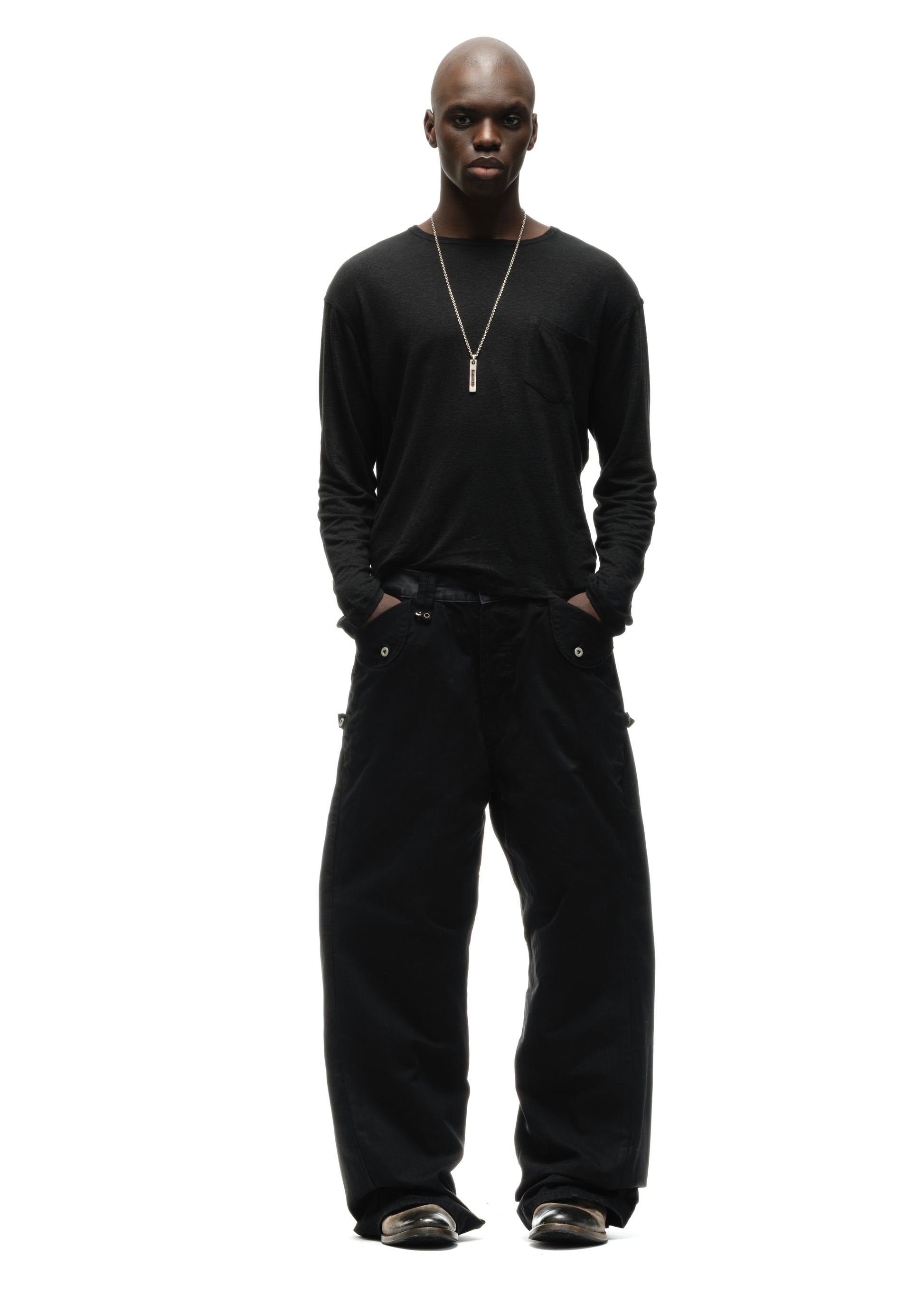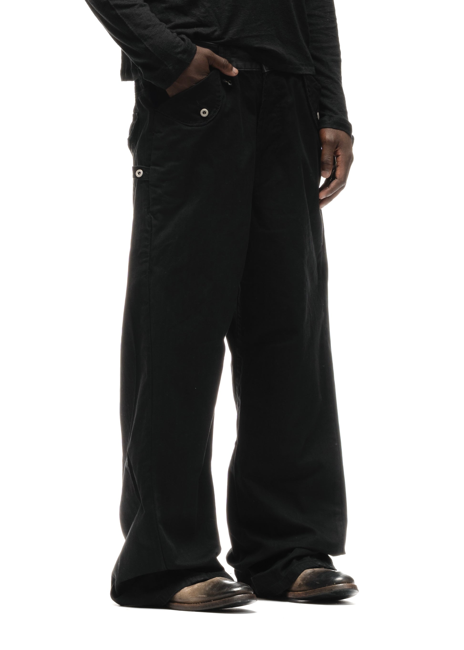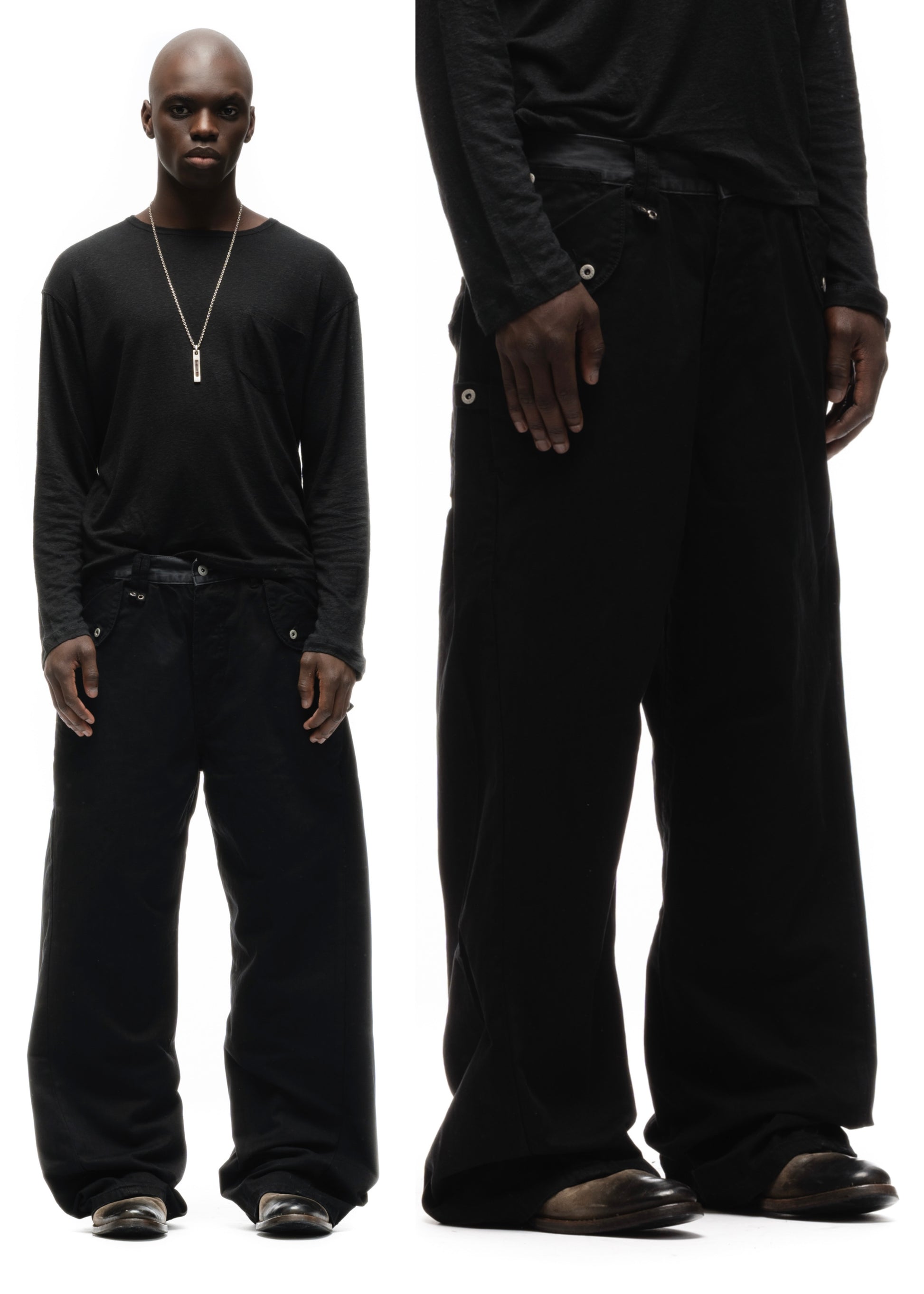 THE HERRINGBONE CUT PANTS COME IN A DEEP BLACK TONE WITH THE SAME WIDE, RELAXED SHAPE AND FRONT POCKET FLAPS. THE WAISTBAND IS CONTRAST-DYED, CREATING A SUBTLE SHIFT AGAINST THE BLACK FABRIC. THE TEXTURED HERRINGBONE WEAVE GIVES THE PIECE A STRUCTURED, WORKWEAR-INSPIRED FEEL.