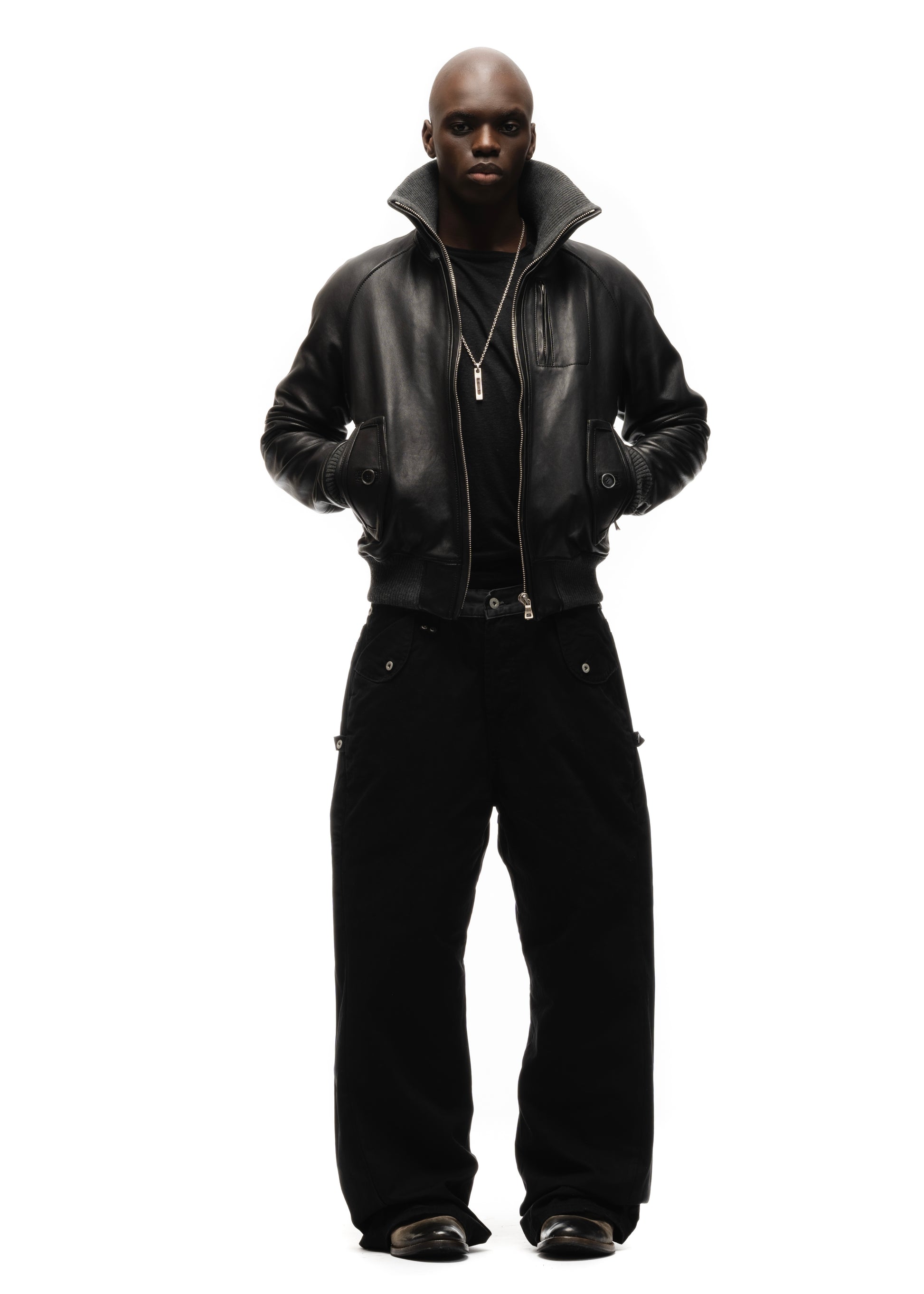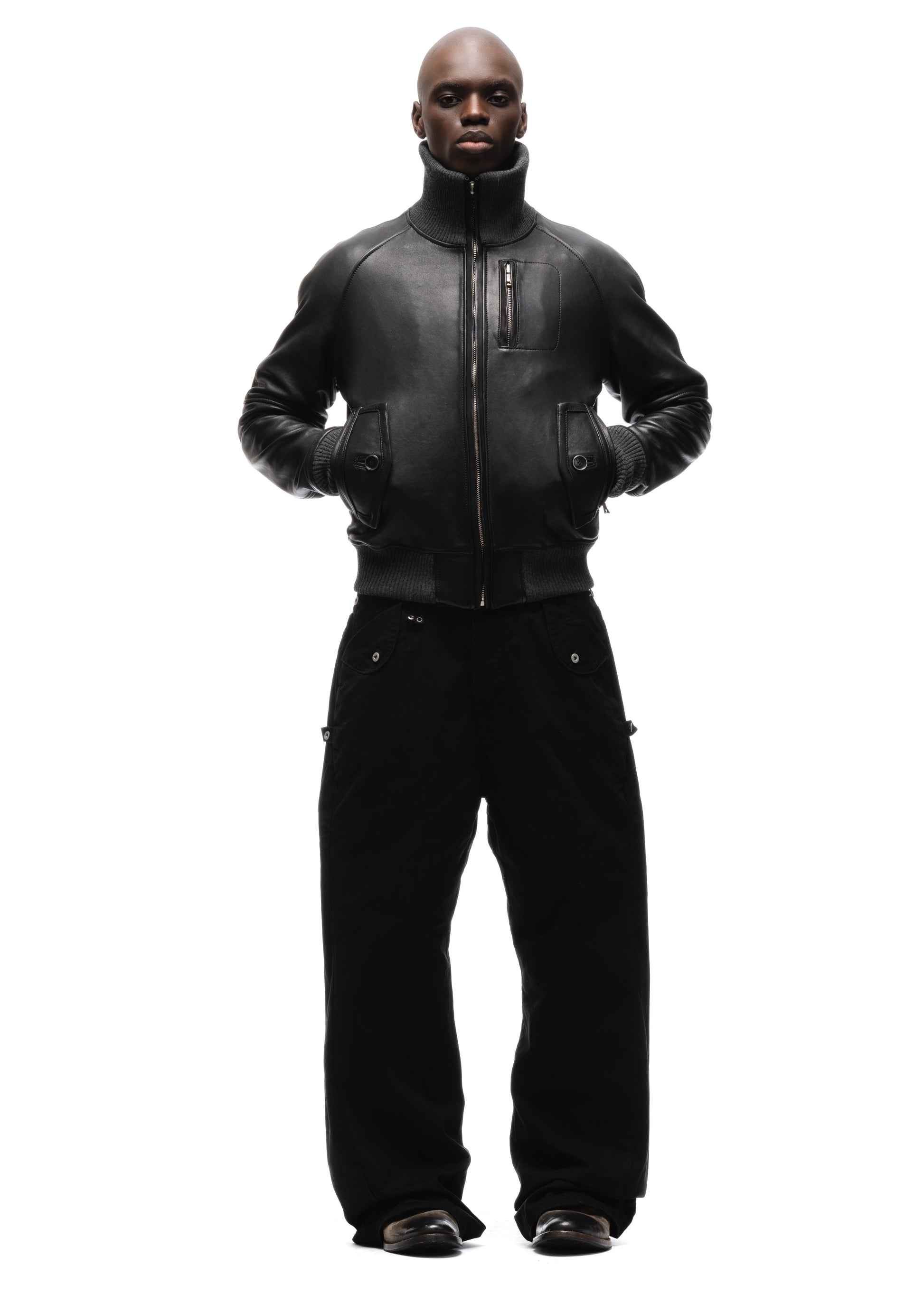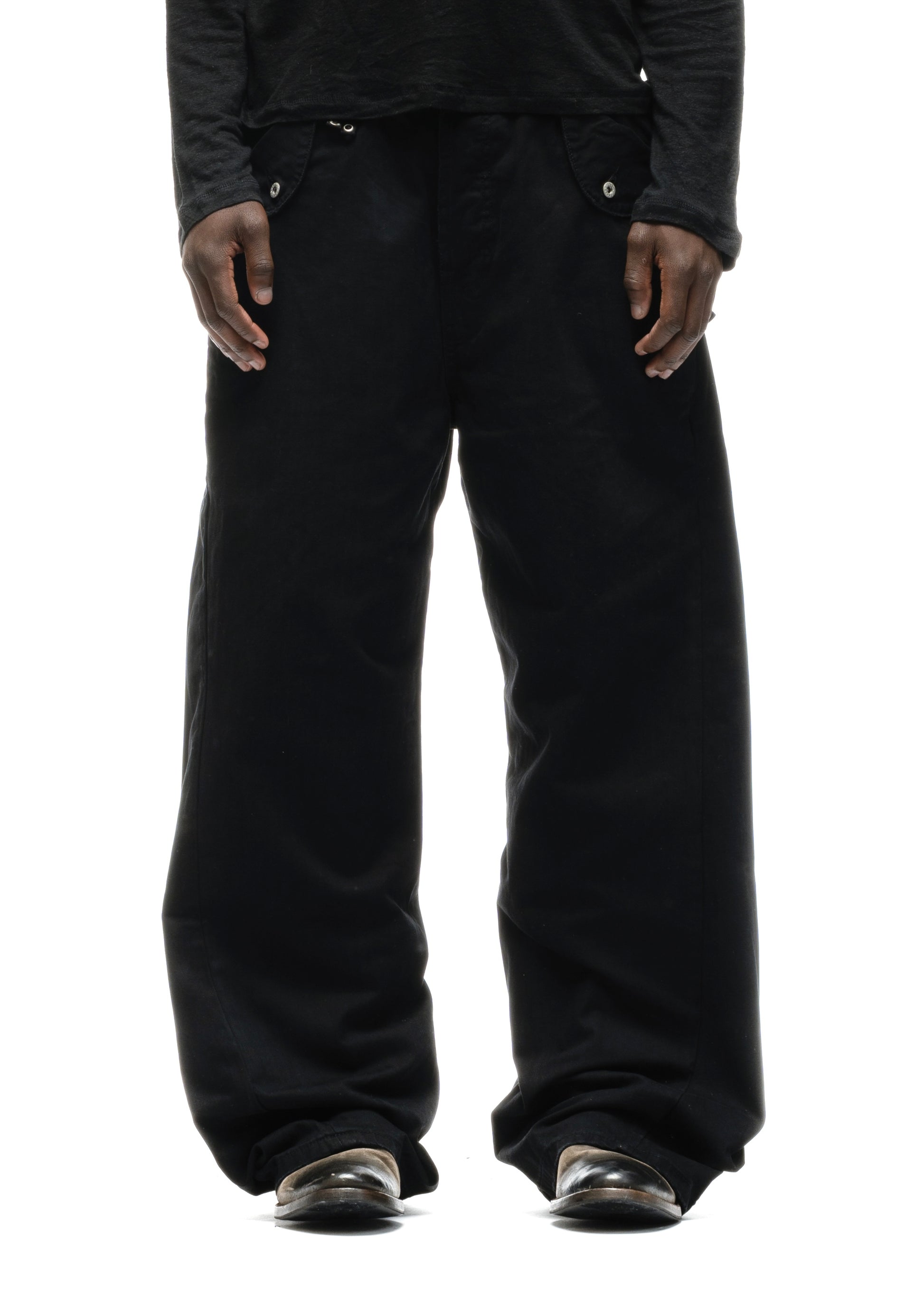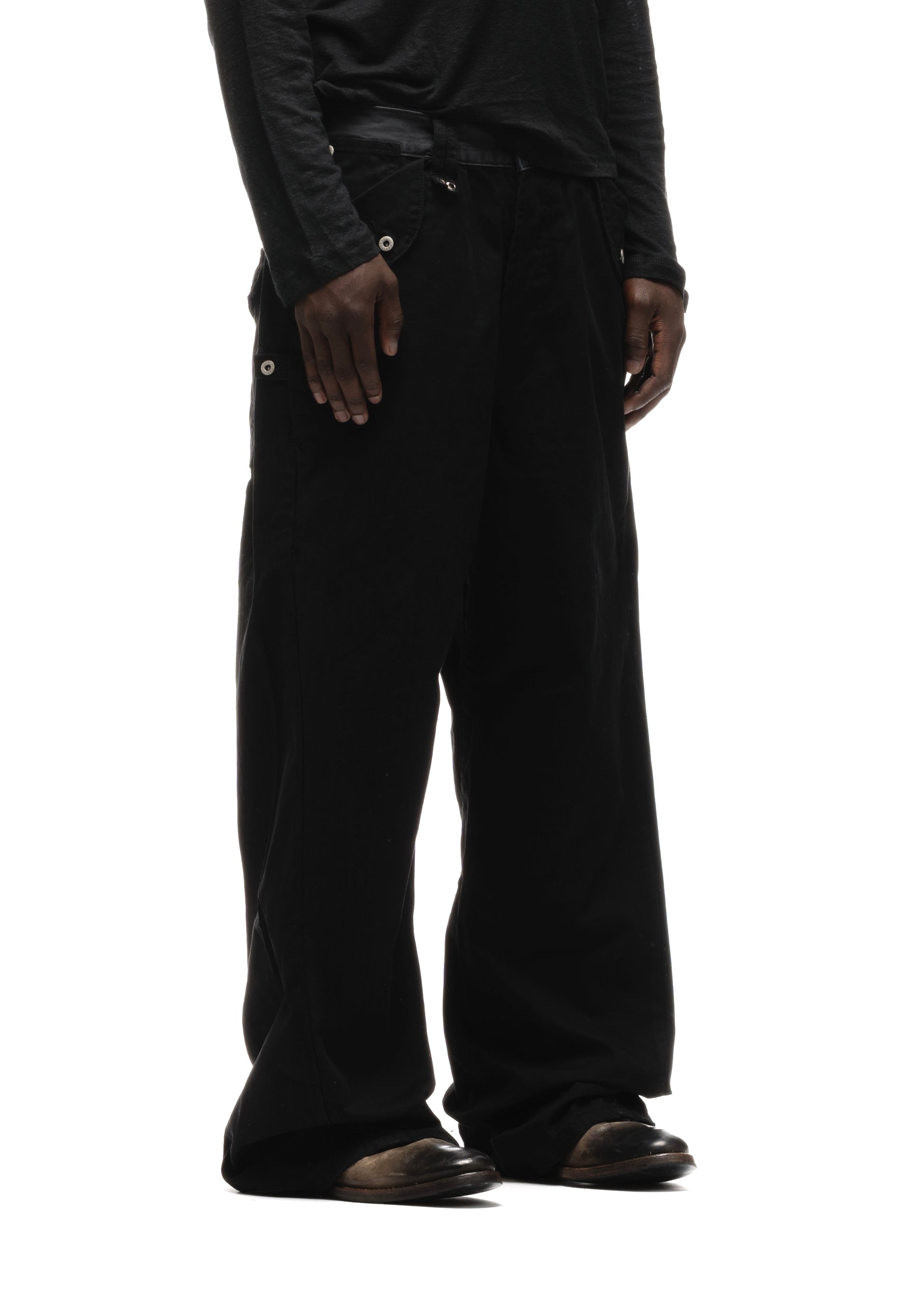 THE HERRINGBONE CUT PANTS COME IN A DEEP BLACK TONE WITH THE SAME WIDE, RELAXED SHAPE AND FRONT POCKET FLAPS. THE WAISTBAND IS CONTRAST-DYED, CREATING A SUBTLE SHIFT AGAINST THE BLACK FABRIC. THE TEXTURED HERRINGBONE WEAVE GIVES THE PIECE A STRUCTURED, WORKWEAR-INSPIRED FEEL.