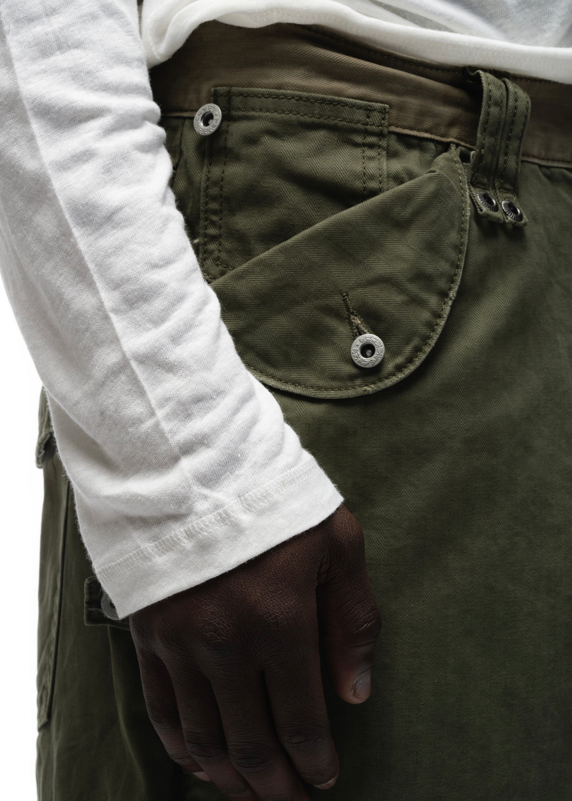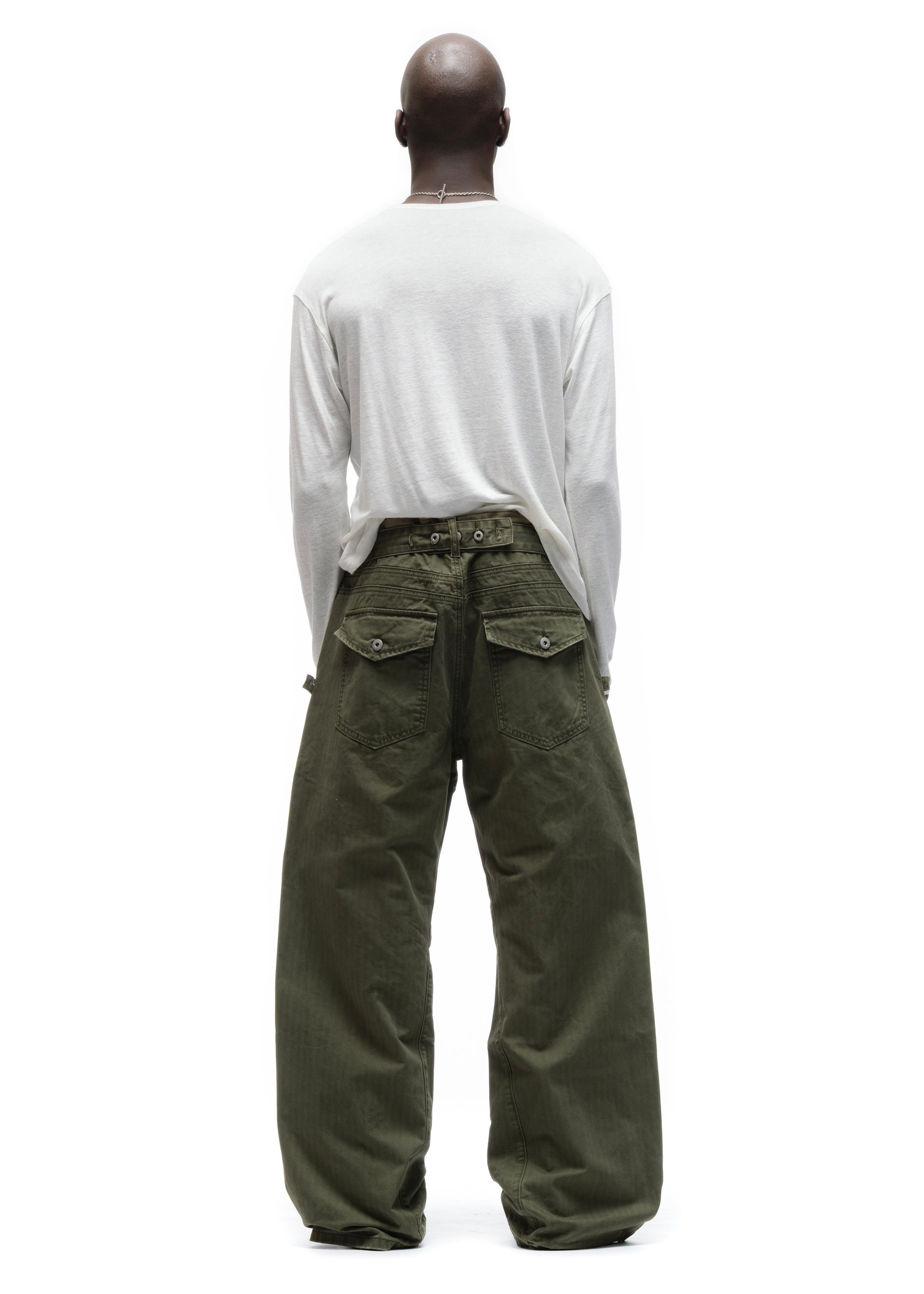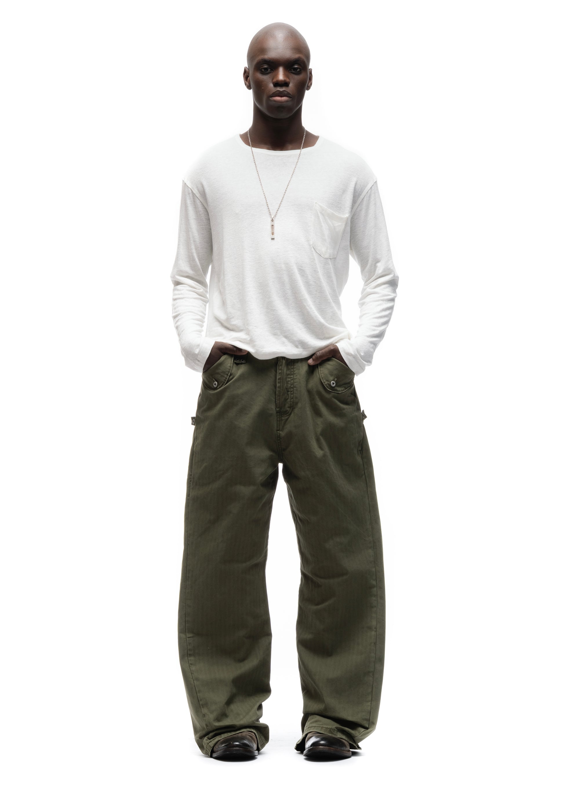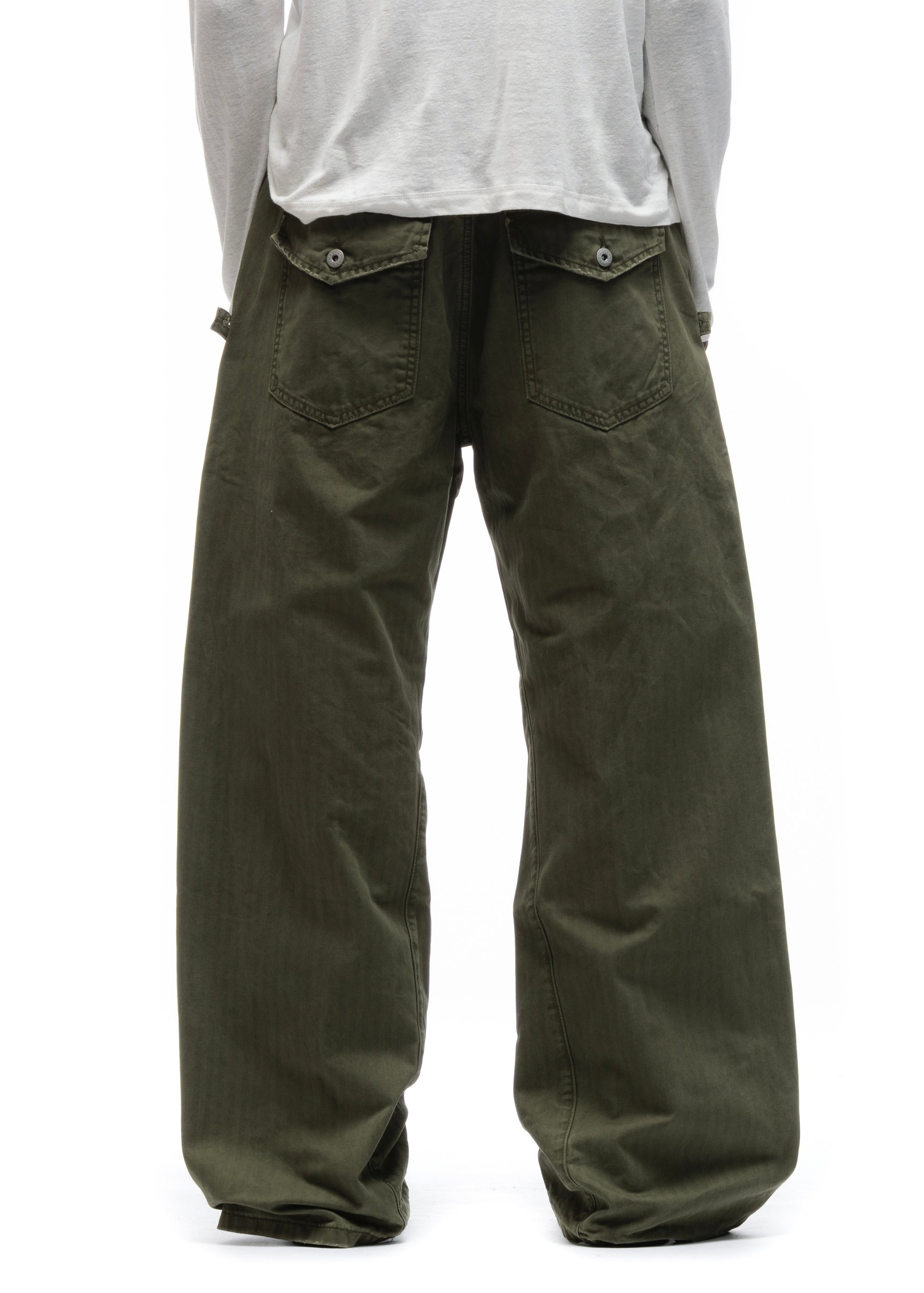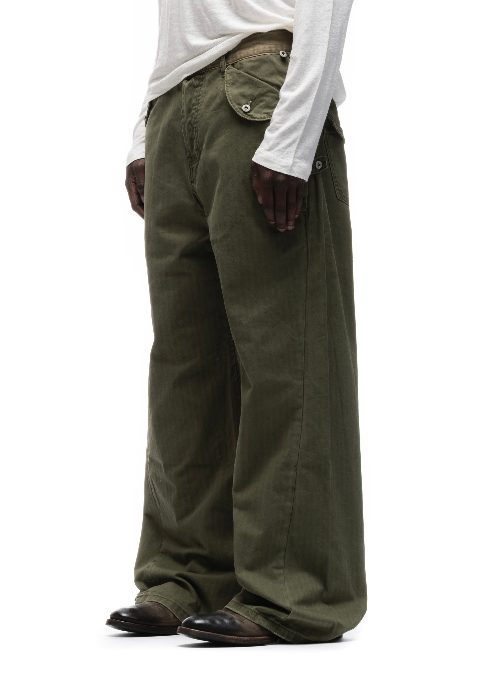 THE HERRINGBONE CUT PANTS ARE BUILT FROM A TEXTURED COTTON WITH A SUBTLE HERRINGBONE WEAVE. THEY FEATURE A WIDE, RELAXED SILHOUETTE AND DISTINCT FRONT POCKET FLAPS. THE WAISTBAND IS CONTRAST-DYED, ADDING A SMALL COLOR BREAK TO THE KHAKI BASE. A CLEAN EVERYDAY PIECE WITH A SLIGHTLY WORN-IN LOOK.