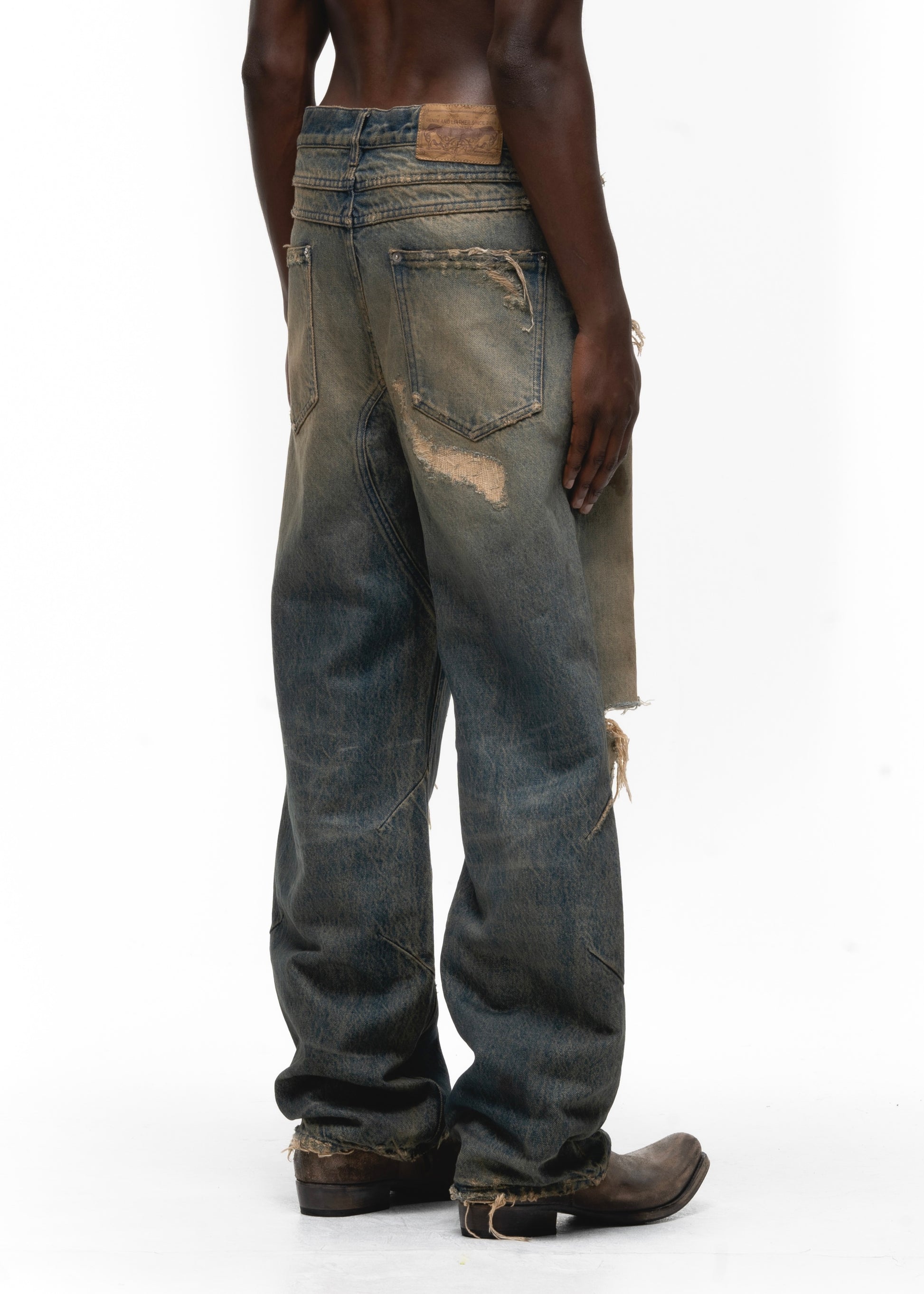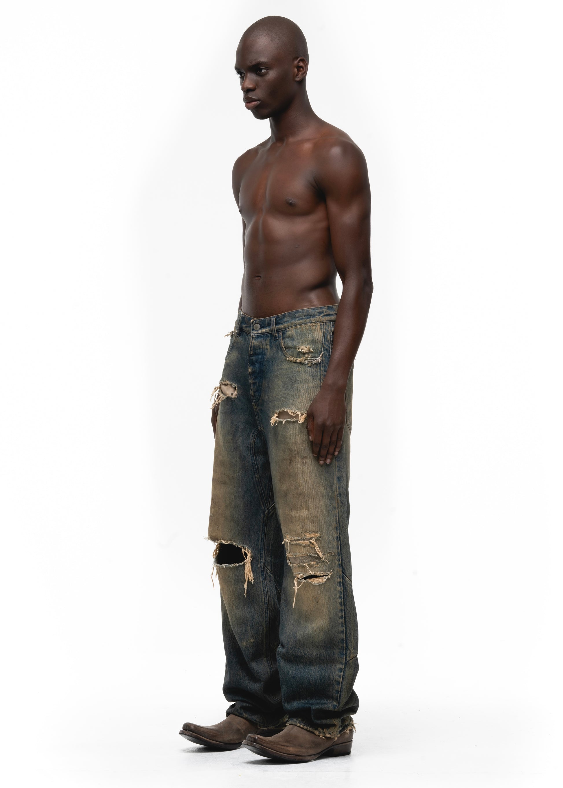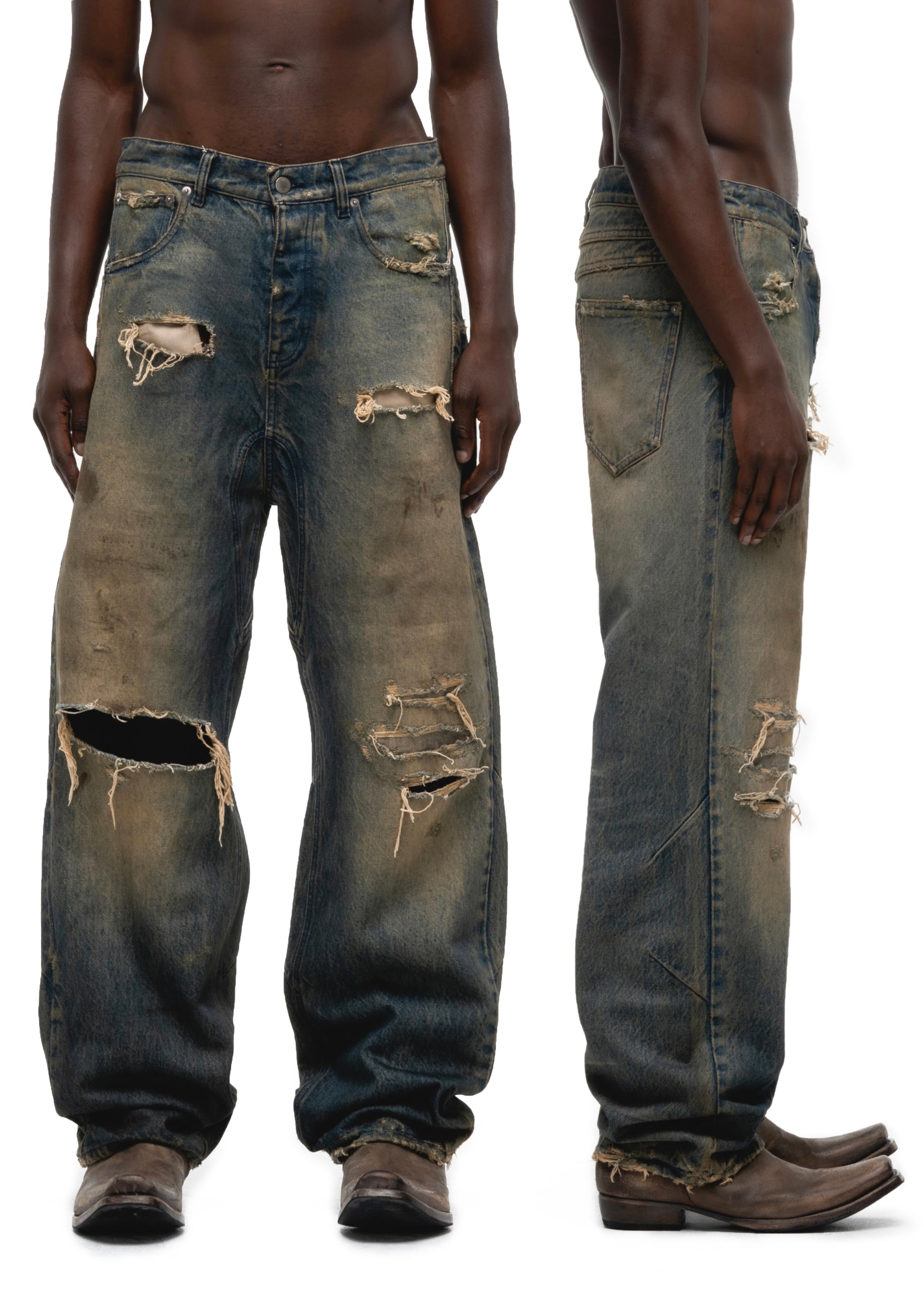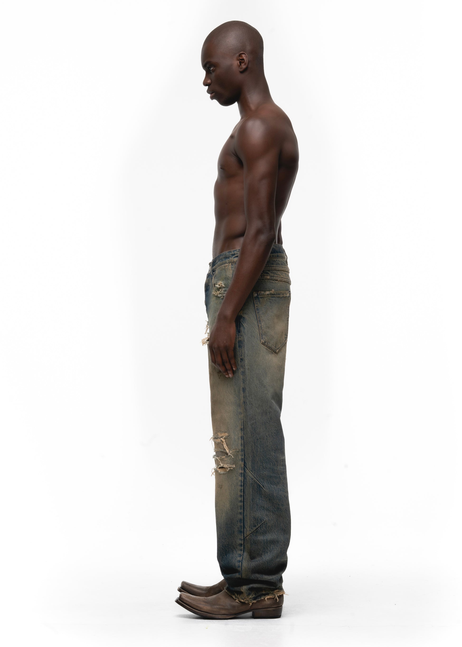 THE VENICE CUT IS AN ITALIAN 5-POCKET DENIM, BLENDING USED SUN FADE AND NATURAL EARTH TREATMENTS TO CREATE A DEEPLY TEXTURED AND WORN-IN LOOK. REPAIRED DISTRESSING AND AUTHENTICALLY AGED HOLES ADD TO ITS CHARACTER, EVOKING A STORY OF CRAFT AND HERITAGE IN EVERY DETAIL. IT FEATURES A CANVAS TAG AND A PRINTED INSIDE POCKET LINING.