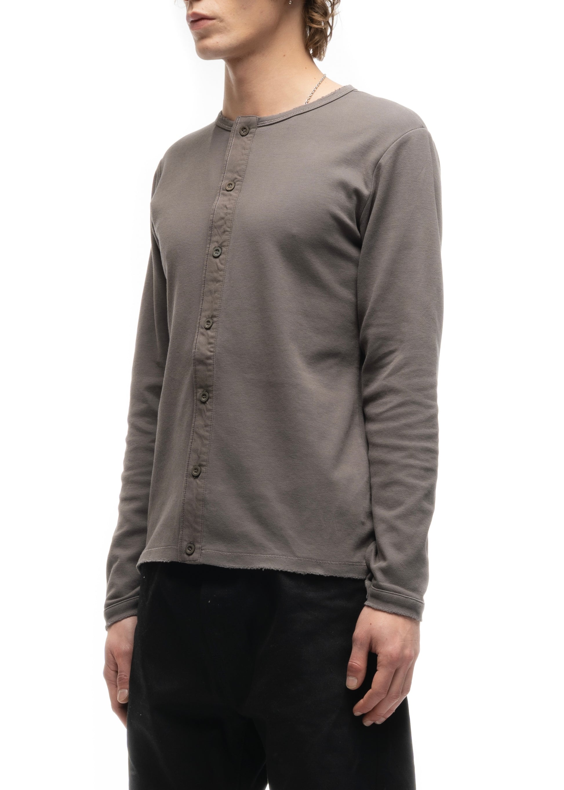 THE JAPANESE BUTTON-UP CARDIGAN IN GREY FEATURES A RELAXED FIT WITH A CLEAN BUTTON LINE. THE SLEEVE INCLUDES A BUTTONED SIDE OPENING FOR ADDITIONAL FUNCTIONAL DETAILING. THE PIECE IS MADE FROM PREMIUM COTTON AND WORKS AS A SIMPLE EVERYDAY LAYER.