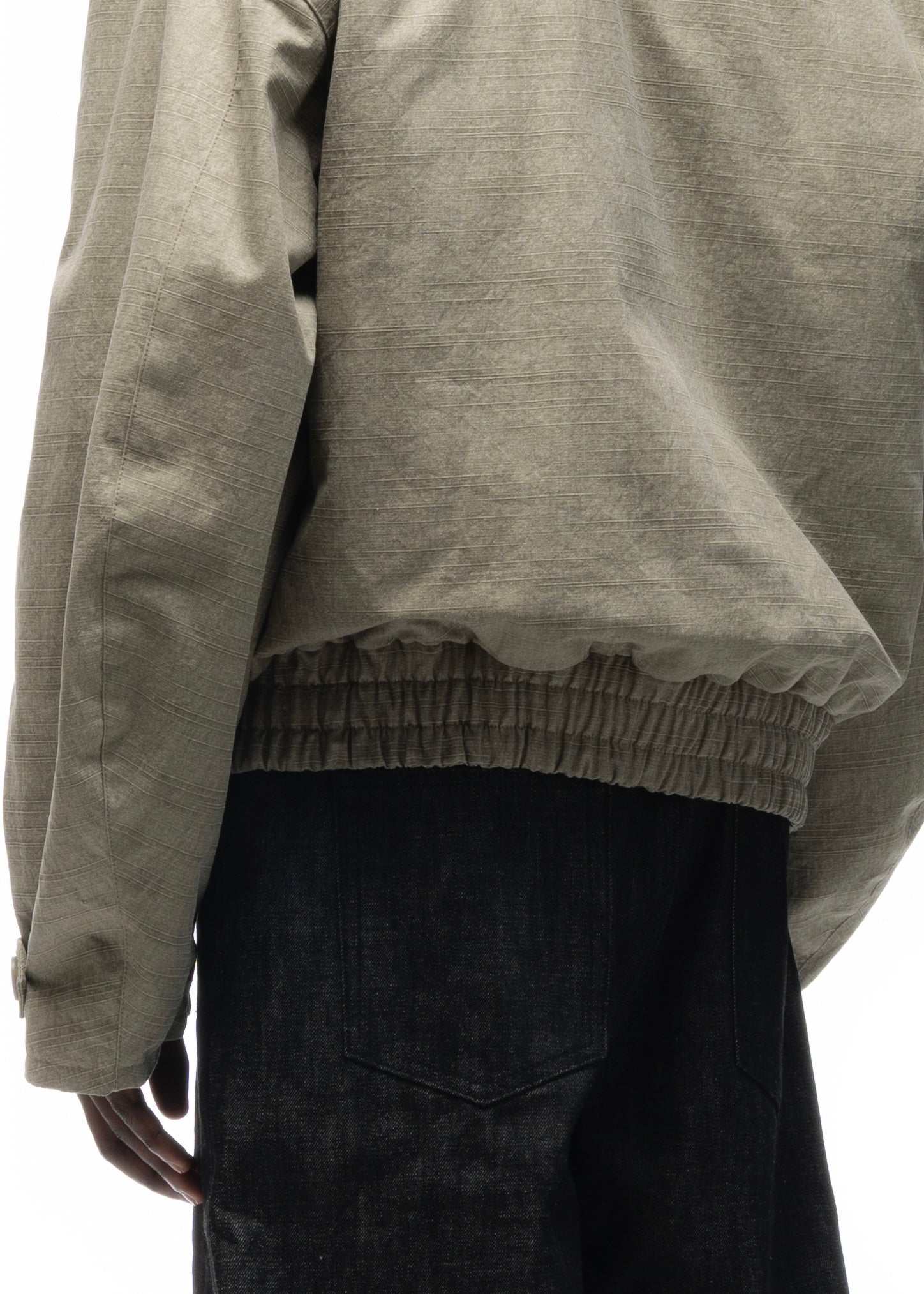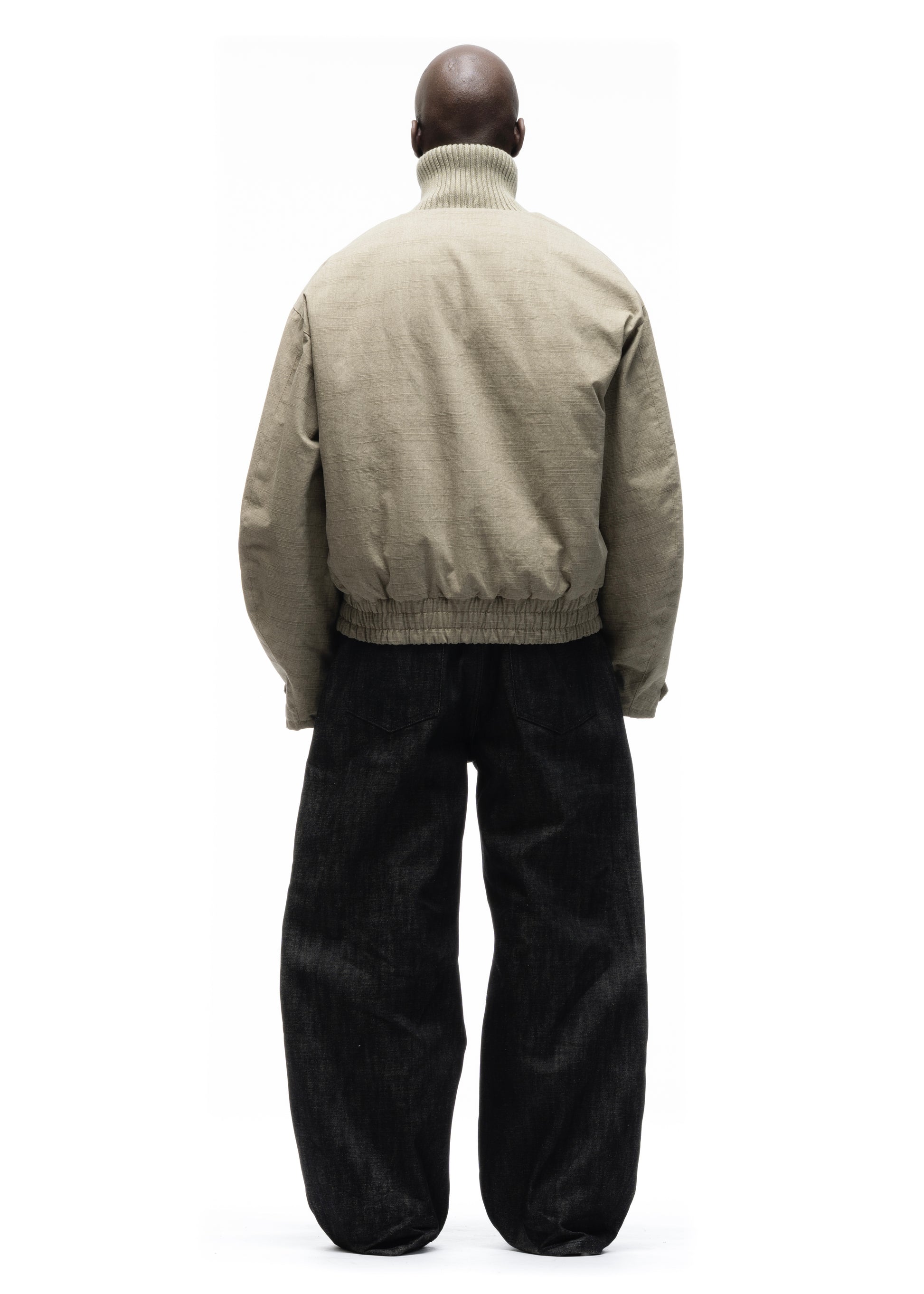 THE JAPANESE PADDED BOMBER JACKET IS MADE FROM A STRUCTURED WORKWEAR-COTTON FABRIC WITH A DISTINCT, TEXTURED SURFACE. A WIDE RIBBED COLLAR DEFINES THE SHAPE AND GIVES THE PIECE ITS SIGNATURE LOOK. THE ASYMMETRICAL CUT ADDS CHARACTER, WHILE THE FLAP ON THE SLEEVE ALLOWS FOR A SIMPLE WIDTH ADJUSTMENT.
