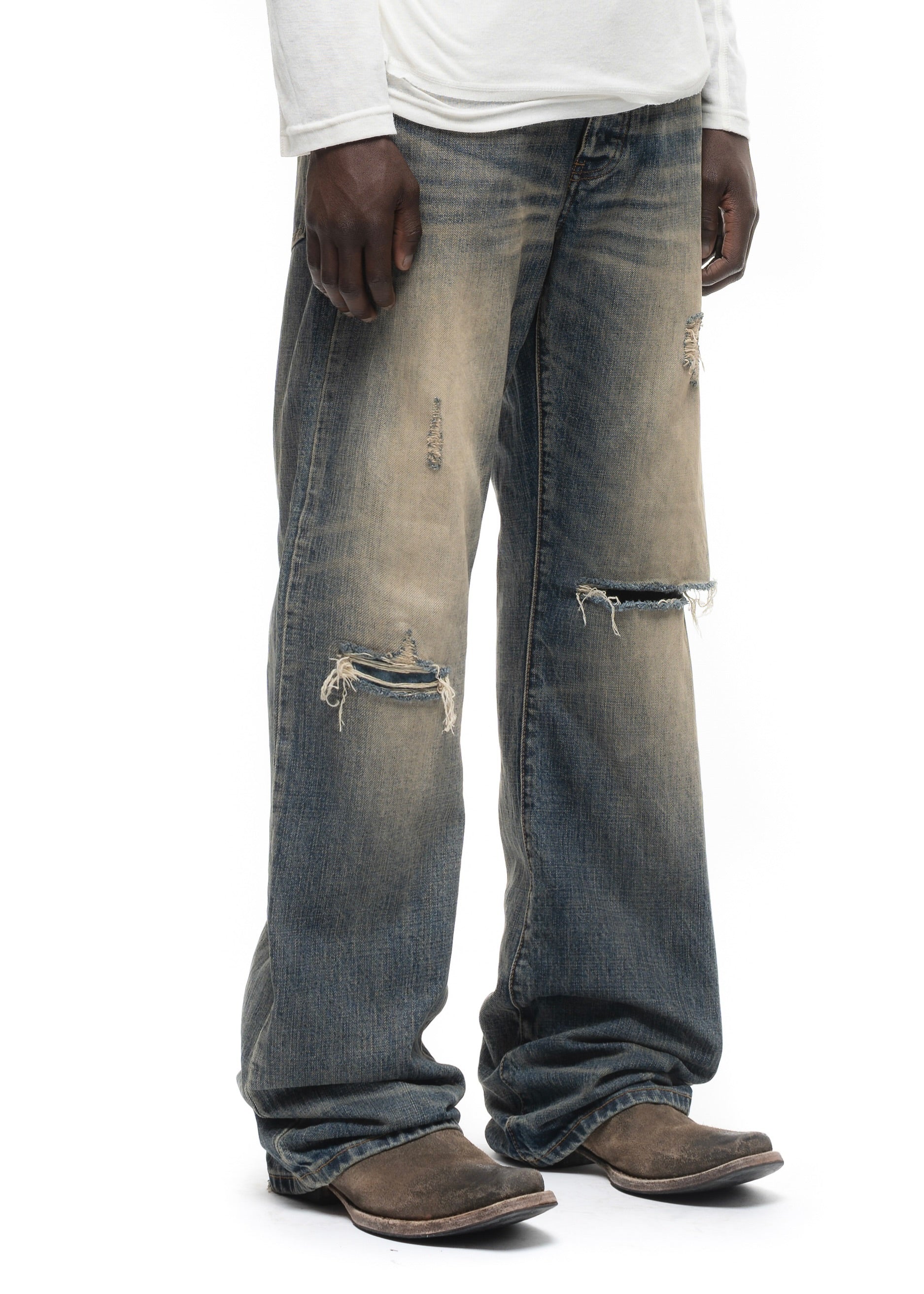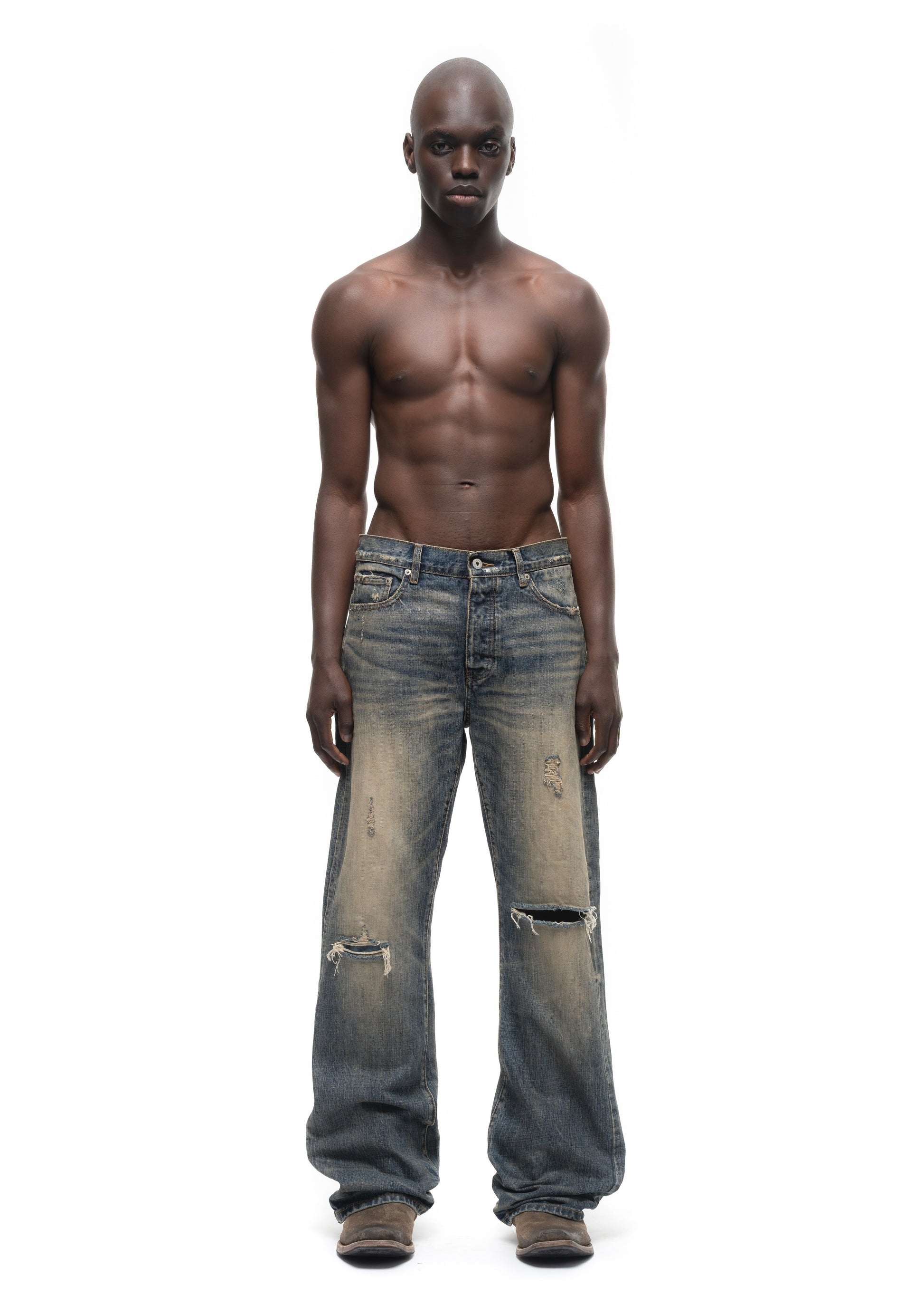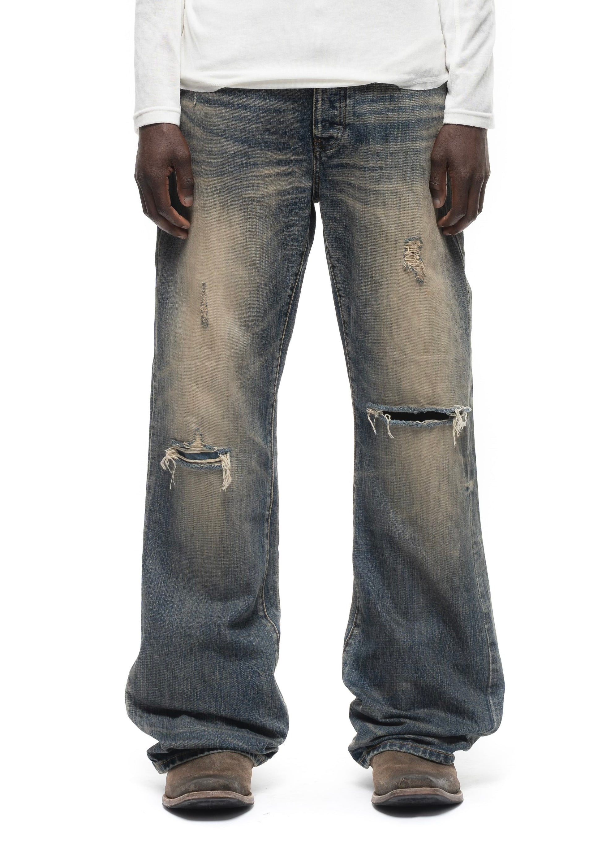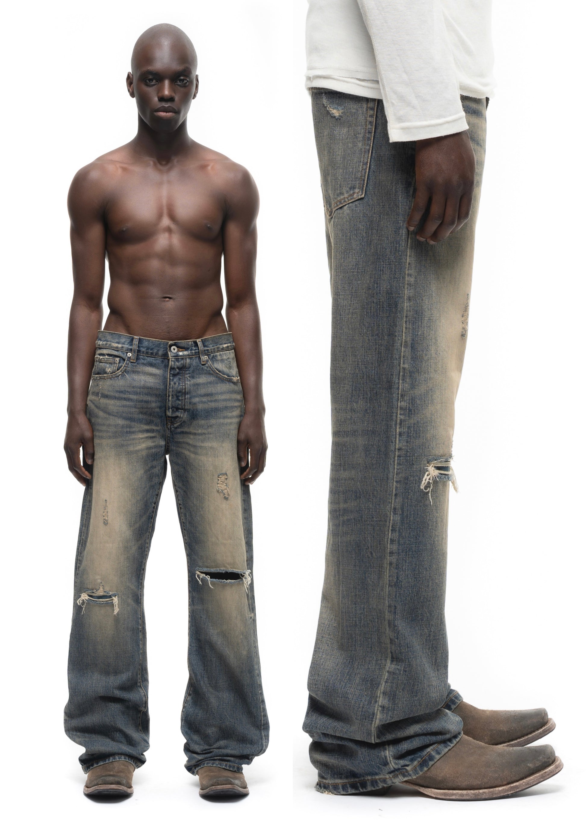 A BOOT CUT DENIM WITH A SUN-FADED WASH THAT HIGHLIGHTS THE THIGHS AND SEAMS. SUBTLE DISTRESSING ADDS DEPTH WHILE MAINTAINING A CLEAN, ELONGATED SHAPE.