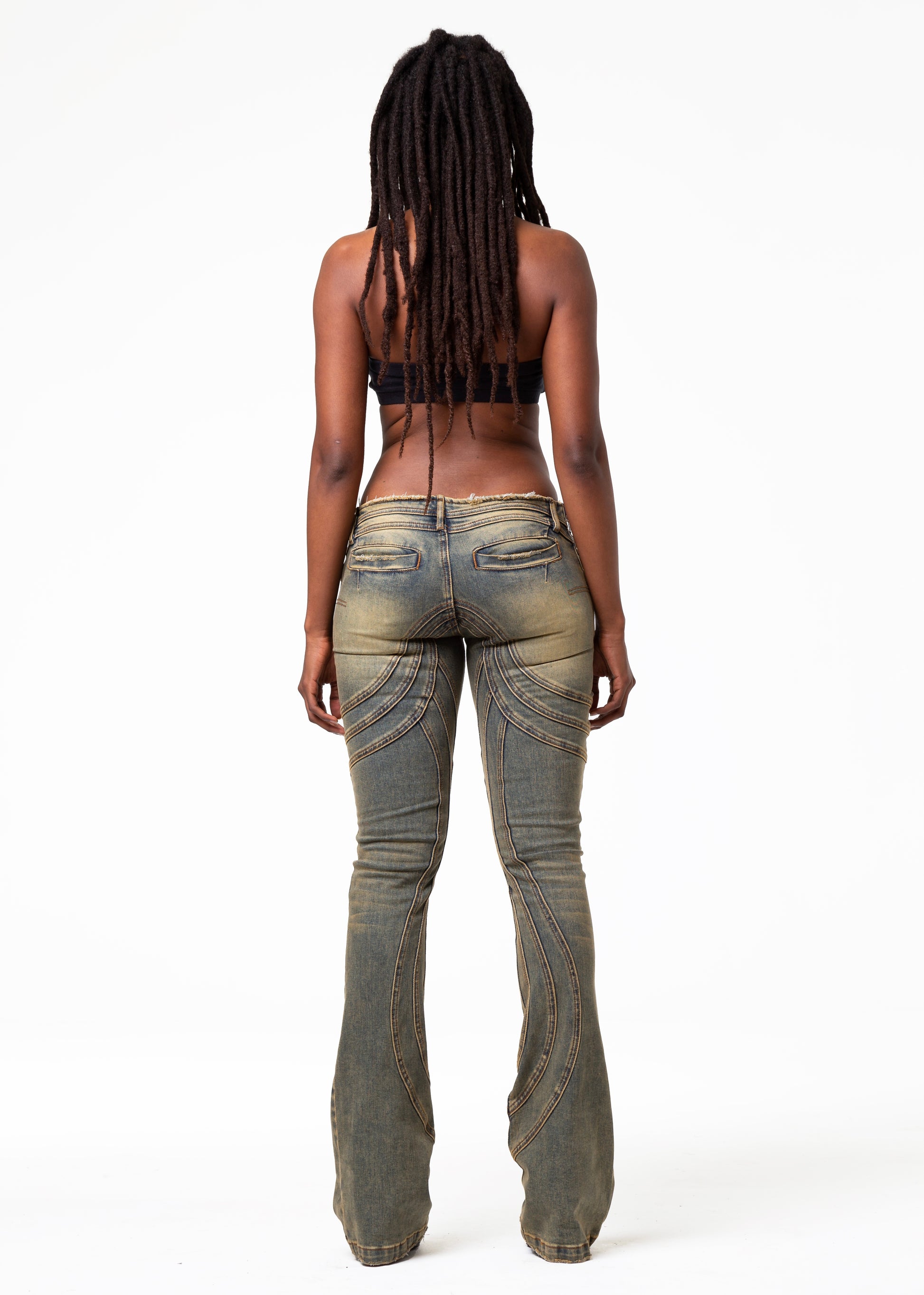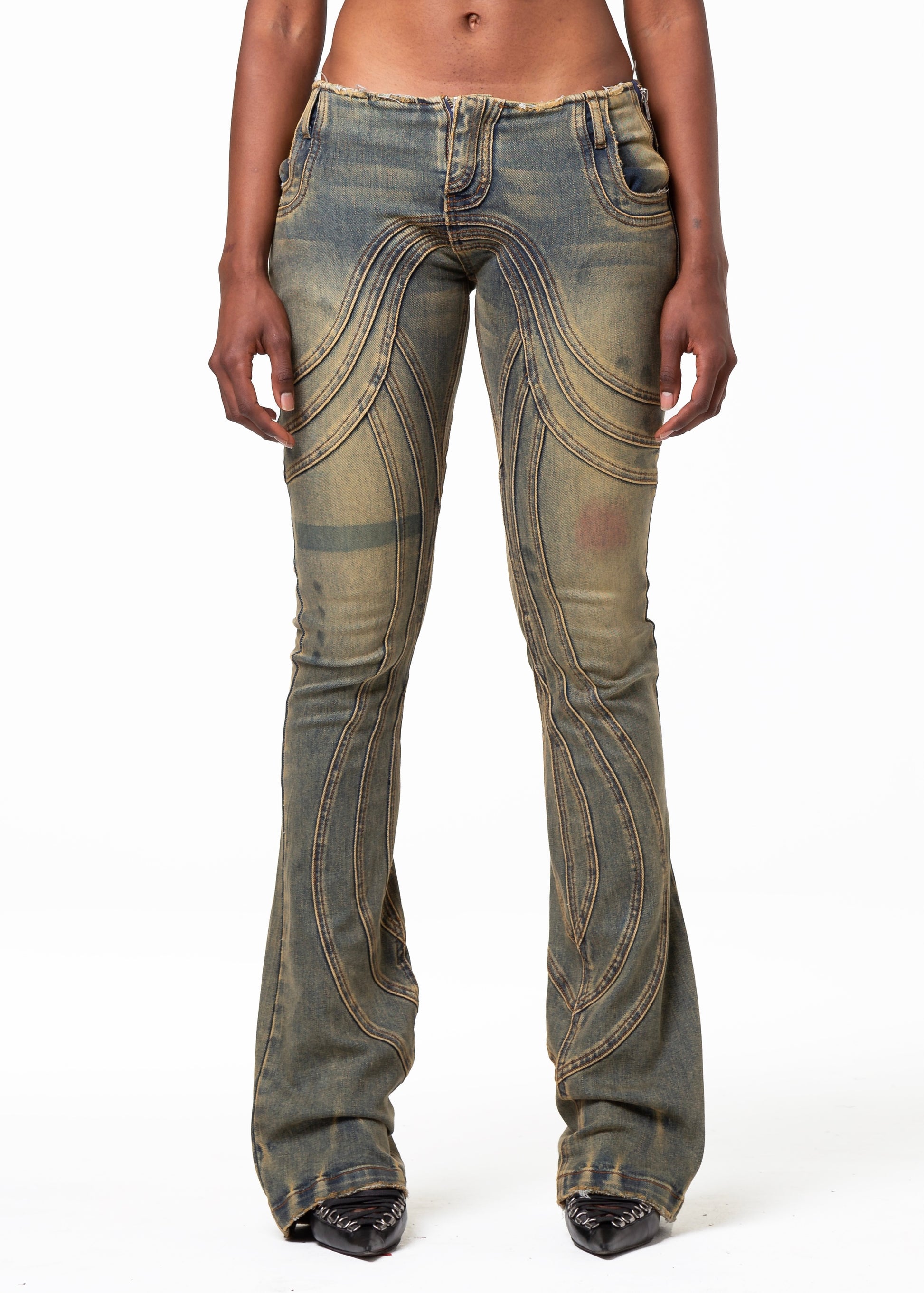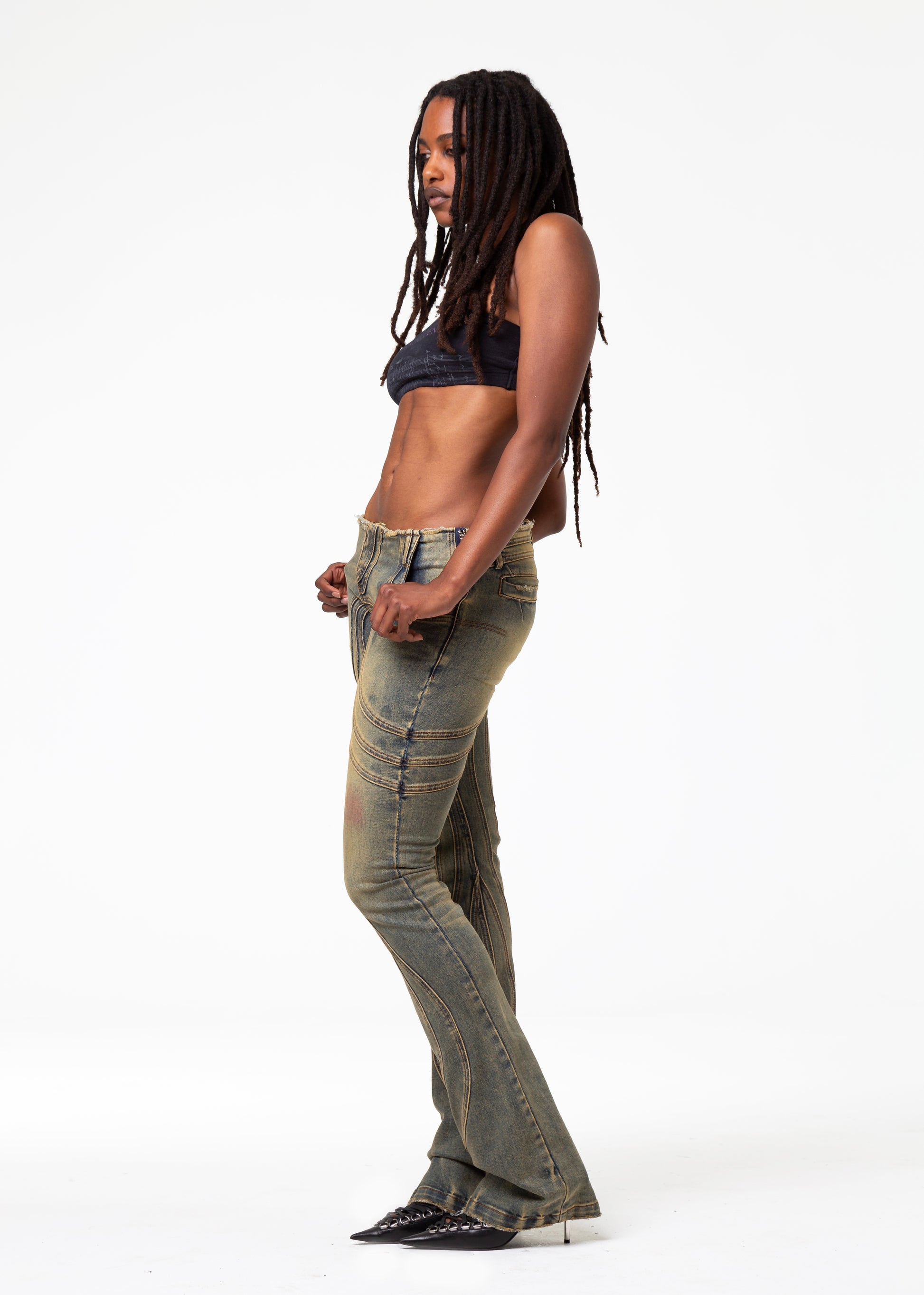 THE LOW WAISTED DENIM FEATURES A LOW-RISE FIT WITH A SLIGHT BOOT-CUT SILHOUETTE. EACH PIECE COMES WITH A HANDMADE WASH AND USED EFFECT, MAKING EVERY PAIR UNIQUE. FINISHED WITH REFINED DETAILS AND A YKK ZIPPER. AVAILABLE IN LIMITED STOCK.