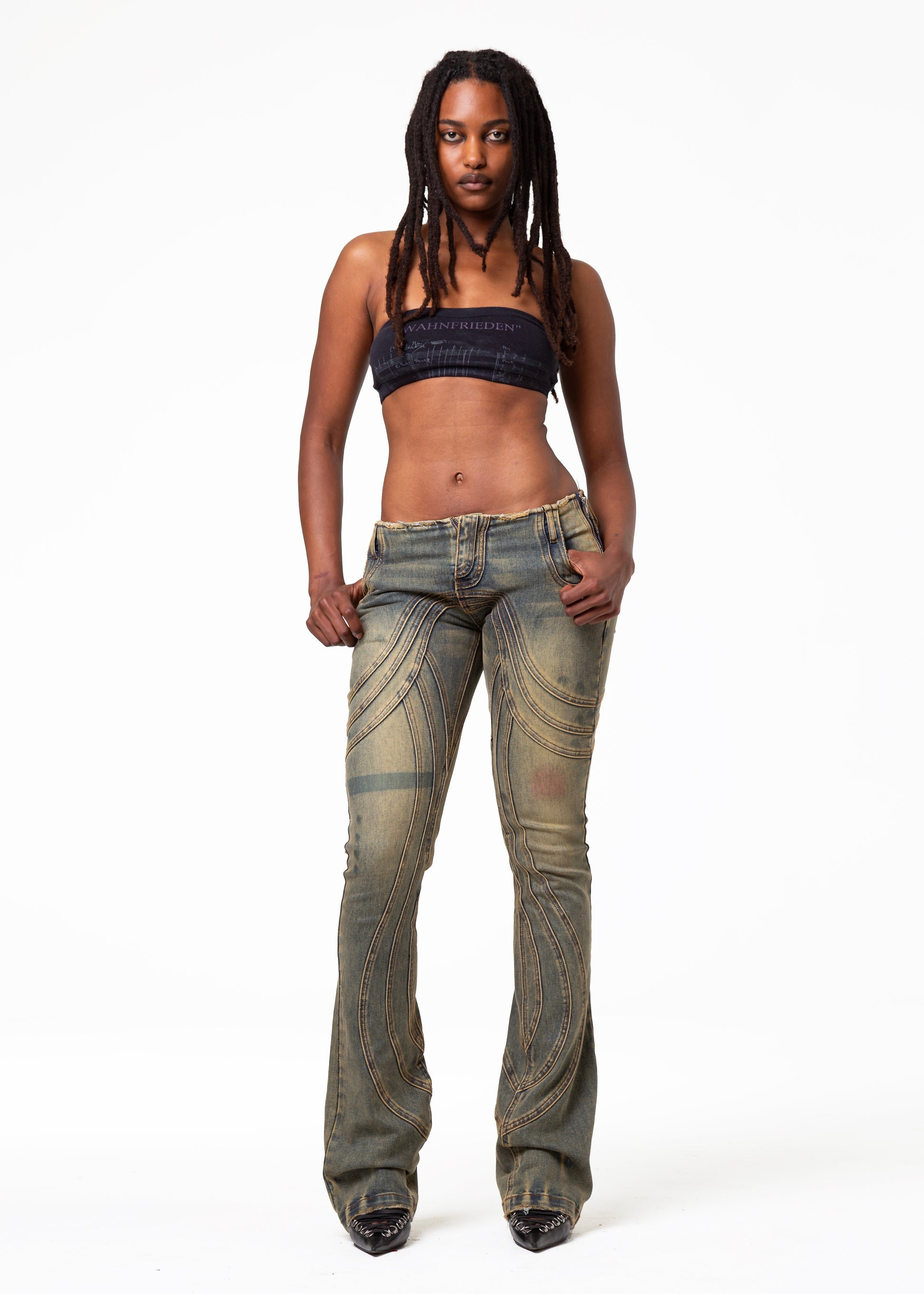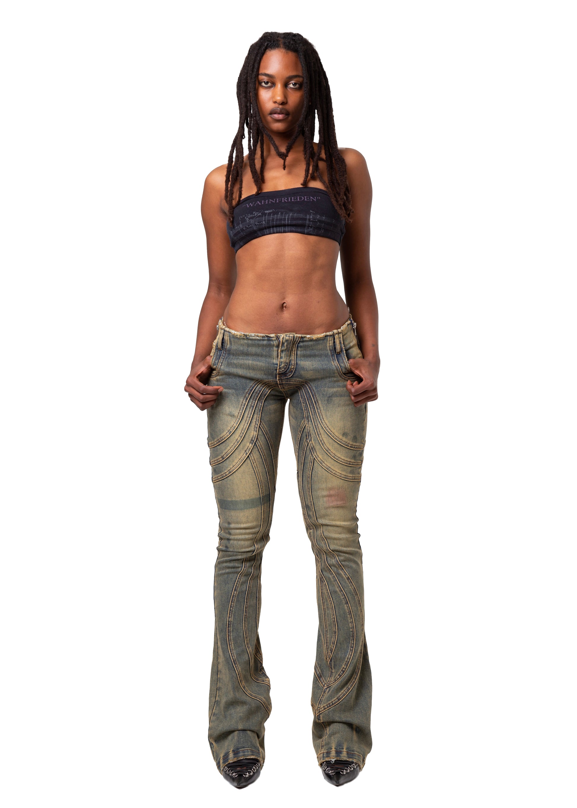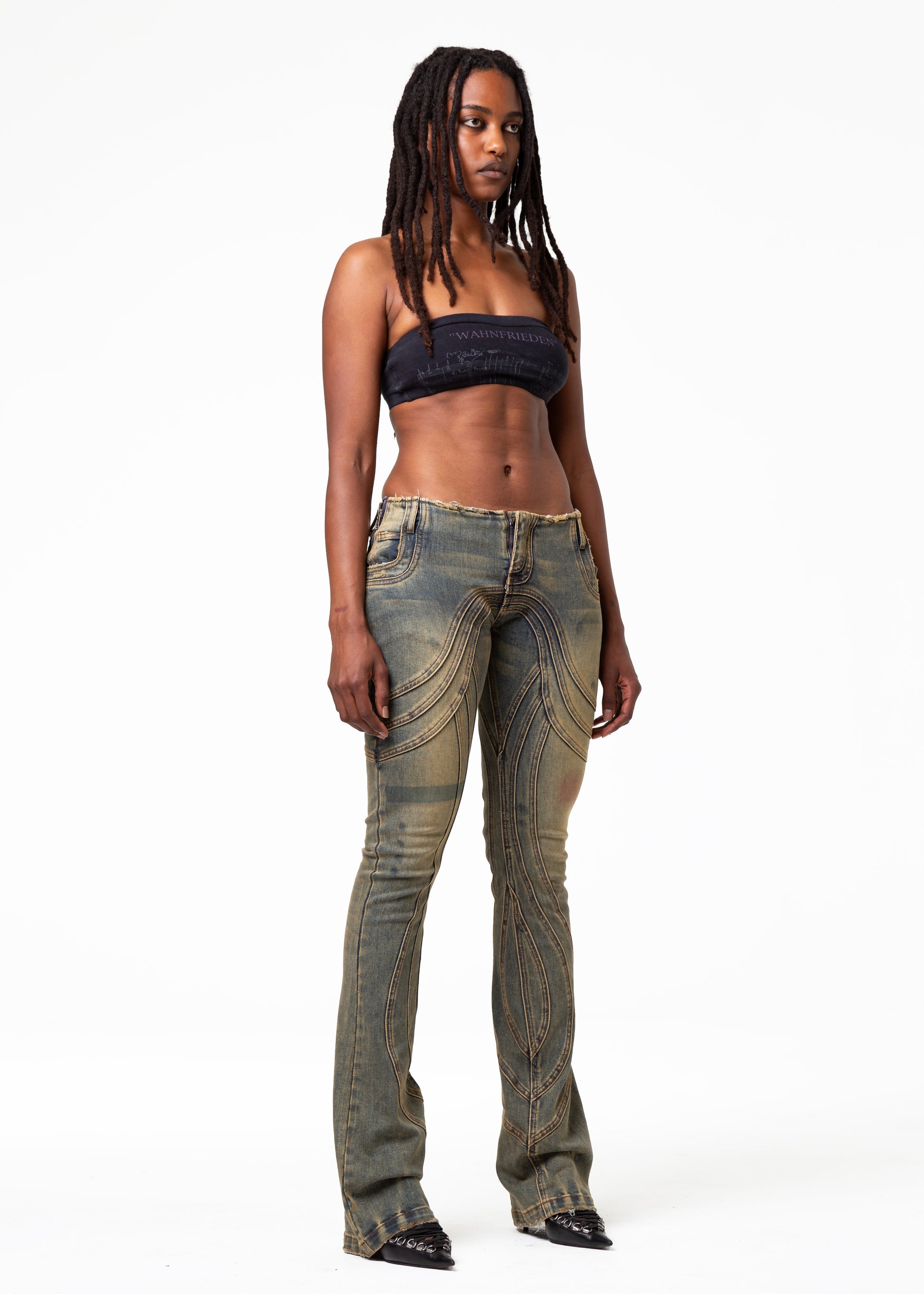 THE LOW WAISTED DENIM FEATURES A LOW-RISE FIT WITH A SLIGHT BOOT-CUT SILHOUETTE. EACH PIECE COMES WITH A HANDMADE WASH AND USED EFFECT, MAKING EVERY PAIR UNIQUE. FINISHED WITH REFINED DETAILS AND A YKK ZIPPER. AVAILABLE IN LIMITED STOCK.