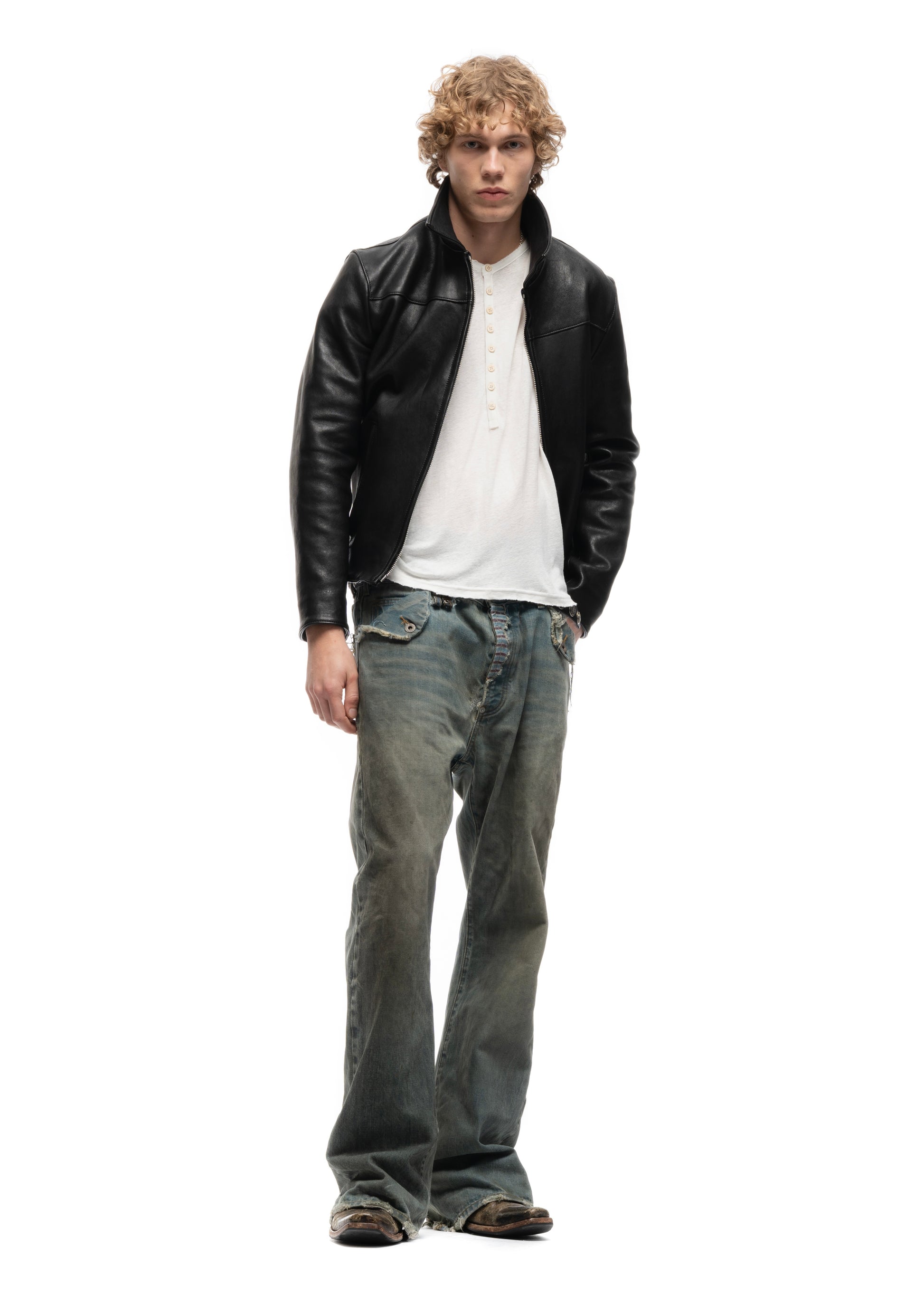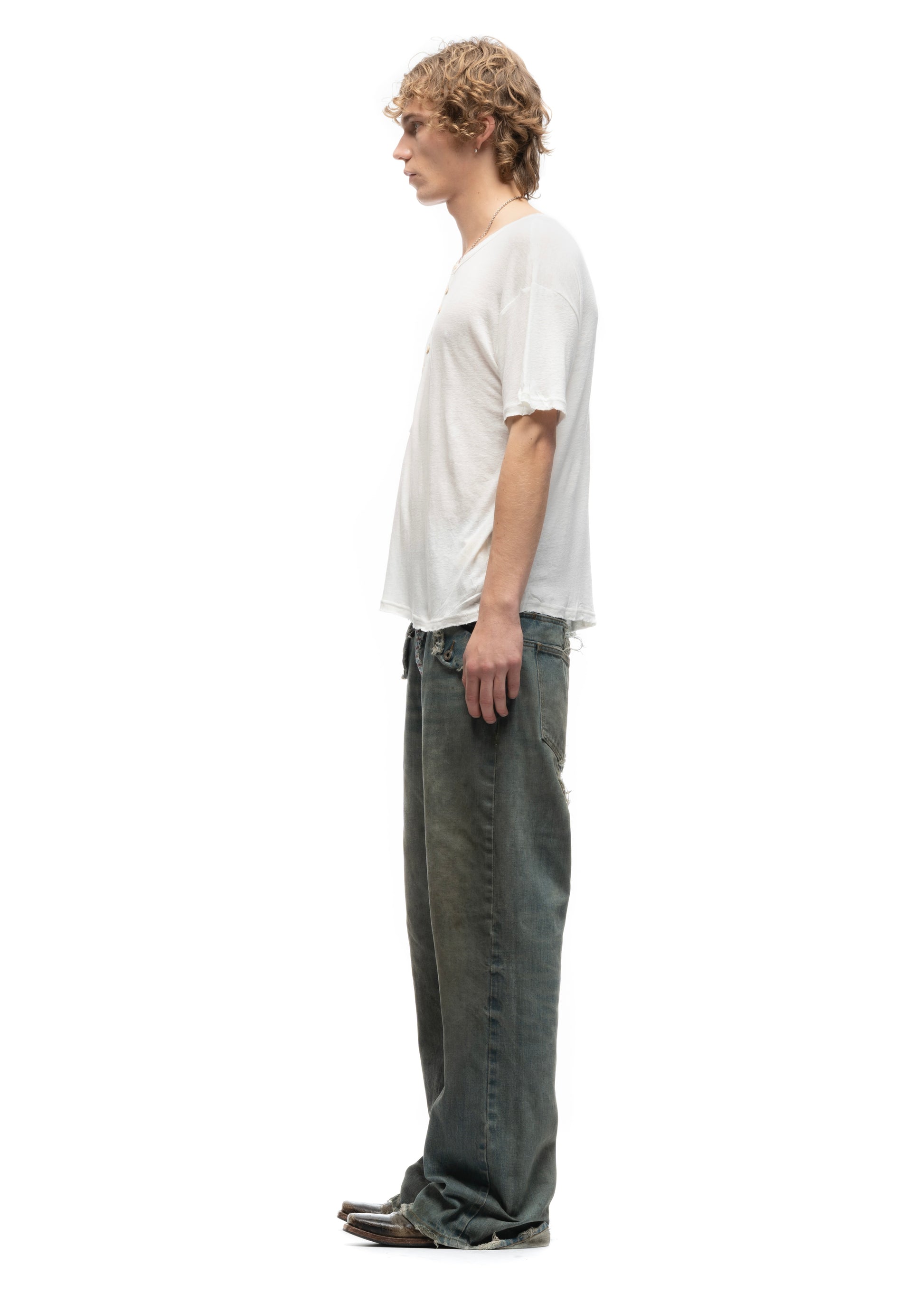 THE MESSAGE BUTTON UP T-SHIRT IN WHITE FEATURES A RELAXED FIT WITH A ROW OF SMALL WOODEN BUTTONS SET ON A NARROW PLACKET. THE BACK INSIDE CARRIES A PRINTED TEXT DETAIL, ADDING A SUBTLE INTERNAL MESSAGE. THE LIGHTLY DISTRESSED SURFACE GIVES THE T-SHIRT A SIMPLE, WORN-IN LOOK.