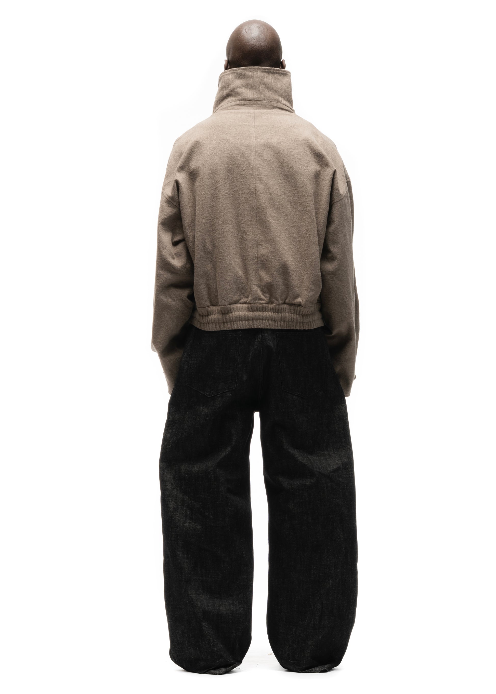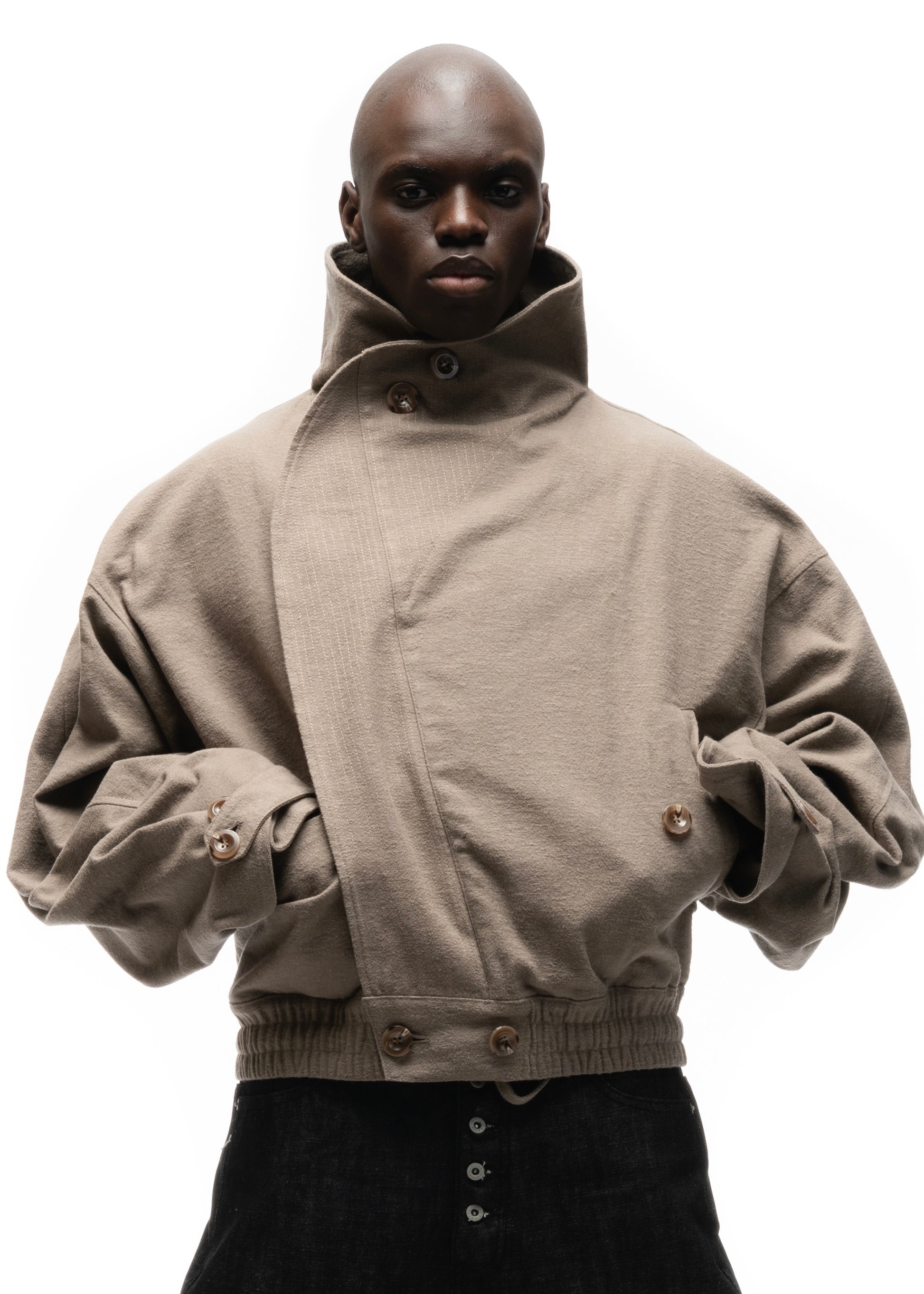 THE MOLESKIN JACKET COMES WITH A ROUNDED ASYMMETRICAL FLAP FEATURING VISIBLE STITCHING, TAKING CUES FROM VINTAGE FLIGHT BOMBER CONSTRUCTION. THE PIECE IS CUT FROM HEAVY MOLESKIN COTTON, GIVING IT A CLEAN, STRUCTURED SHAPE WITH A SOFT, MATTE SURFACE. THE BEIGE COLORWAY OFFERS A NEUTRAL LOOK SUITABLE FOR EVERYDAY WEAR.