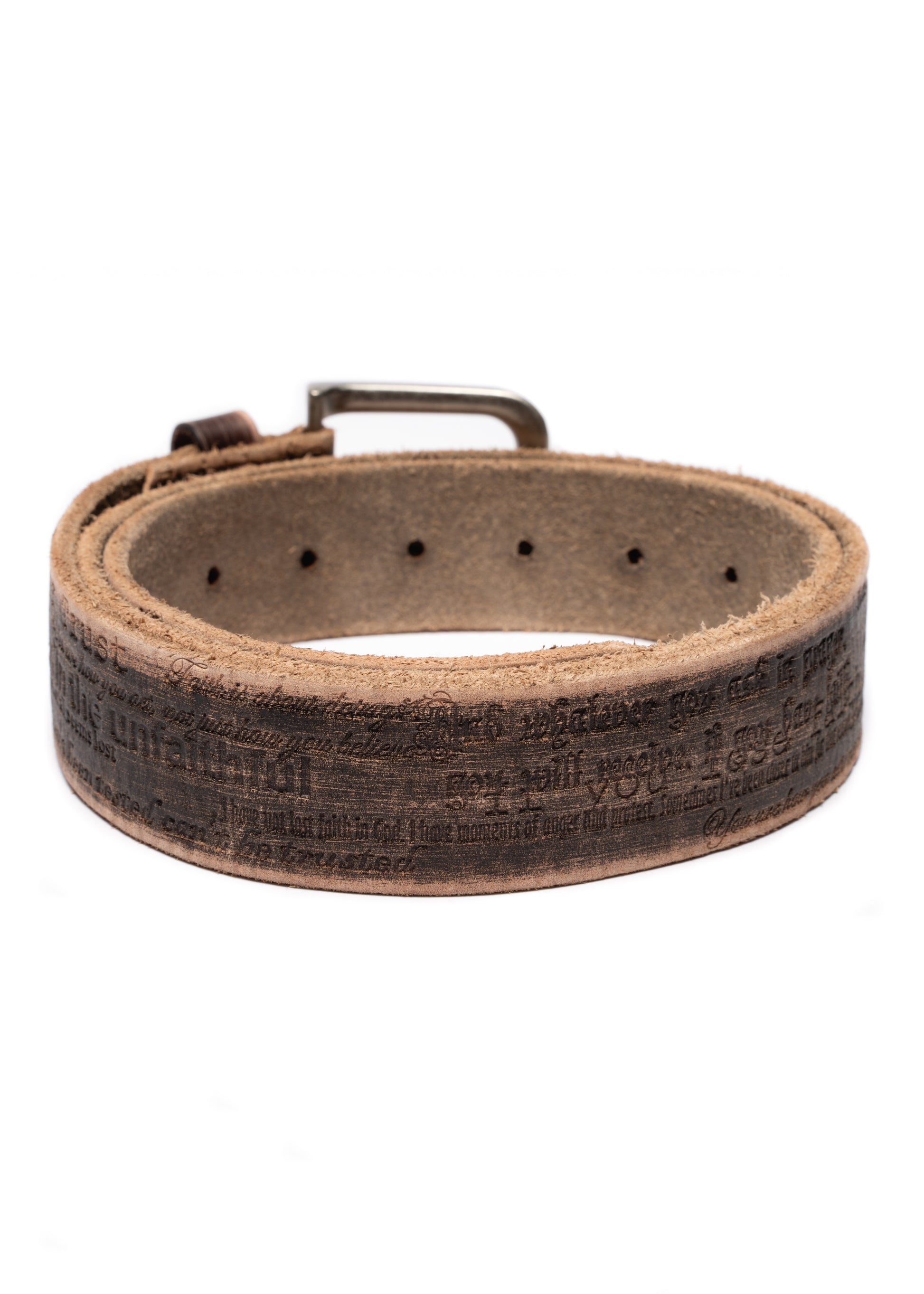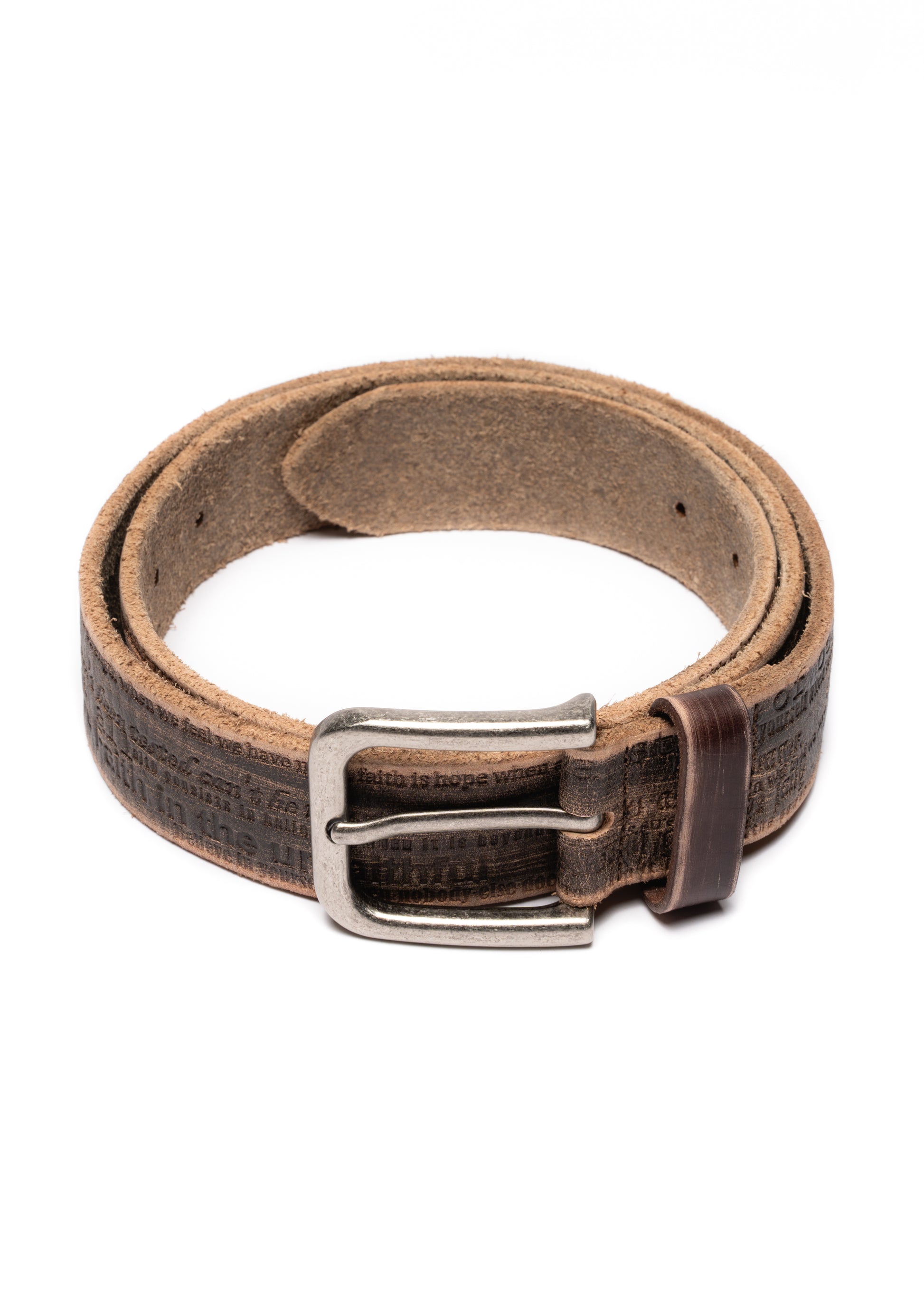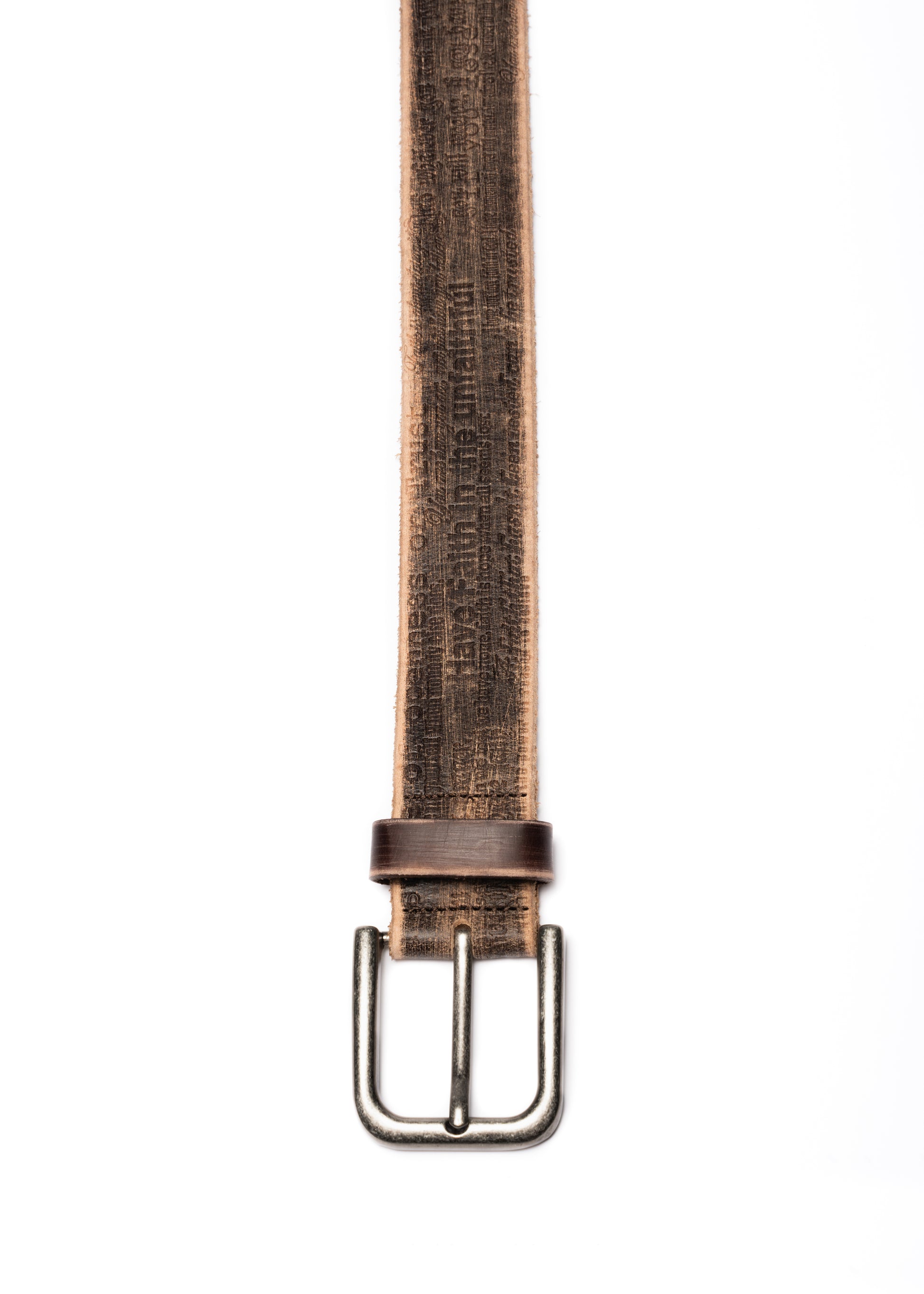 CRAFTED FROM PREMIUM COW LEATHER IN A VINTAGE BROWN FINISH, THE CIPHER BELT FEATURES AN ALL-OVER EMBOSSED CIPHER PATTERN THAT ADDS A SUBTLE, TEXTURAL DEPTH TO THE STRAP. A DARKENED METAL BUCKLE COMPLETES THE PIECE WITH A CLEAN, INDUSTRIAL TONE.