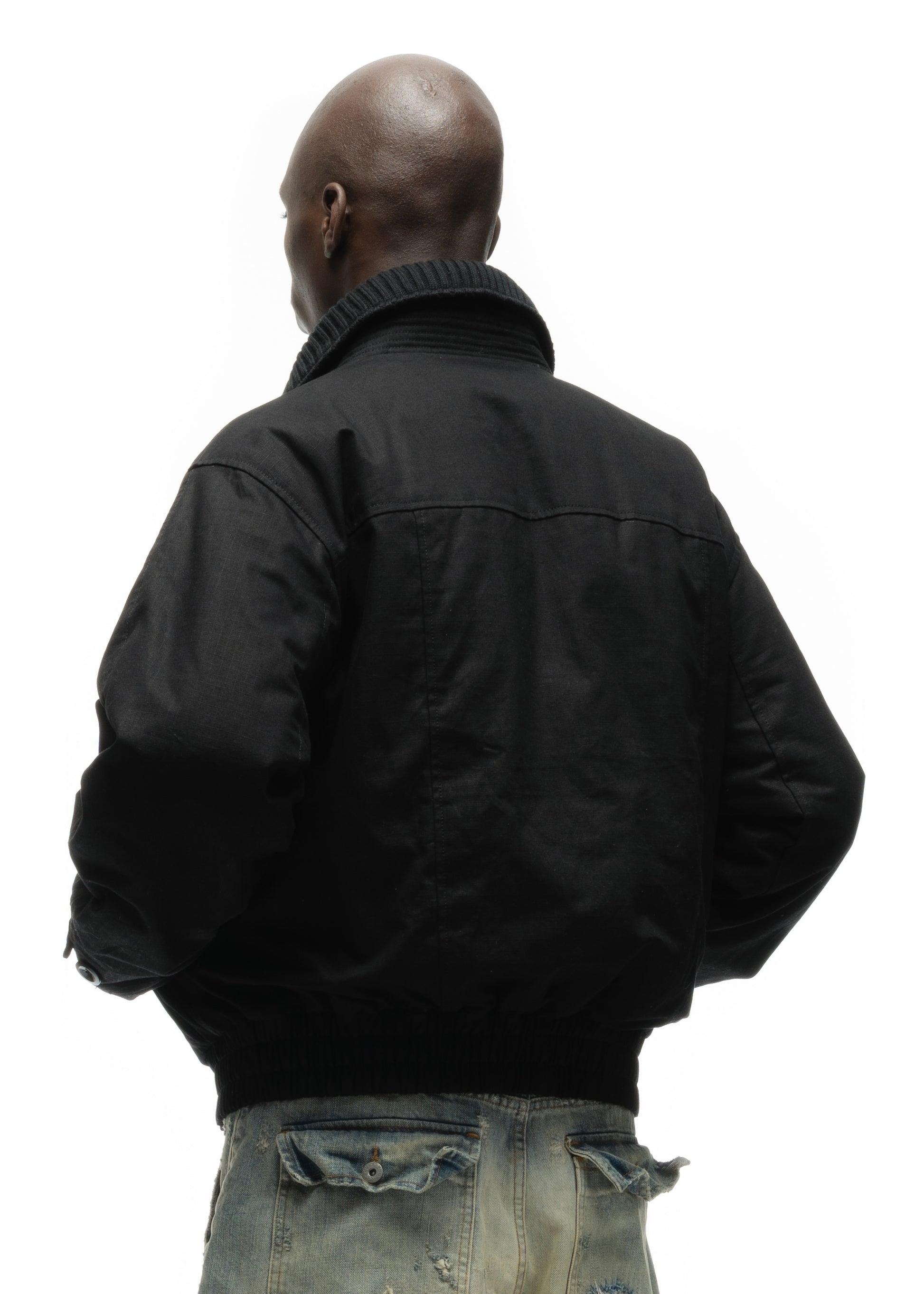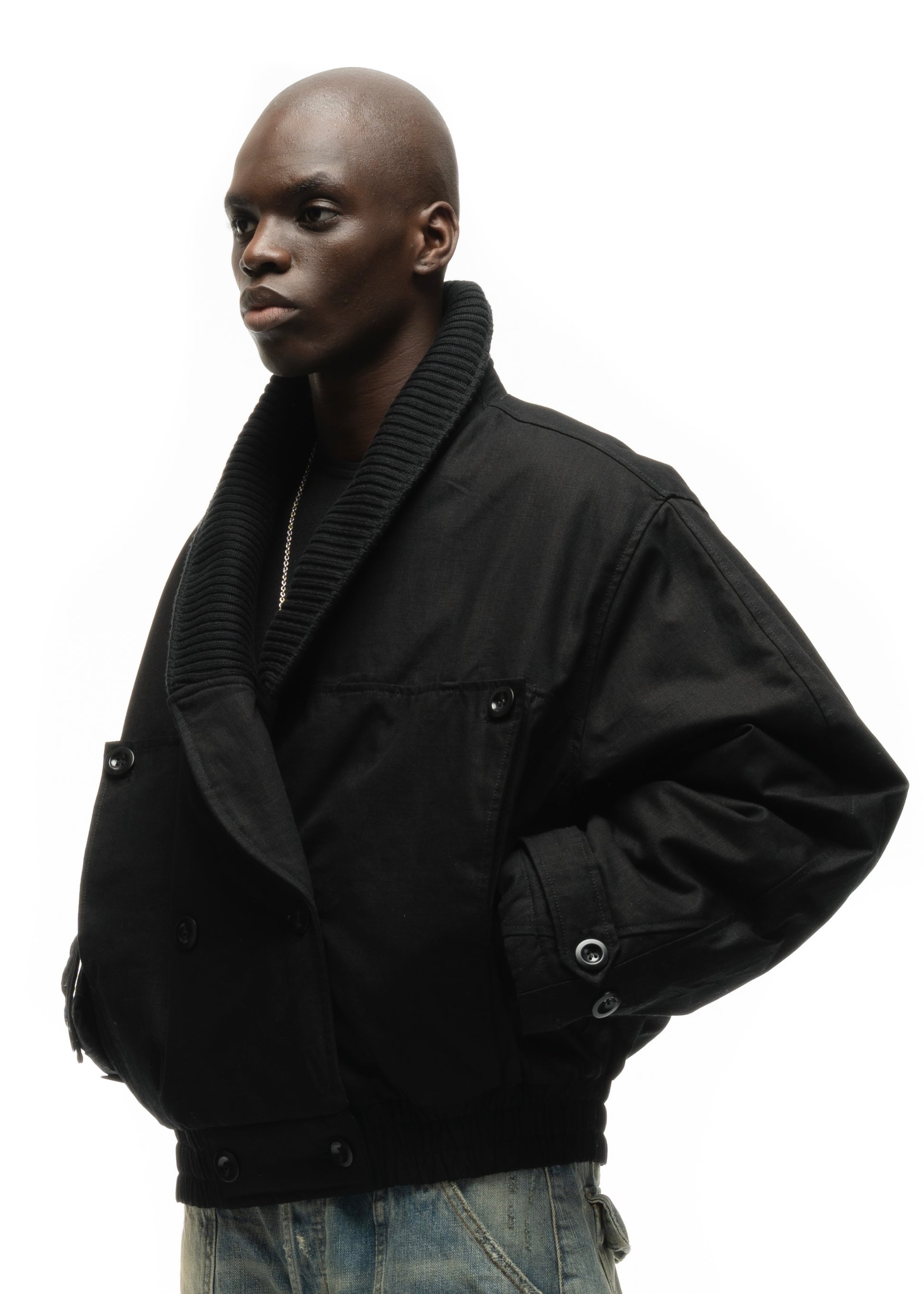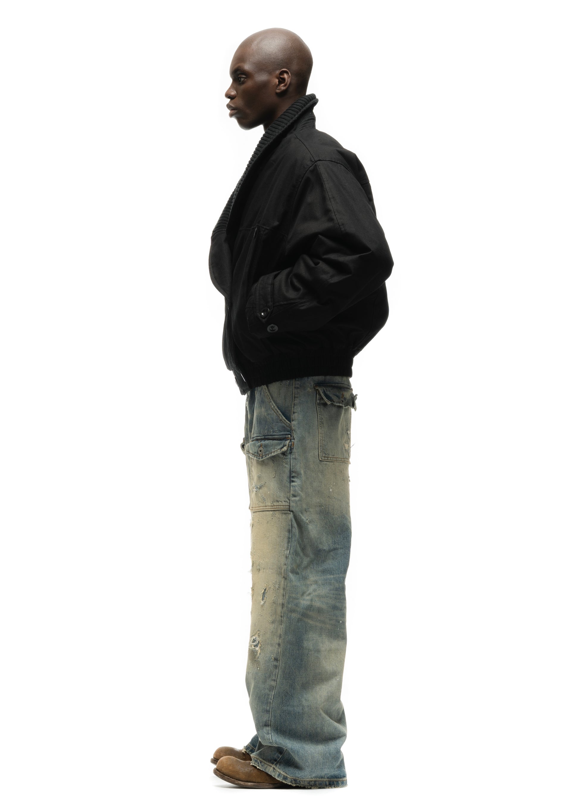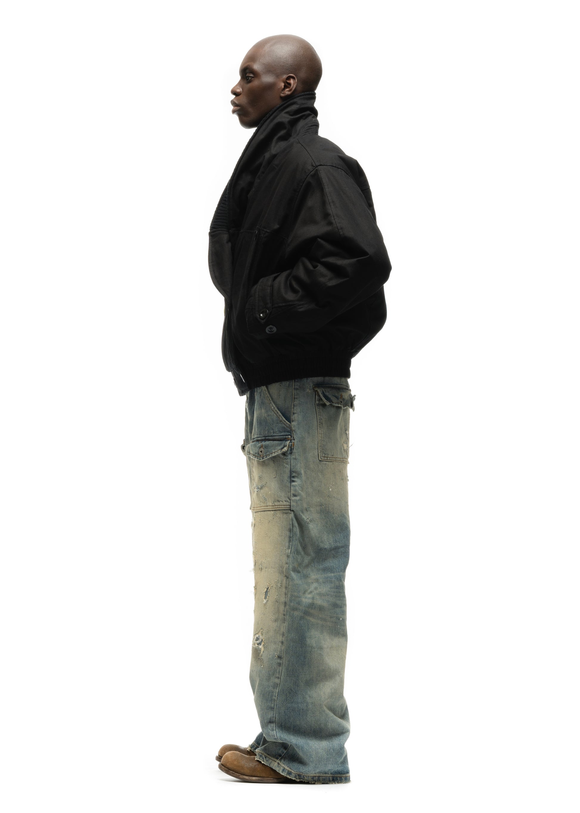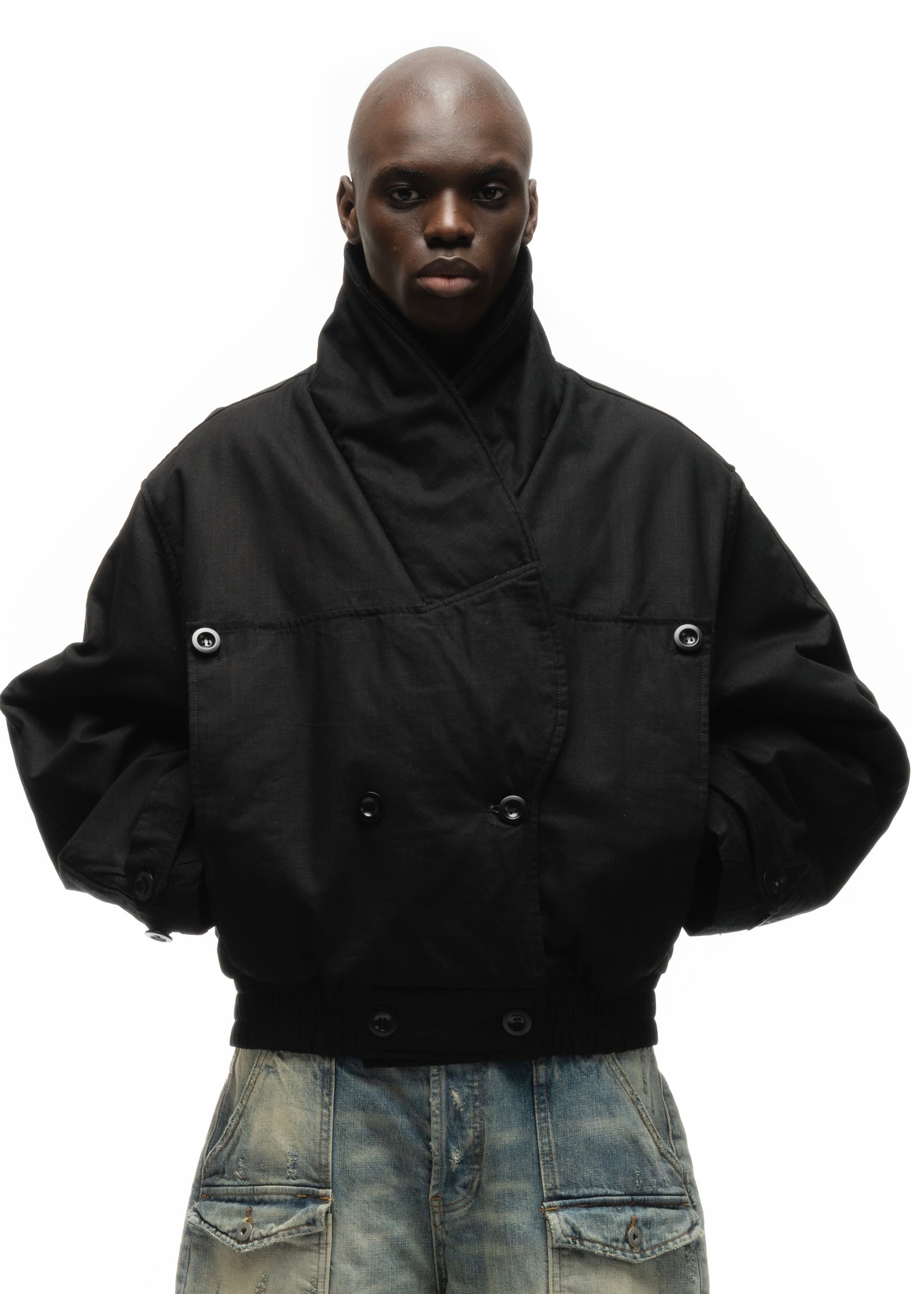 THE PILOT BUTTON BOMBER JACKET IS CONSTRUCTED FROM A STRUCTURED WORKWEAR FABRIC AND FEATURES A WIDE RIBBED COTTON COLLAR INSPIRED BY CLASSIC PILOT STYLES. THE ASYMMETRIC BUTTON CLOSURE AND DROPPED SHOULDER LINE CREATE A DISTINCT, VOLUMINOUS SHAPE. FINISHED WITH ADJUSTABLE CUFF BUTTONS AND A CROPPED BOMBER SILHOUETTE, THE PIECE BLENDS FLIGHTWEAR REFERENCES WITH A MODERN, RELAXED BUILD.