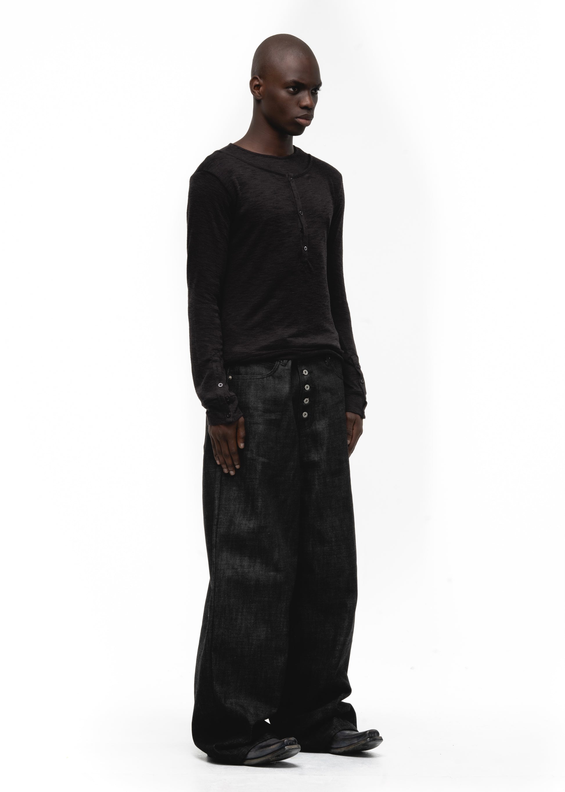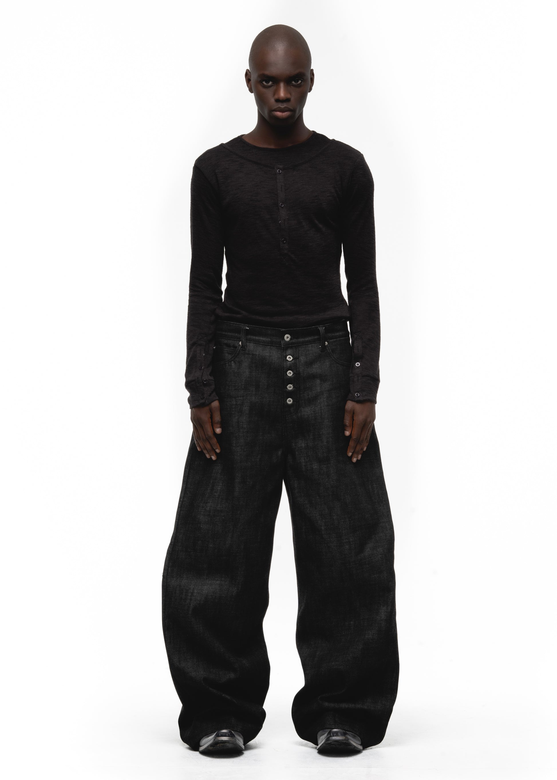 THESE LOOSE-FIT SELVEDGE JEANS ARE MADE FROM AUTHENTIC JAPANESE RAW DENIM, OFFERING COMFORT AND A RELAXED SILHOUETTE. THE VISIBLE BUTTON FLY ADDS A TOUCH OF VINTAGE APPEAL, REFLECTING THE ORIGINAL CLOSURE STYLE OF EARLY JEANS.