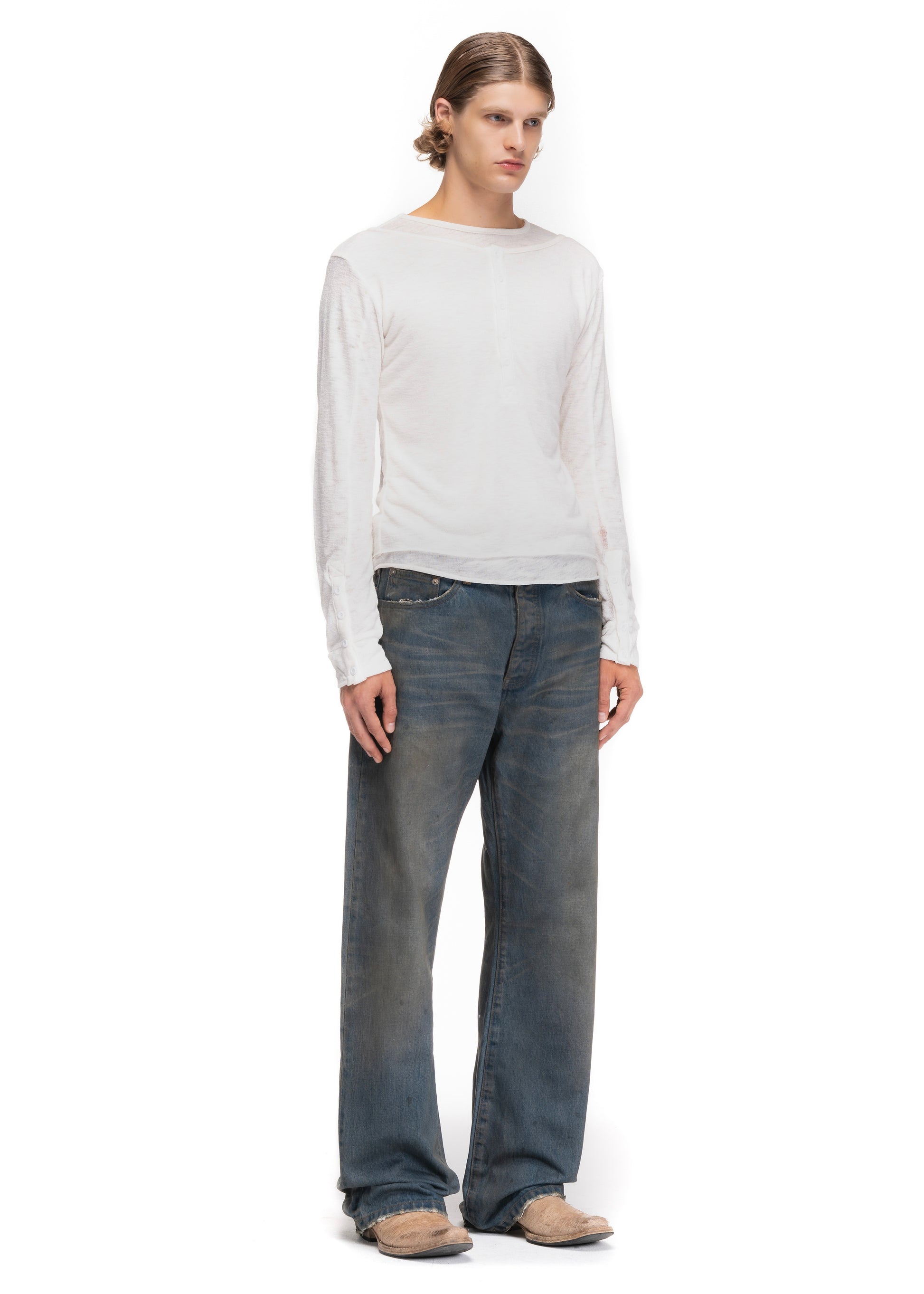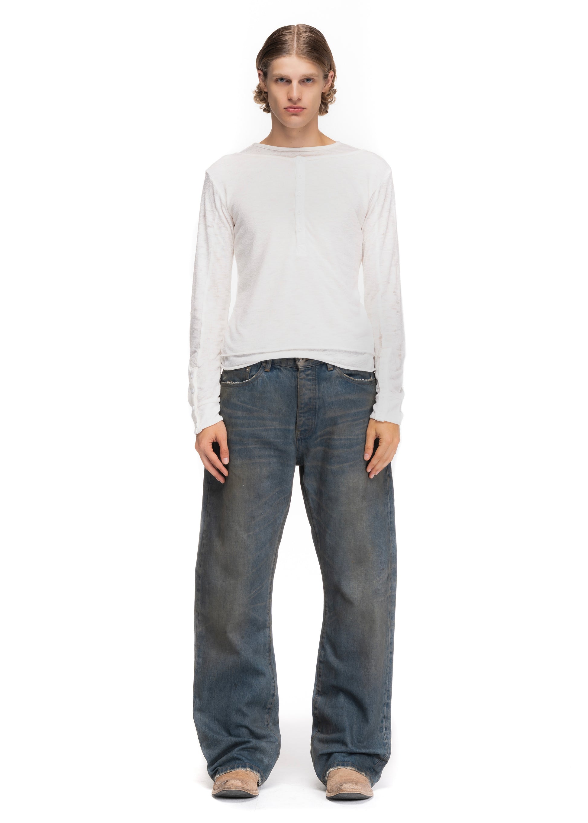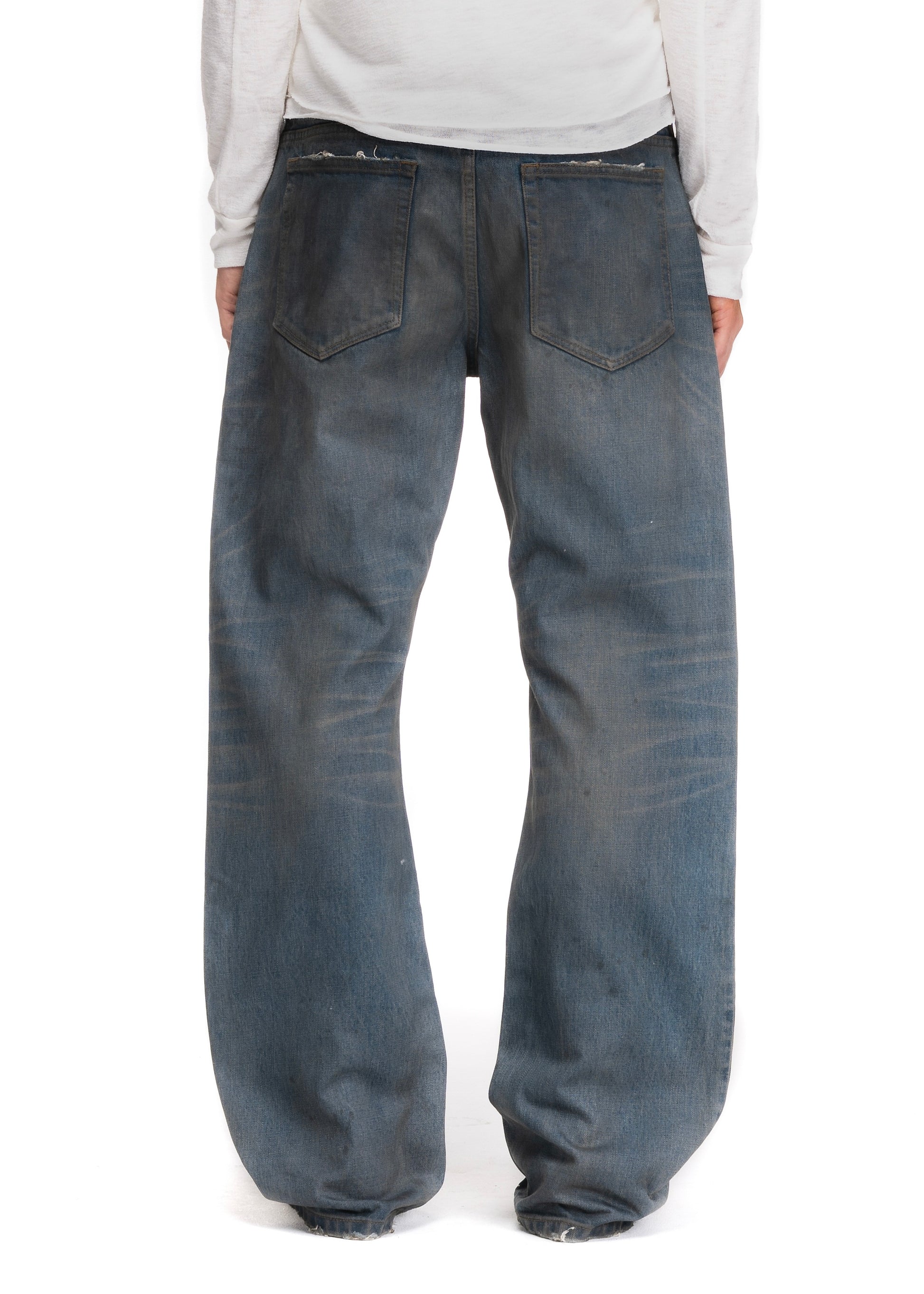 CRAFTED FROM PREMIUM SELVEDGE DENIM IN A VINTAGE BLUE WASH, THIS PAIR FEATURES A BOOTCUT SILHOUETTE WITH SUBTLE FADE MARKS, NATURAL WEAR DETAILS, AND A TIMELESS WORN-IN LOOK.