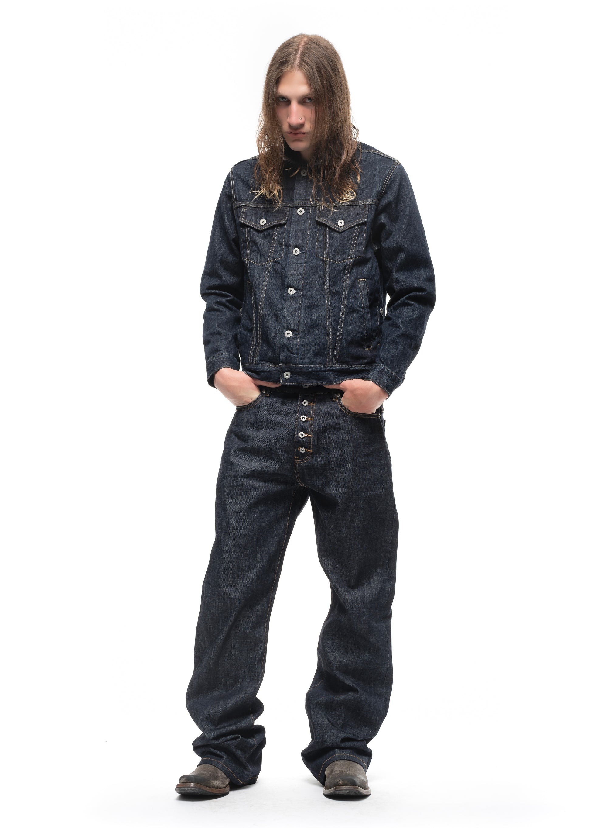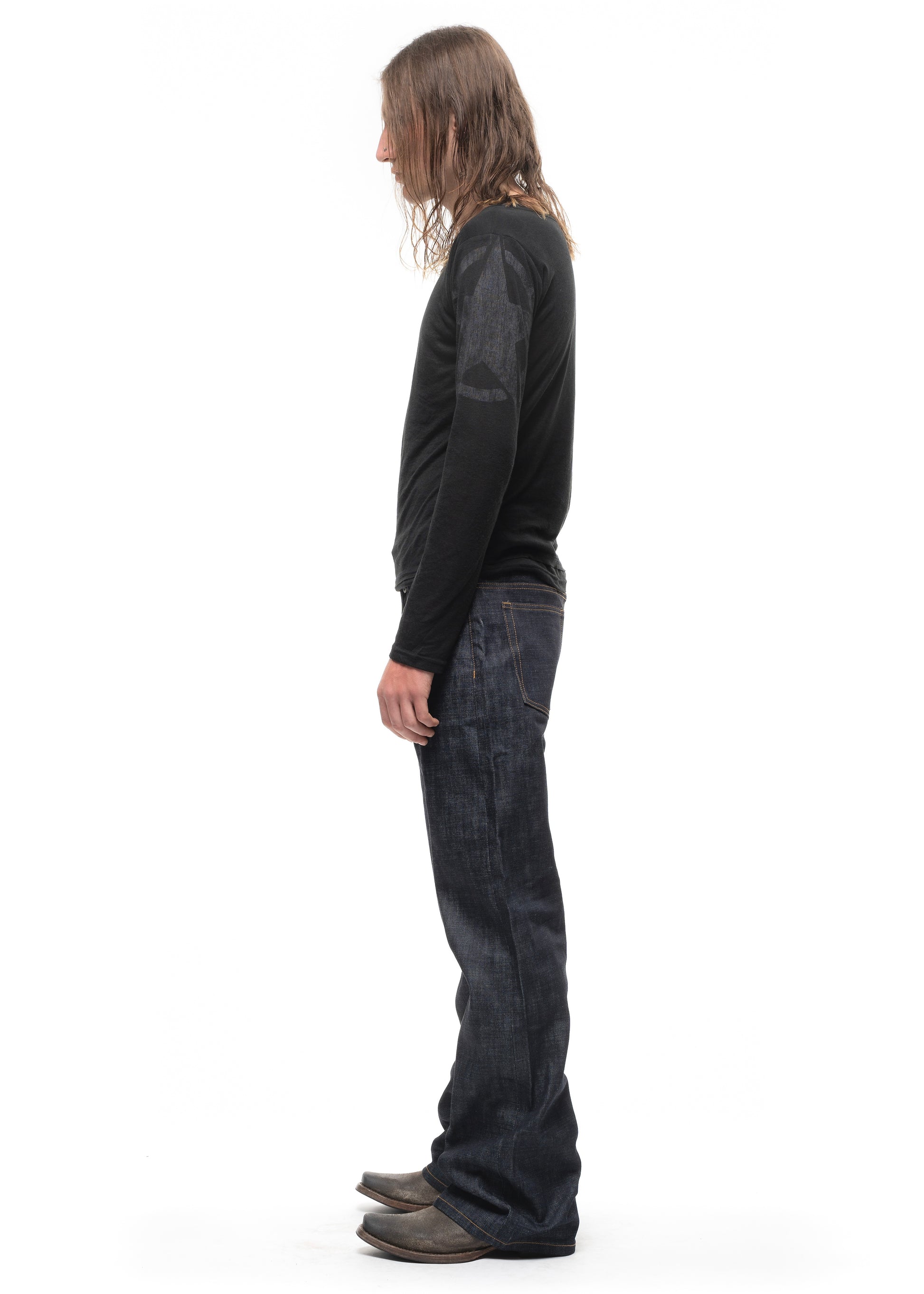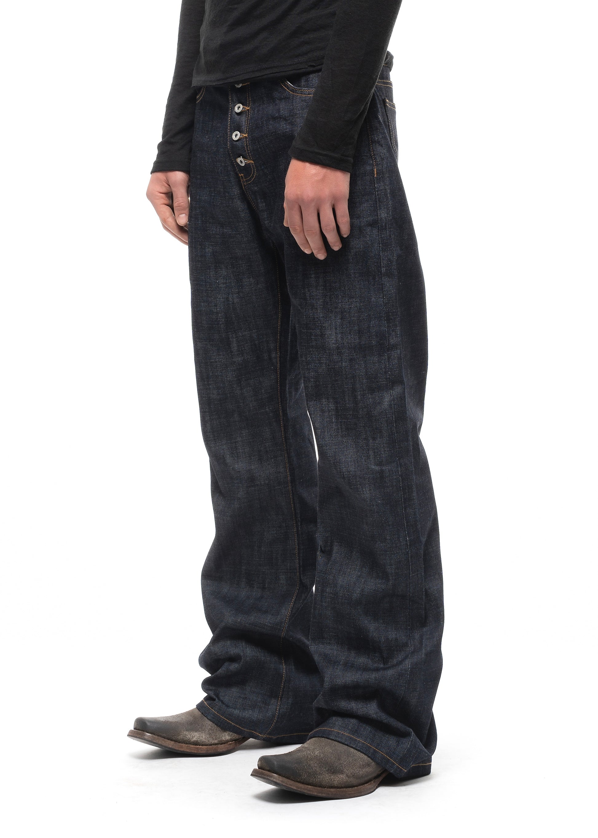 CRAFTED FROM PREMIUM JAPANESE RAW DENIM, THESE SELVEDGE JEANS FEATURE A CLASSIC BOOTCUT FIT WITH A VISIBLE BUTTON FLY, HONORING TRADITIONAL DENIM CRAFTSMANSHIP. THE VISIBLE BUTTON FLY ADDS A TOUCH OF VINTAGE APPEAL, REFLECTING THE ORIGINAL CLOSURE STYLE OF EARLY JEANS.