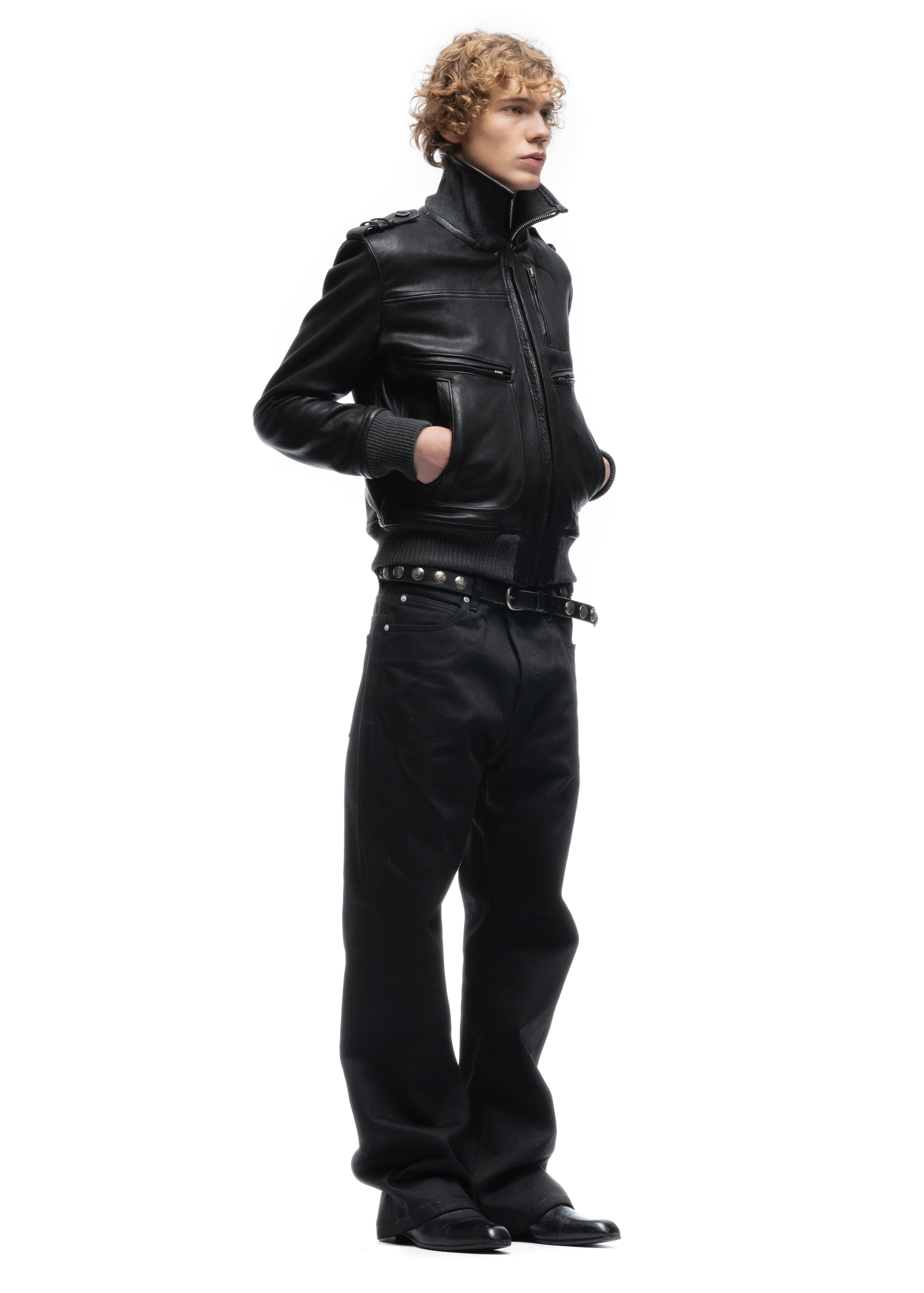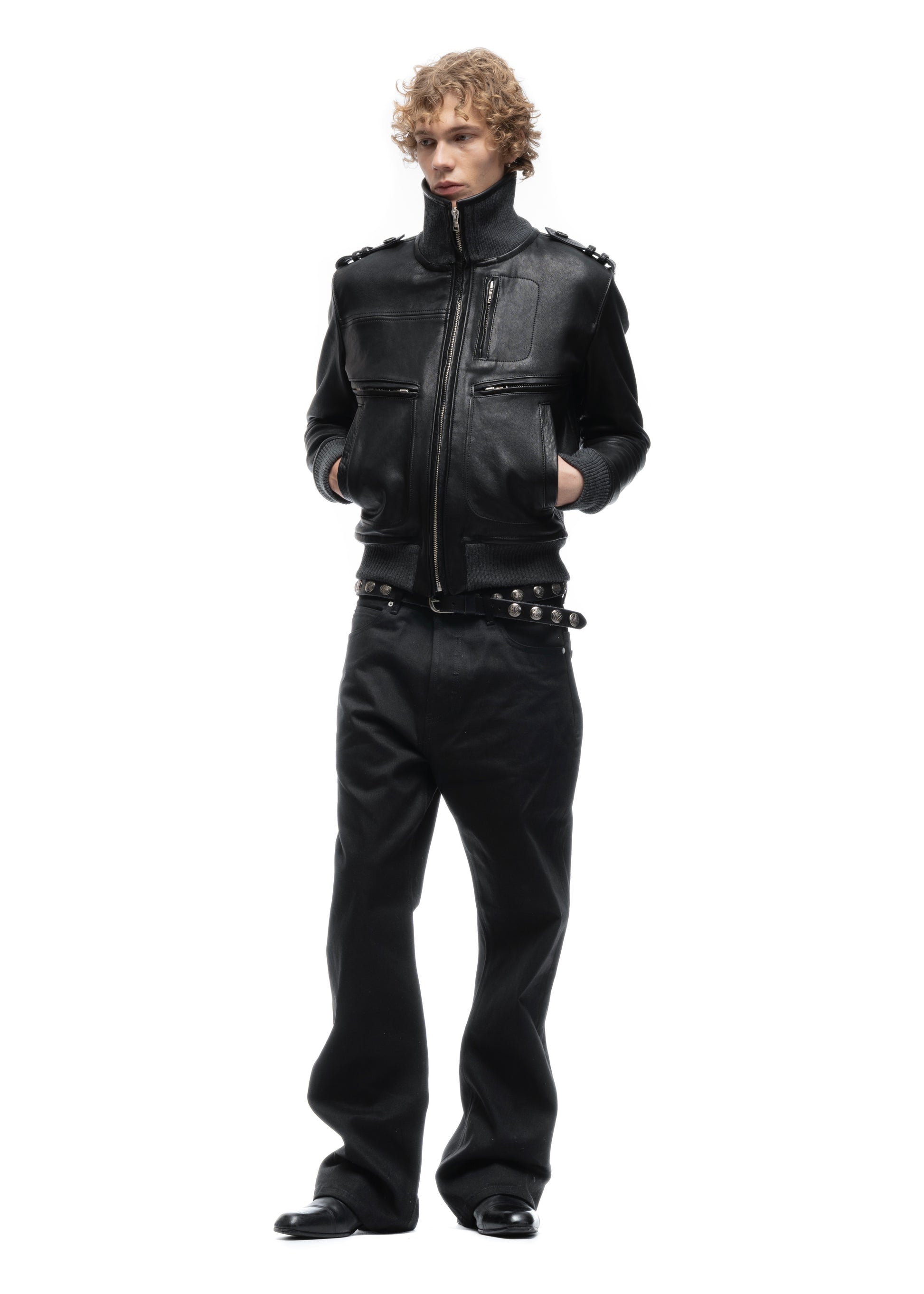 THE SHADOW OPERATOR LEATHER JACKET IS CUT FROM HEAVY, HIGH-QUALITY LEATHER WITH A STRUCTURED FEEL. IT FEATURES A STRAIGHT SILHOUETTE, A HIGH STAND COLLAR, AND MULTIPLE FUNCTIONAL ZIP POCKETS ACROSS THE FRONT. REINFORCED PANELING AND RIBBED HEMS ADD STABILITY AND SHAPE, WHILE THE SHOULDER DETAILS PROVIDE A SUBTLE WORKWEAR EDGE. MADE IN ITALY. THE BLACK VERSION OFFERS A CLEAN, SHARP LOOK.