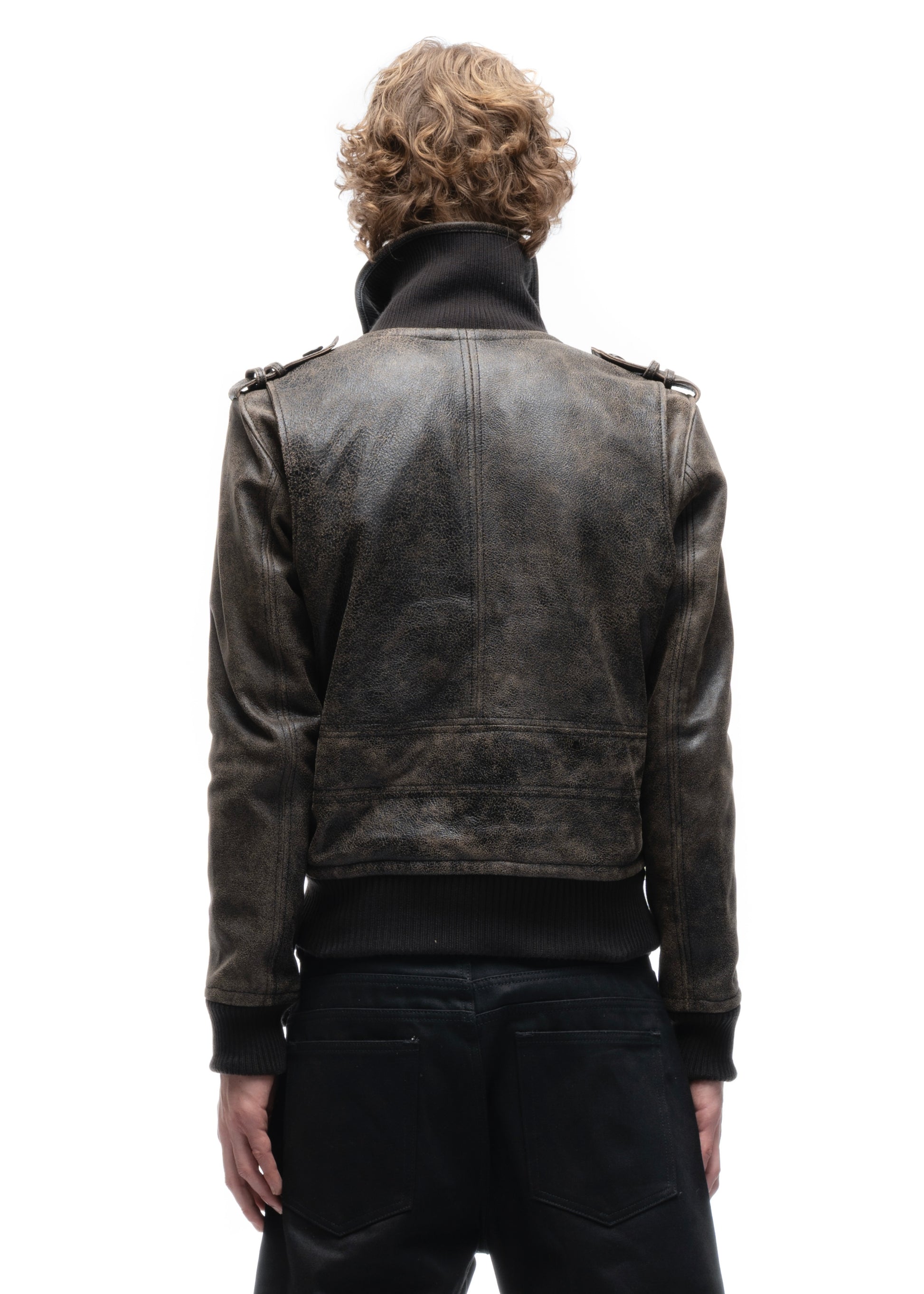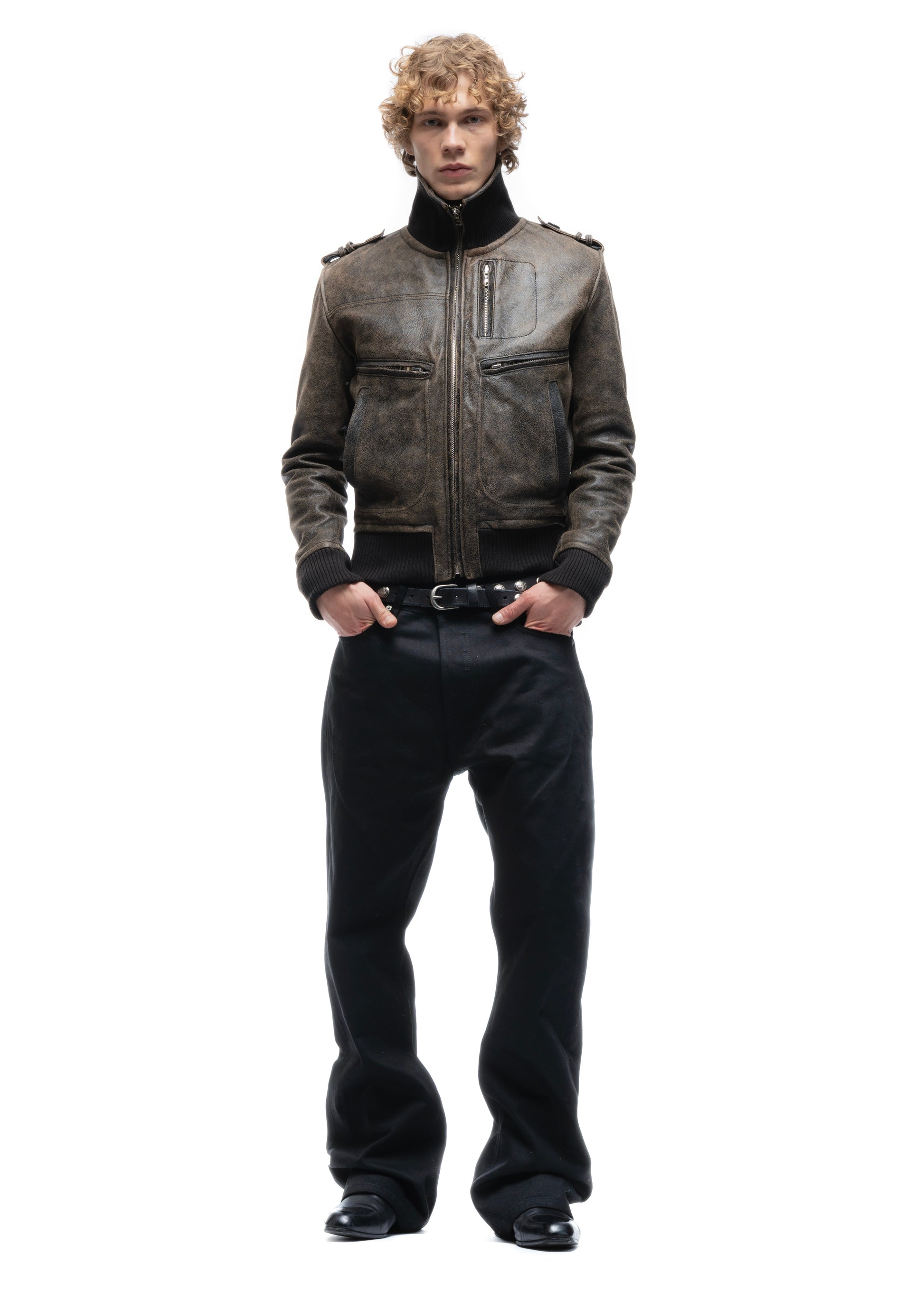 THE SHADOW OPERATOR LEATHER JACKET IS MADE FROM HEAVY, HIGH-QUALITY LEATHER WITH A DISTINCT WORN-IN TEXTURE. IT FEATURES A STRAIGHT SILHOUETTE, A HIGH STAND COLLAR, AND MULTIPLE FUNCTIONAL ZIP POCKETS ACROSS THE FRONT. REINFORCED PANELING AND RIBBED HEMS GIVE THE PIECE STRUCTURE, WHILE THE SHOULDER DETAILS ADD A WORKWEAR-INSPIRED TOUCH. MADE IN ITALY. THE USED VERSION COMES WITH A FADED, AGED FINISH FOR A MORE CHARACTER-DRIVEN LOOK.