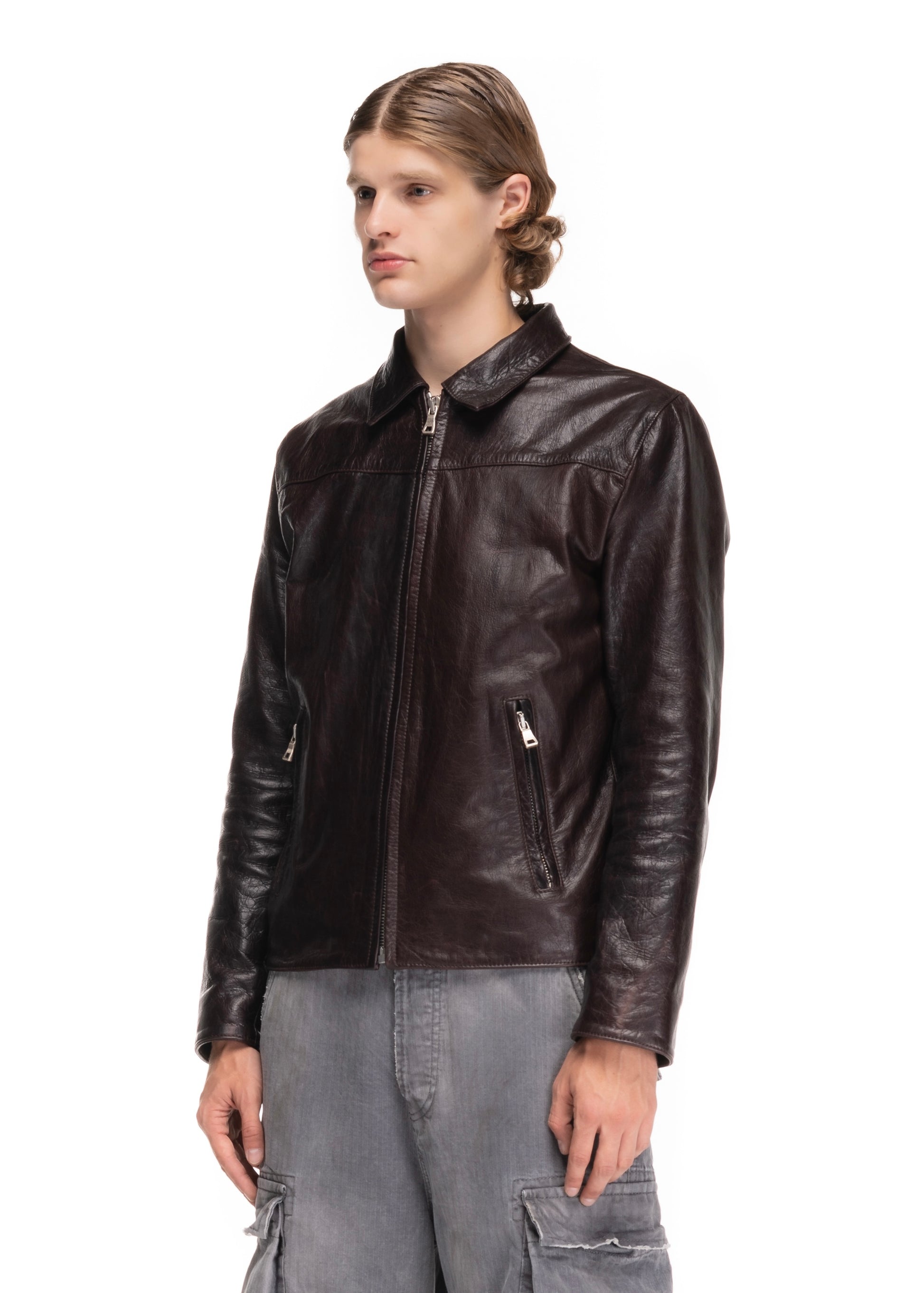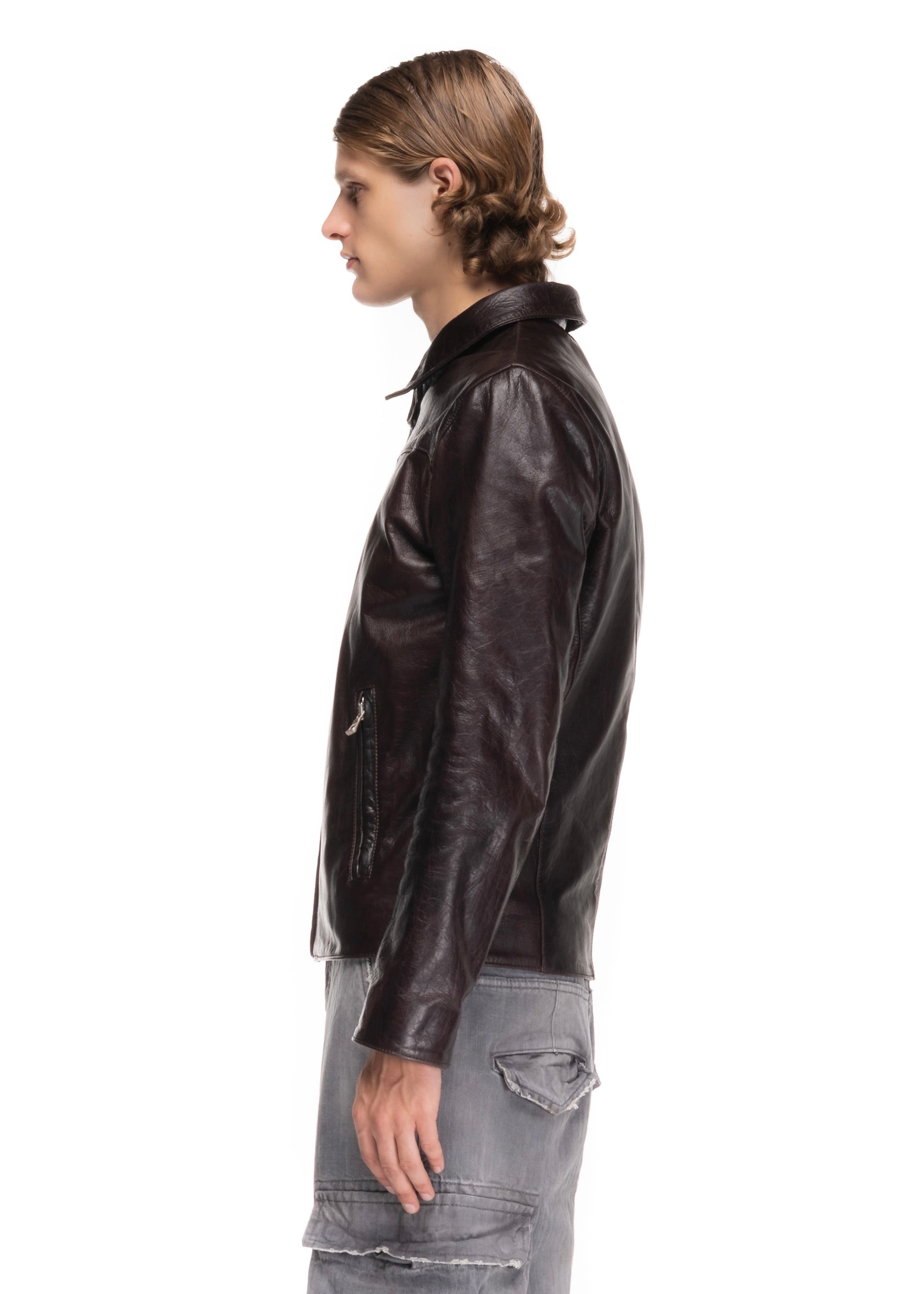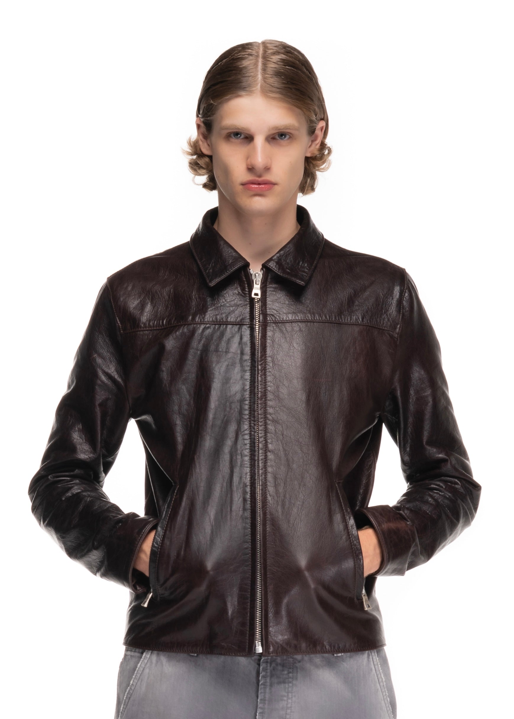 A MINIMAL JACKET CUT FROM SOFT GENUINE LEATHER. DESIGNED WITH A STRAIGHT ZIP CLOSURE, POINTED COLLAR AND FUNCTIONAL SIDE POCKETS. THE DARK BROWN LEATHER FEATURES A DISTINCT PATINA THAT DEVELOPS CHARACTER OVER TIME.