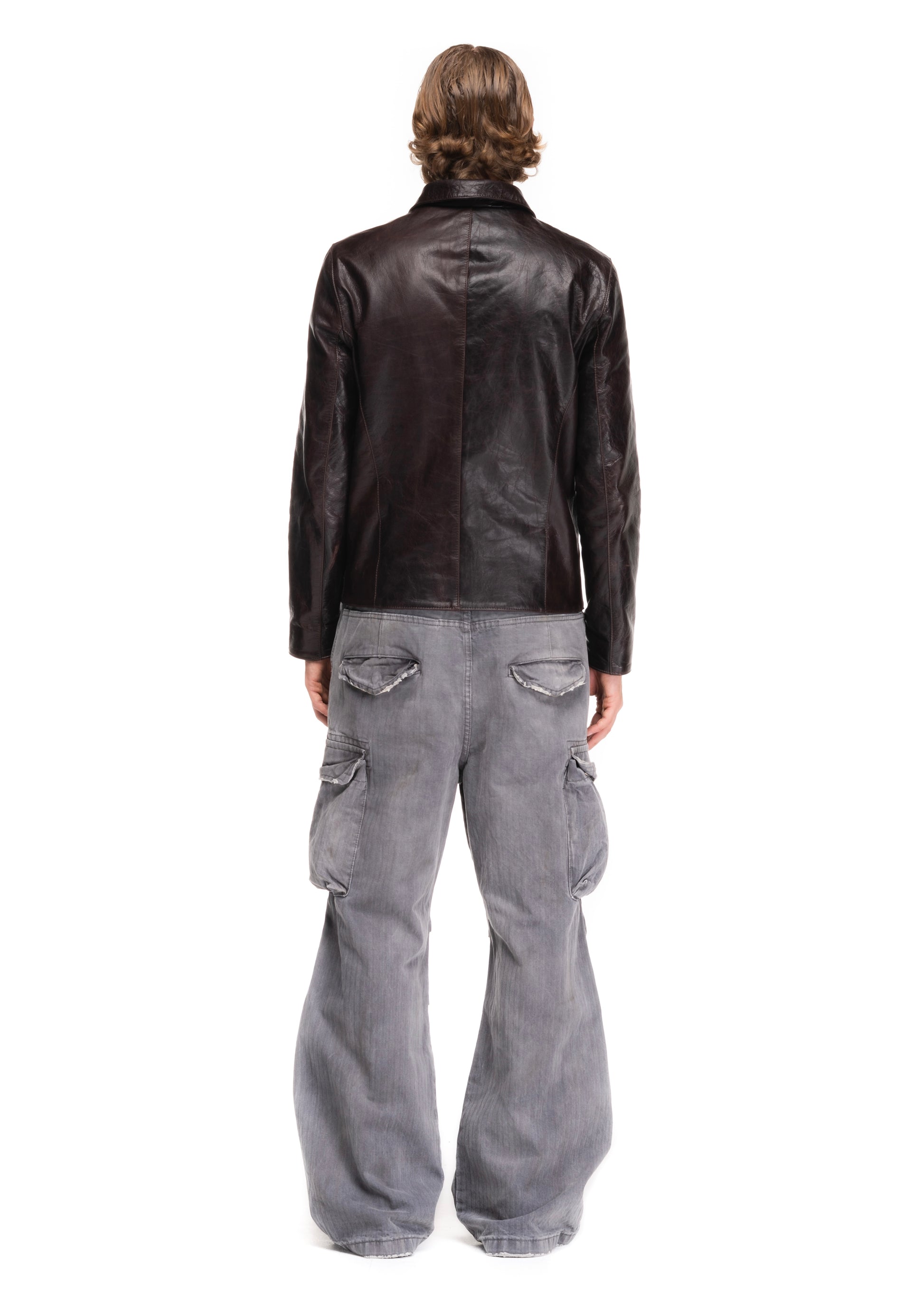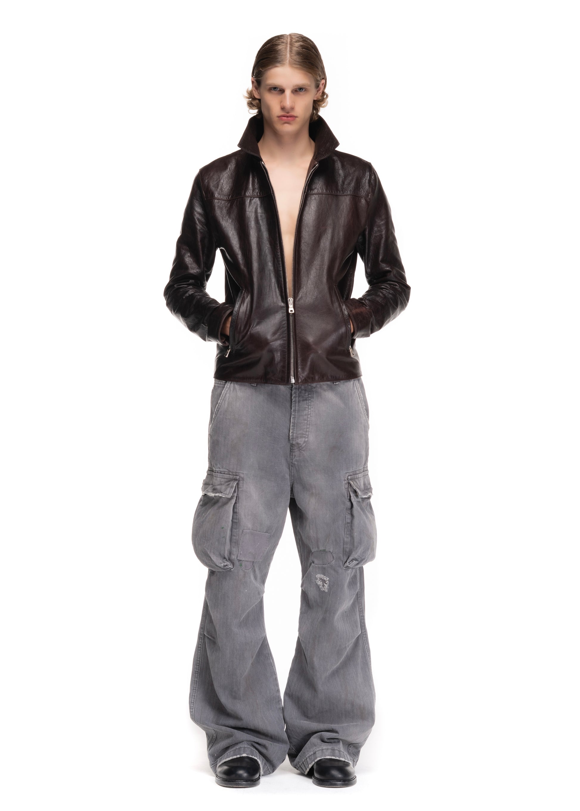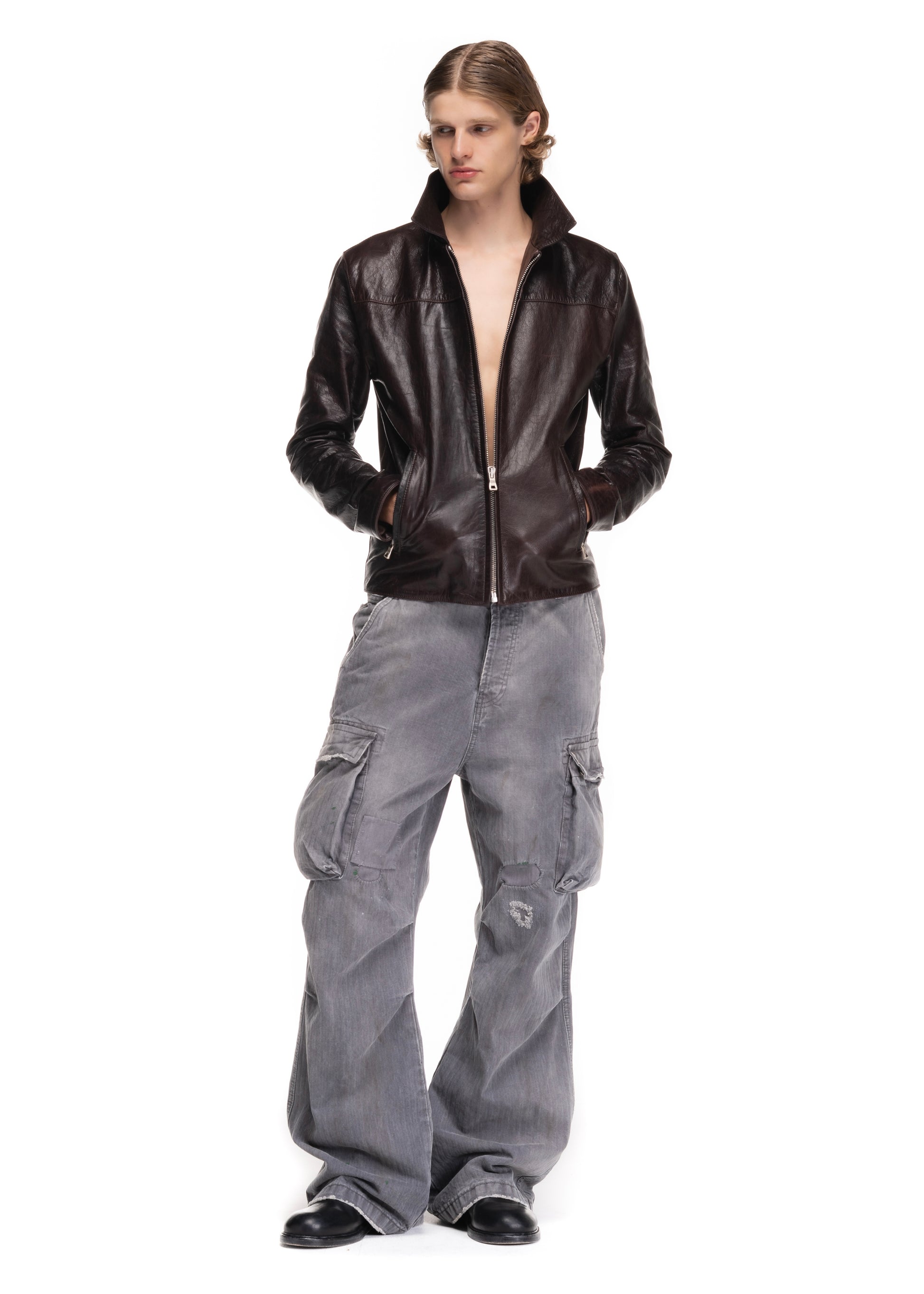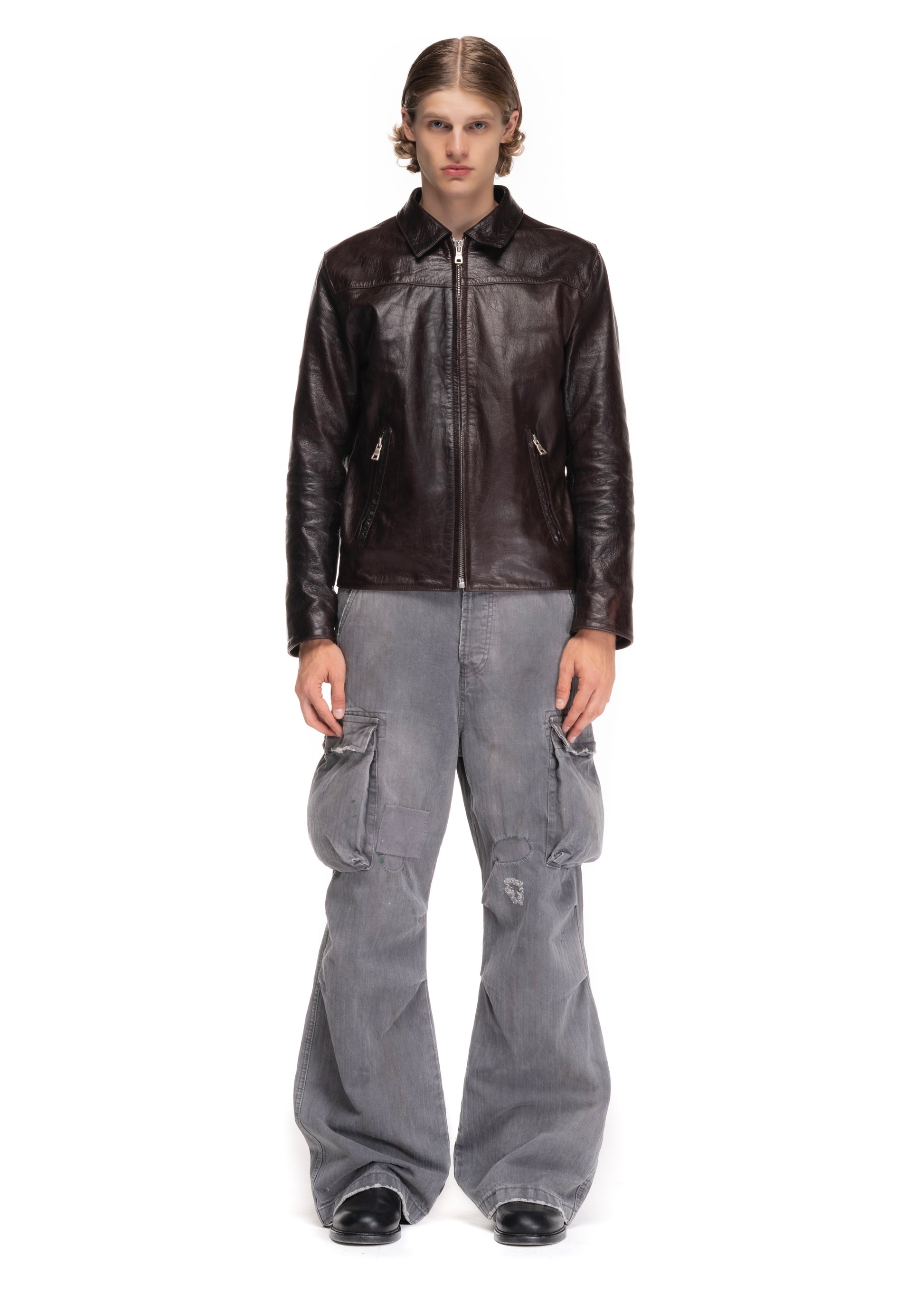 A MINIMAL JACKET CUT FROM SOFT GENUINE LEATHER. DESIGNED WITH A STRAIGHT ZIP CLOSURE, POINTED COLLAR AND FUNCTIONAL SIDE POCKETS. THE DARK BROWN LEATHER FEATURES A DISTINCT PATINA THAT DEVELOPS CHARACTER OVER TIME.