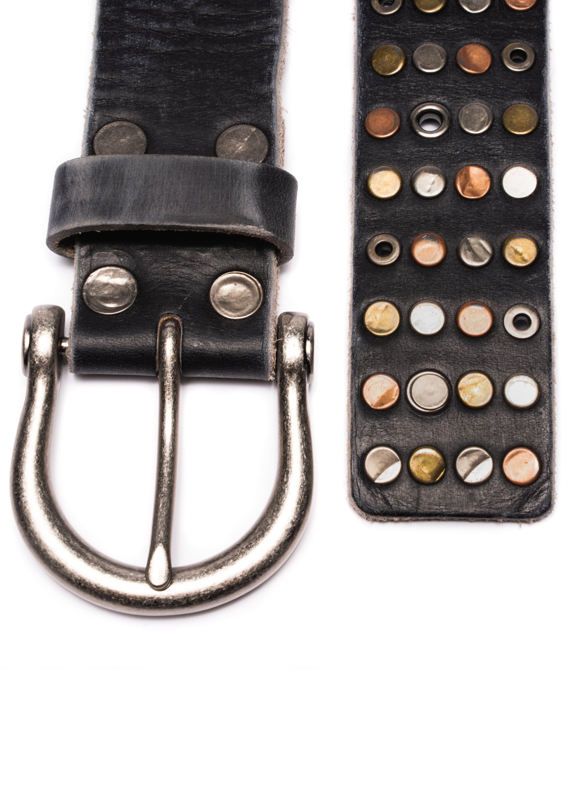 CRAFTED FROM PREMIUM COW LEATHER IN A USED-BLACK FINISH WITH A SMOOTH, LIGHTLY WORN SURFACE, THE BELT IS DETAILED WITH ROWS OF SOFT-GOLD, MUTED BRONZE, AND WASHED-SILVER STUDS. IT COMES WITH A DARKENED METAL BUCKLE AND A METAL TIP, GIVING THE PIECE A GROUNDED, INDUSTRIAL PRESENCE.