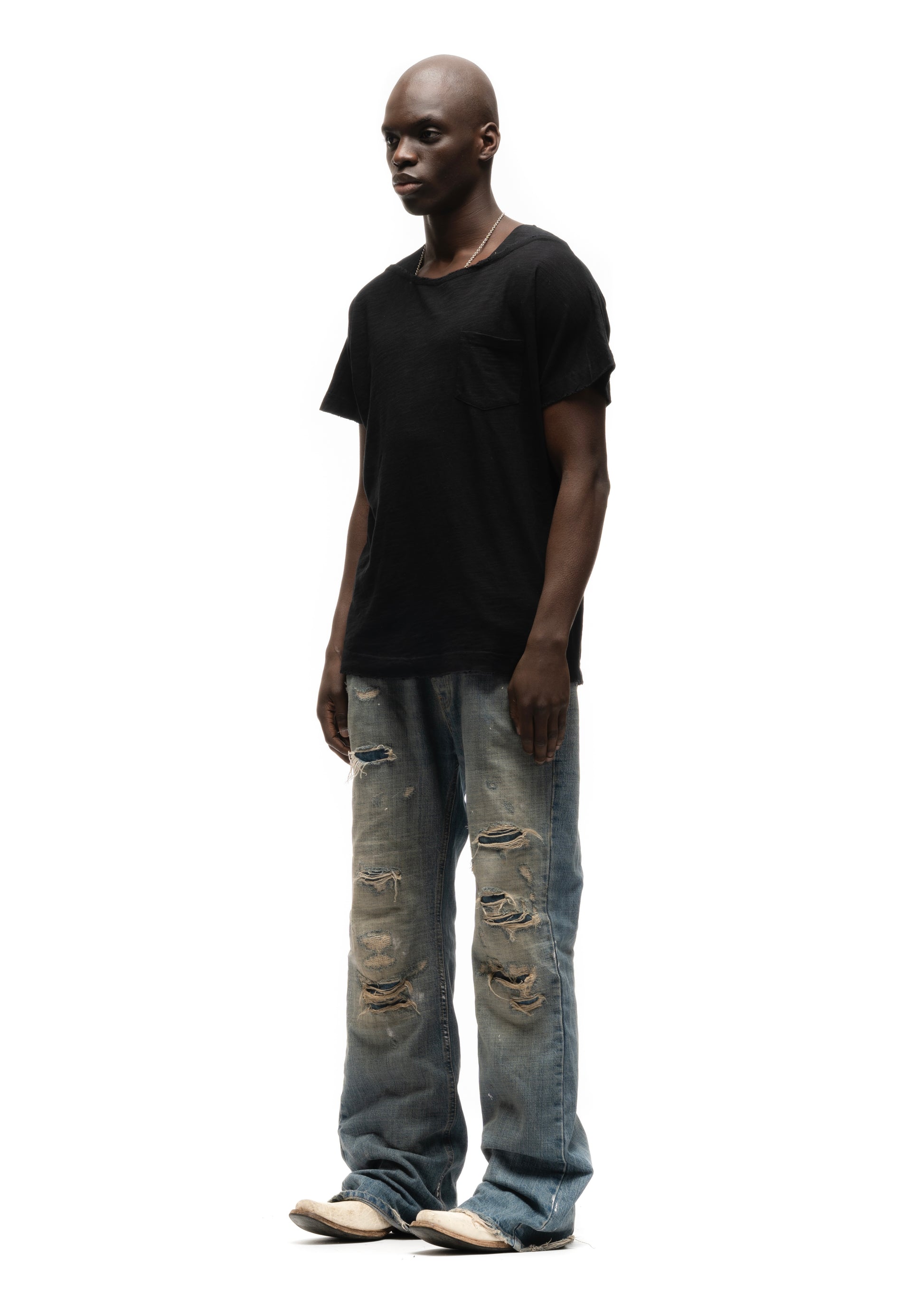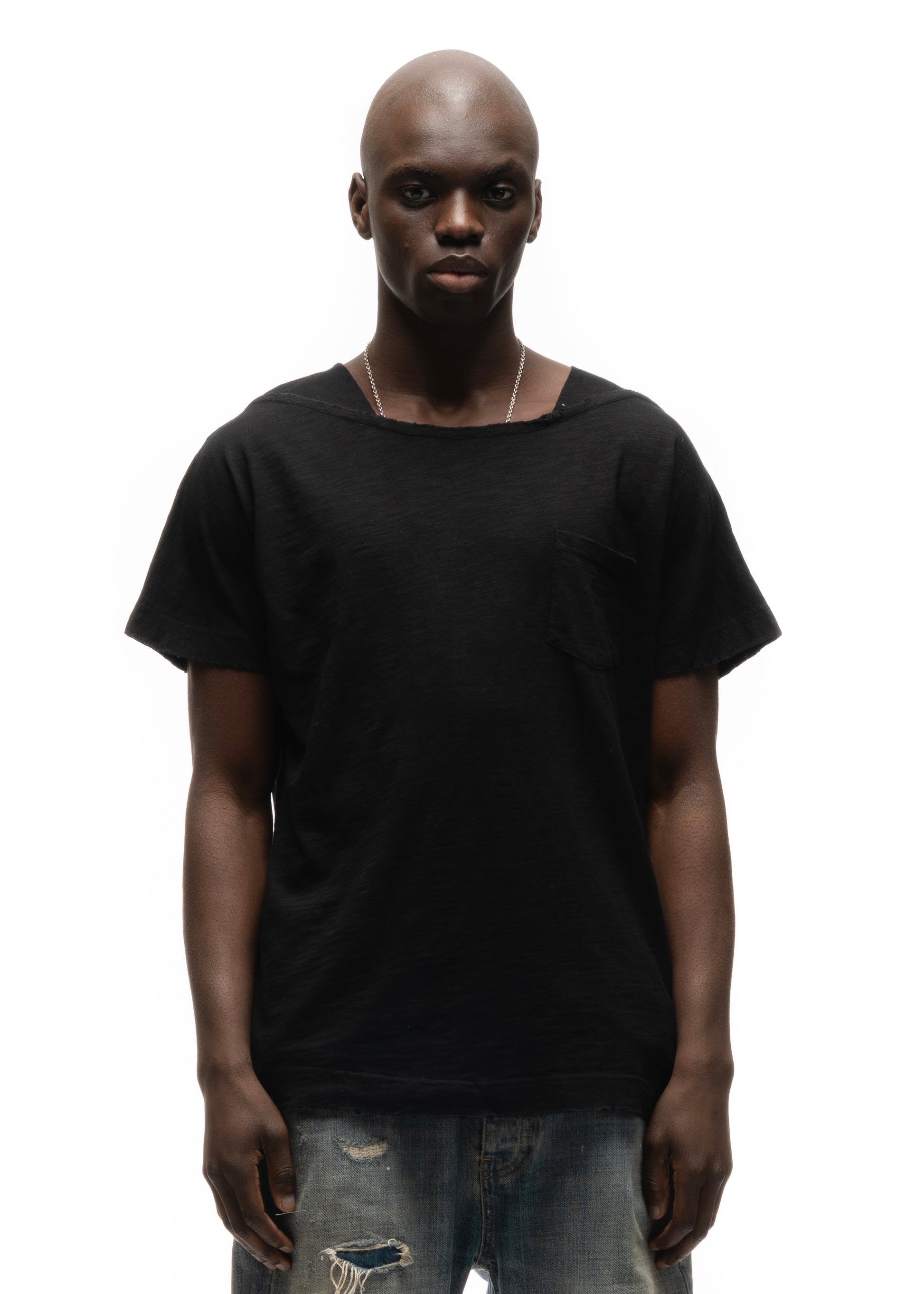 THE TRAPEZOID T-SHIRT IN BLACK USES A LIGHTWEIGHT, TEXTURED FABRIC WITH A SUBTLE DRY FEEL. THE RELAXED SHOULDERS AND TAPERED LOWER LINE DEFINE THE TRAPEZOID CUT, WHILE THE SMALL FRONT POCKET AND CLEAN NECKLINE KEEP THE LOOK MINIMAL. A RELIABLE, EASY DAILY PIECE WITH A SLIGHTLY AGED CHARACTER.