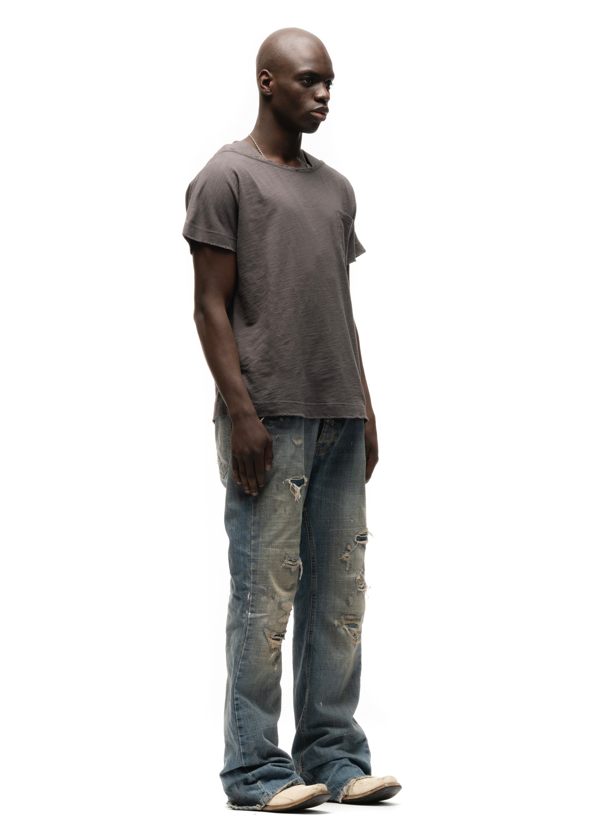 THE TRAPEZOID T-SHIRT IN GREY IS MADE FROM A LIGHTWEIGHT, TEXTURED FABRIC WITH A DRY HAND FEEL. THE WIDE, RELAXED SHOULDER LINE AND SLIGHTLY TAPERED HEM CREATE THE SIGNATURE TRAPEZOID SHAPE. FINISHED WITH A SMALL FRONT POCKET AND A CLEAN NECKLINE, IT WORKS AS AN EASY EVERYDAY PIECE WITH A SUBTLE WORN-IN LOOK.