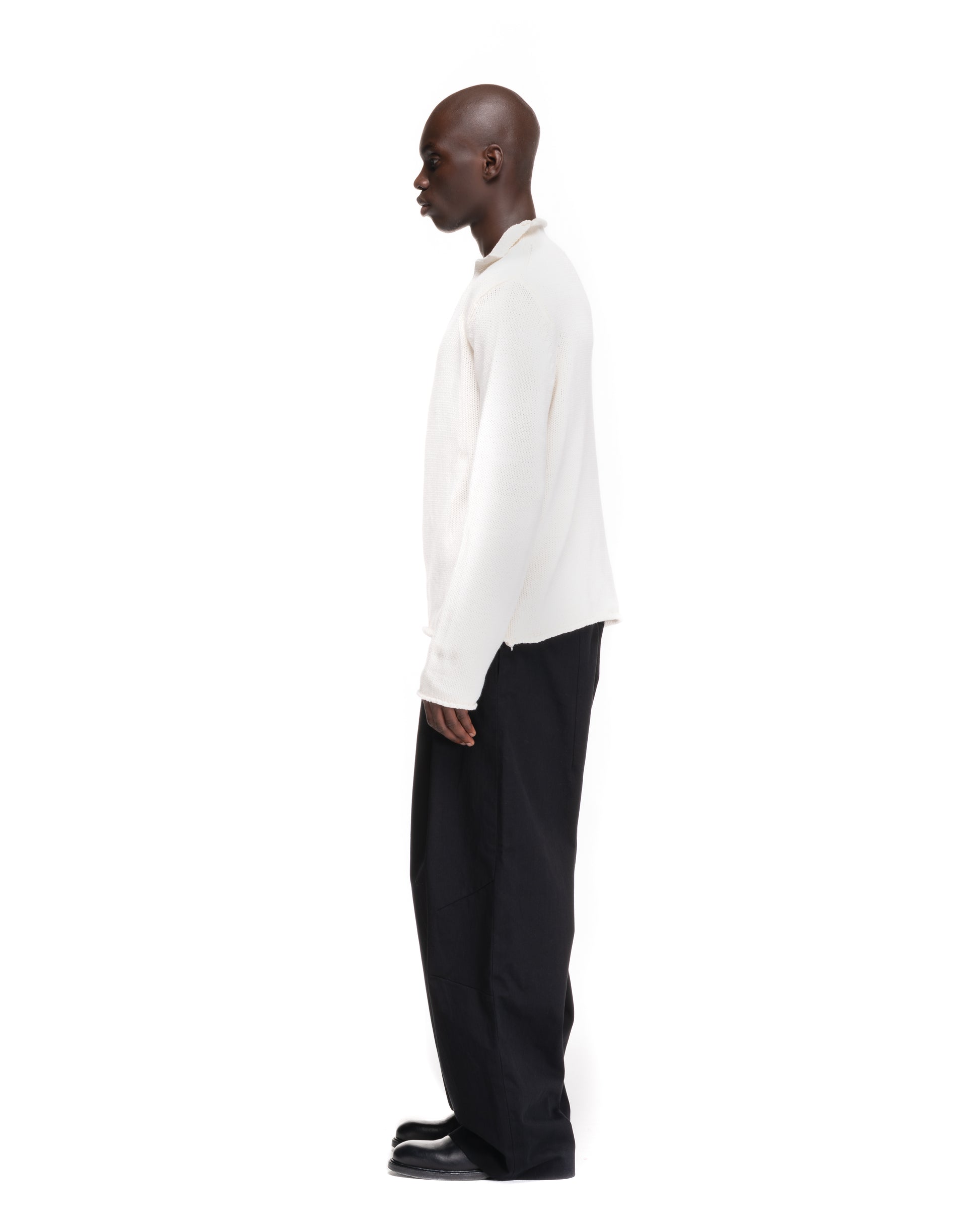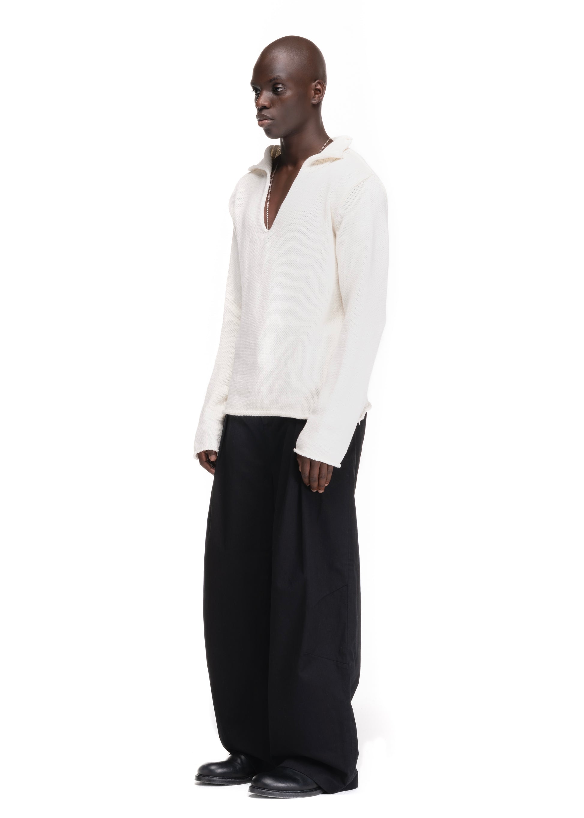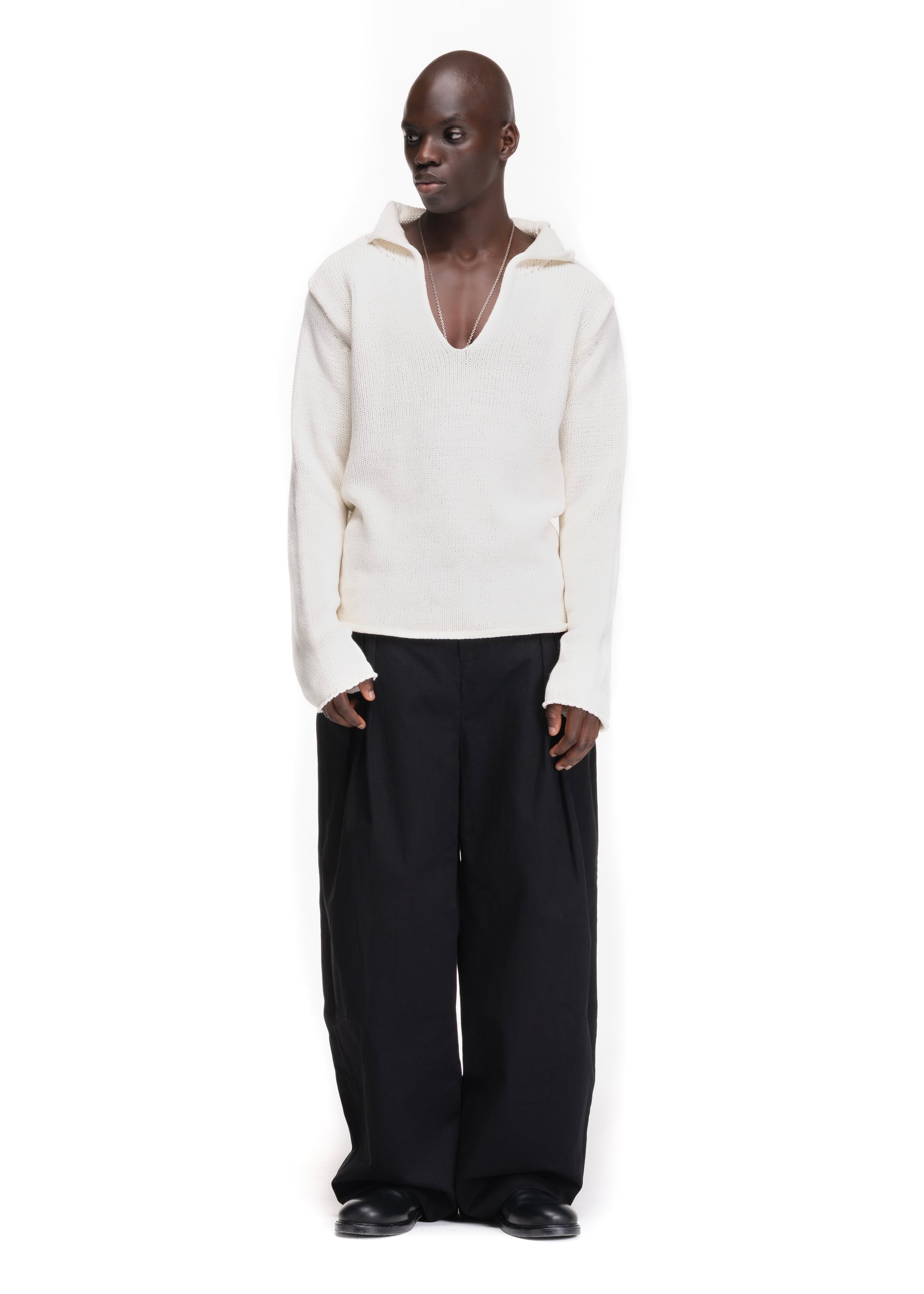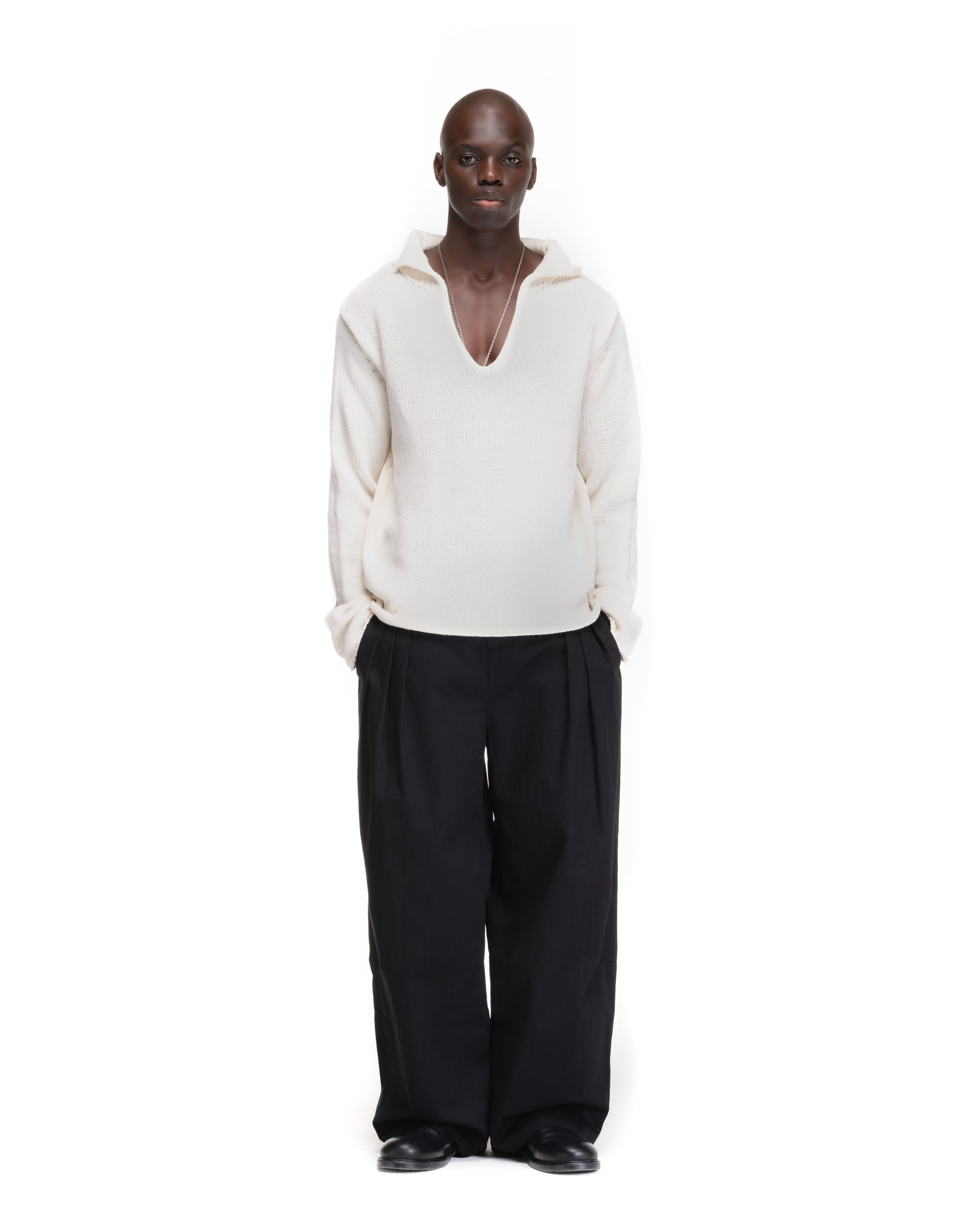 KNIT SWEATER IN WHITE. RELAXED FIT WITH A V COLLAR AND OPEN NECKLINE. SOFT TEXTURE WITH A CASUAL DRAPE. CLEAN DESIGN THAT WORKS LAYERED OR ON ITS OWN. STRAIGHTFORWARD AND FUNCTIONAL LOOK FOR EVERYDAY WEAR.